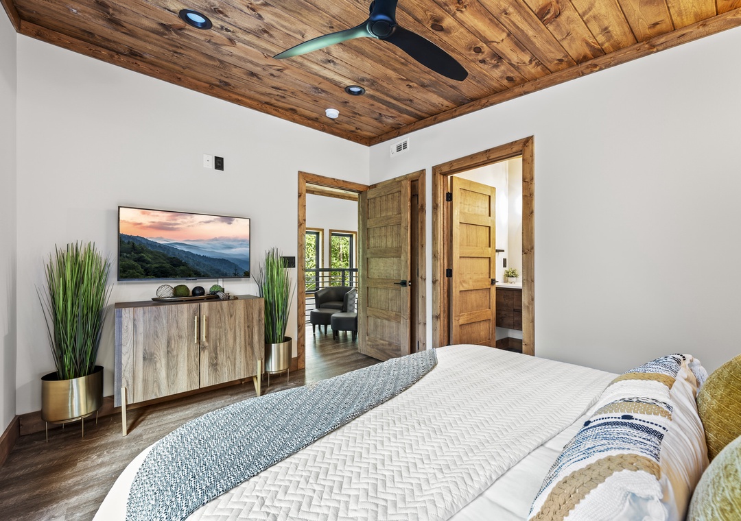 ✔ Bedroom #1(Main Level): Spacious bedroom with a King-sized bed and large flat-screen TV; Attached full bathroom with stand-up shower