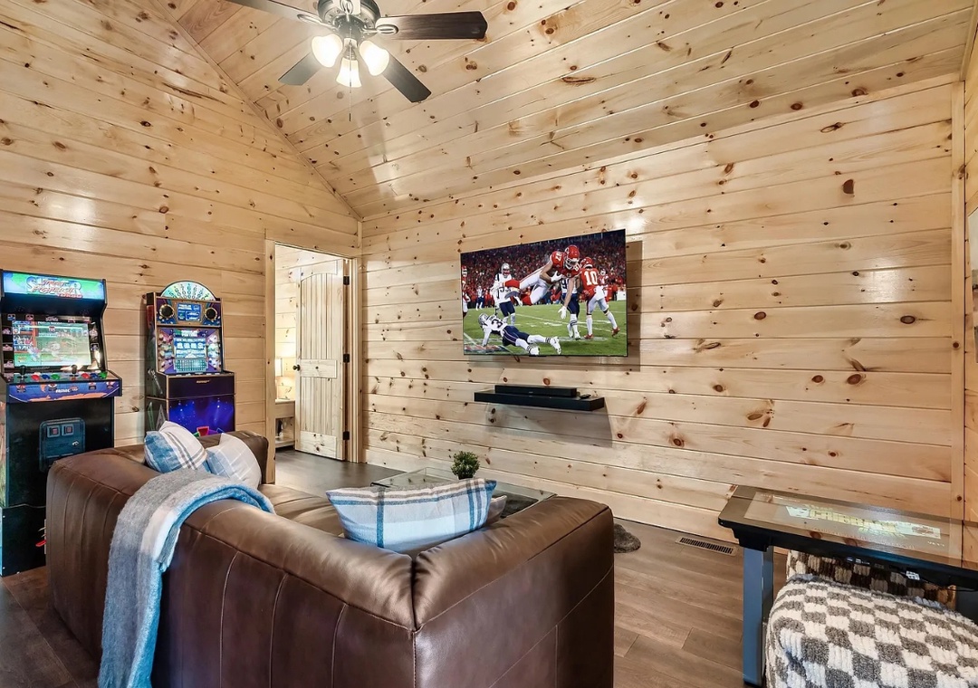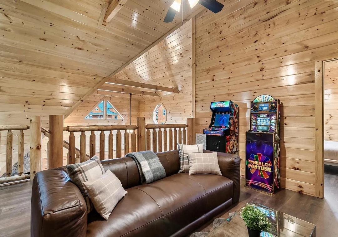 Lykke Lodge is packed with entertainment options to keep everyone engaged, no matter their age. The loft media room serves as a cozy hub for movie nights, while the arcade games and Infinity Table provide endless fun. Outside on the side deck, the bubbling hot tub offers the perfect way to unwind beneath the stars, while the indoor heated pool ensures year-round fun relaxation. Whether you're challenging friends to a game, enjoying a quiet evening by the fire, or exploring nearby Pigeon Forge attractions, there’s something for everyone to enjoy.