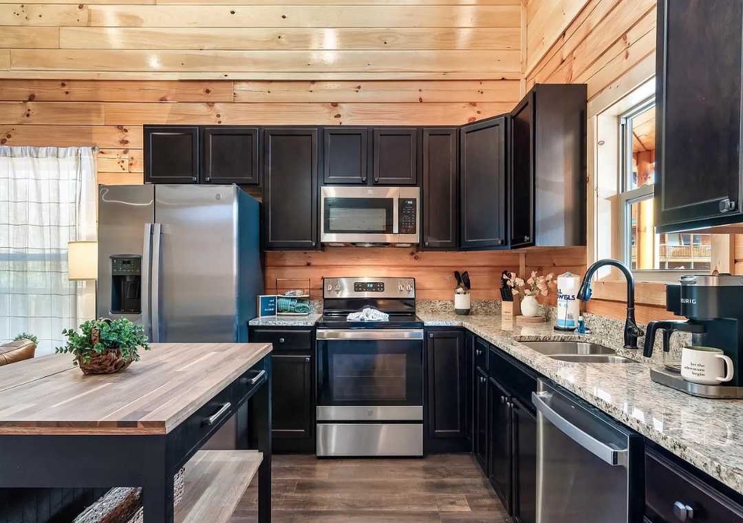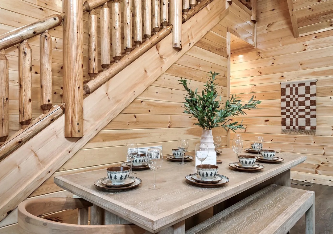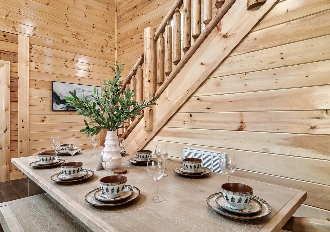 The fully equipped kitchen is a dream for home chefs and food lovers alike. Complete with a full-sized refrigerator, dishwasher, stove, microwave, and other kitchen appliances perfect for making breakfast, lunch, or dinner throughout your stay! All pots, pans, glasses, plates, silverware, etc. are also there for you! Savor your creations at the wooden dining tables while gazing out at the serene outdoors.
