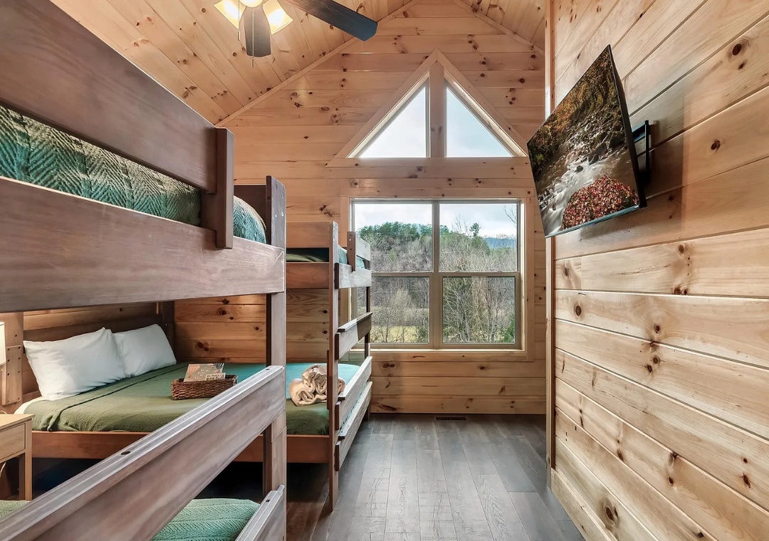 ✔ Bedroom #4 Upper Level): Inviting bedroom with 2 Queen-over-Queen Bunk Beds, Flat-screen TV, and Attached Full Bathroom with Stand Up Shower