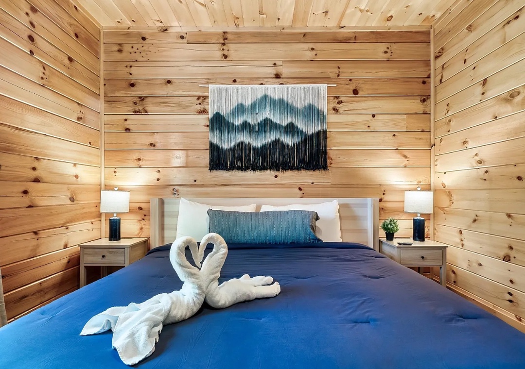 ✔ Bedroom #2 (Main Level): Cozy bedroom with a King-size bed, Flat-screen TV, and Attached Full Bathroom with Shower/Tub Combo
