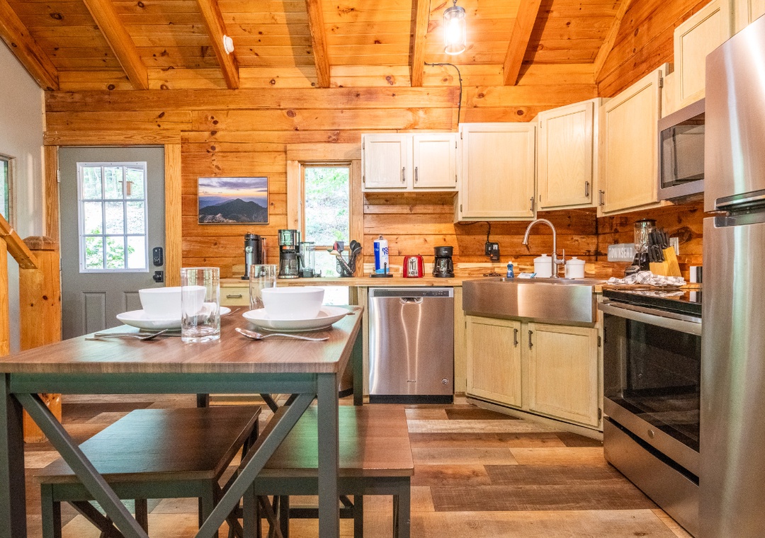 "Manna" welcomes you with a warm, inviting indoor space designed to be both comfortable and serene. Step inside and you'll find the living room bathed in natural light from large windows that frame a picturesque view of the nearby creek. A propane fireplace takes center stage, creating an inviting atmosphere that’s ideal for chilly mountain nights. Adjacent to the living room, the fully equipped kitchen awaits, providing everything you need for home-cooked meals. A small nook extends from the living room, offering a charming, sunlit space with wraparound windows that look out onto the creek. This area is perfect for morning coffee or an intimate evening with a glass of wine, offering a private corner to soak up the natural scenery while staying cozy indoors. Free WiFi is also available throughout the property.