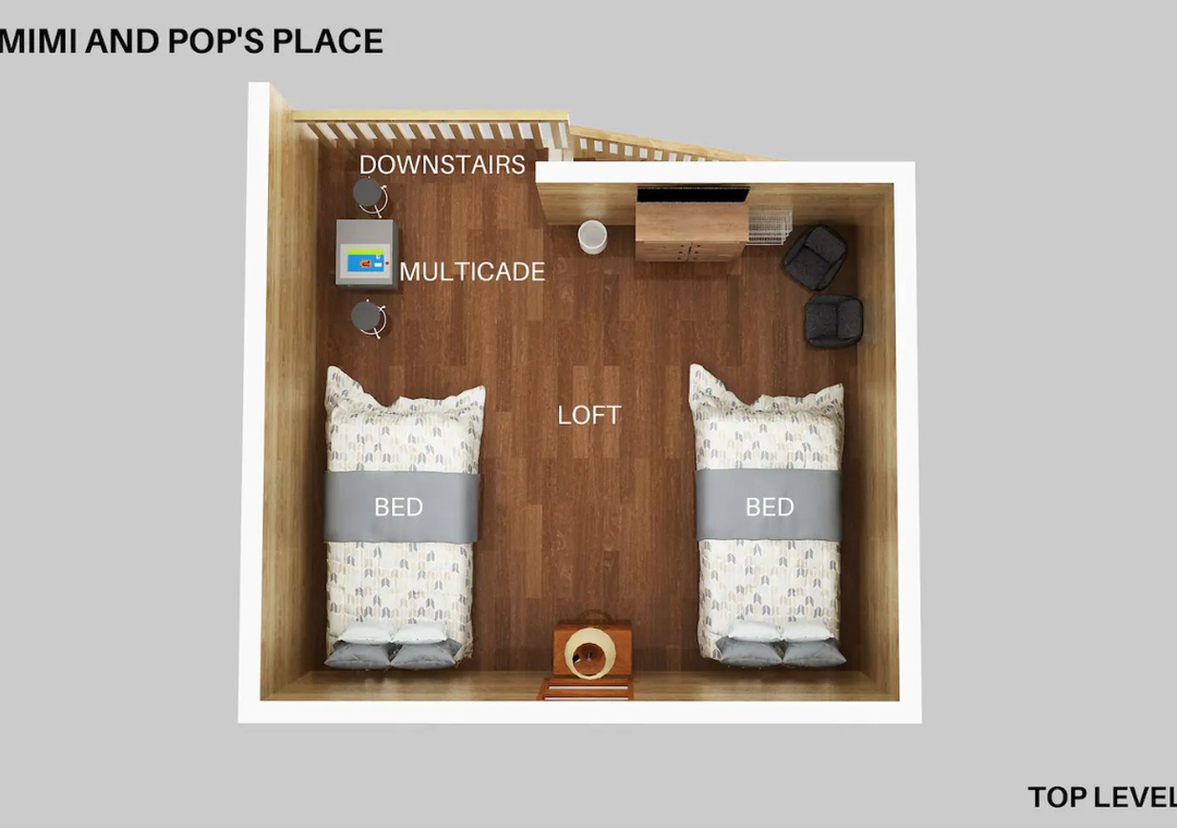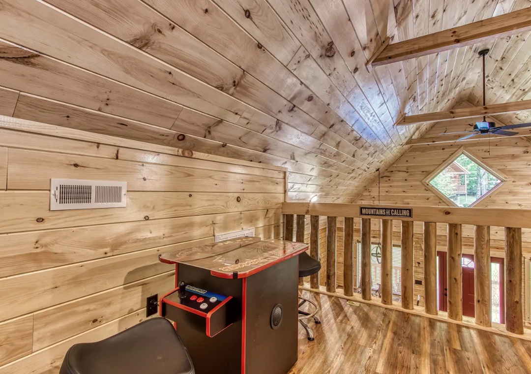 You will never feel cramped here at Mimi and Pops. The master bedroom is spacious and greets you with a plush king-size bed and large TV, where total relaxation awaits. The master bathroom has a modern walk-in shower and satisfies your needs. You can pack light, because the bathroom contains towels and starter soaps, shampoos, toilet paper, and other bathroom essentials. The second story loft is partially open to the living room and greets your guests with two twin beds, along with an arcade game that will provide hours of entertainment for kiddos and adults alike!