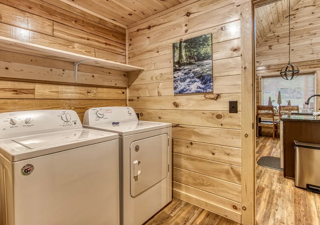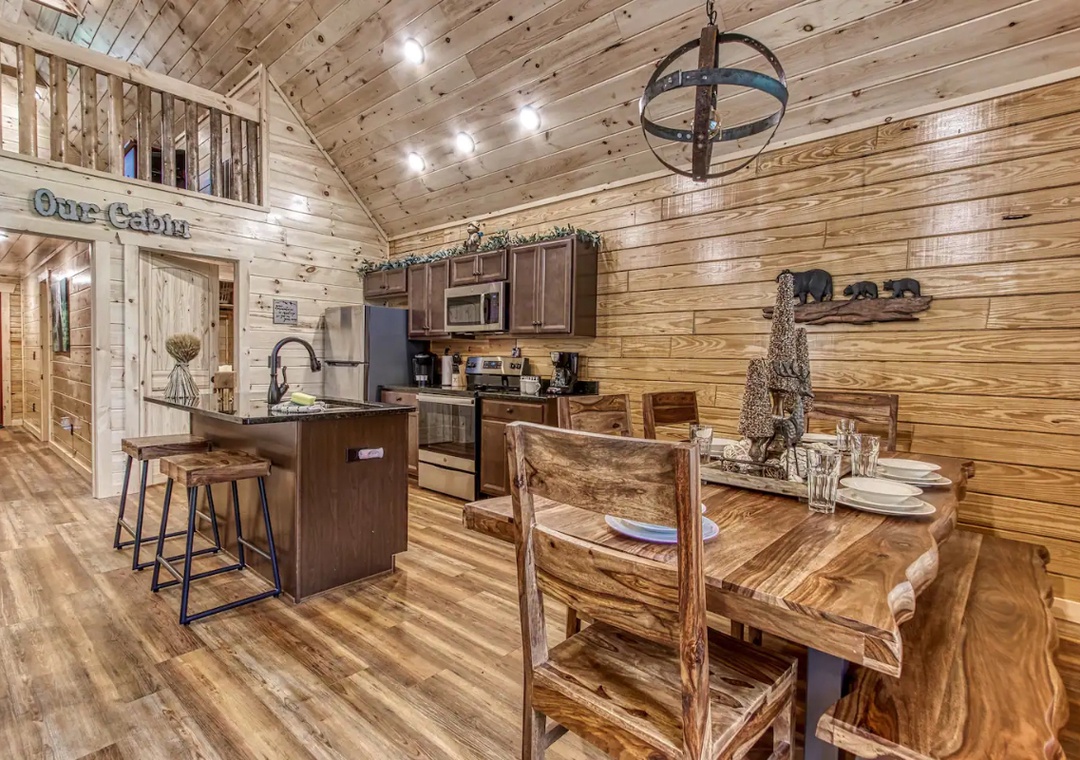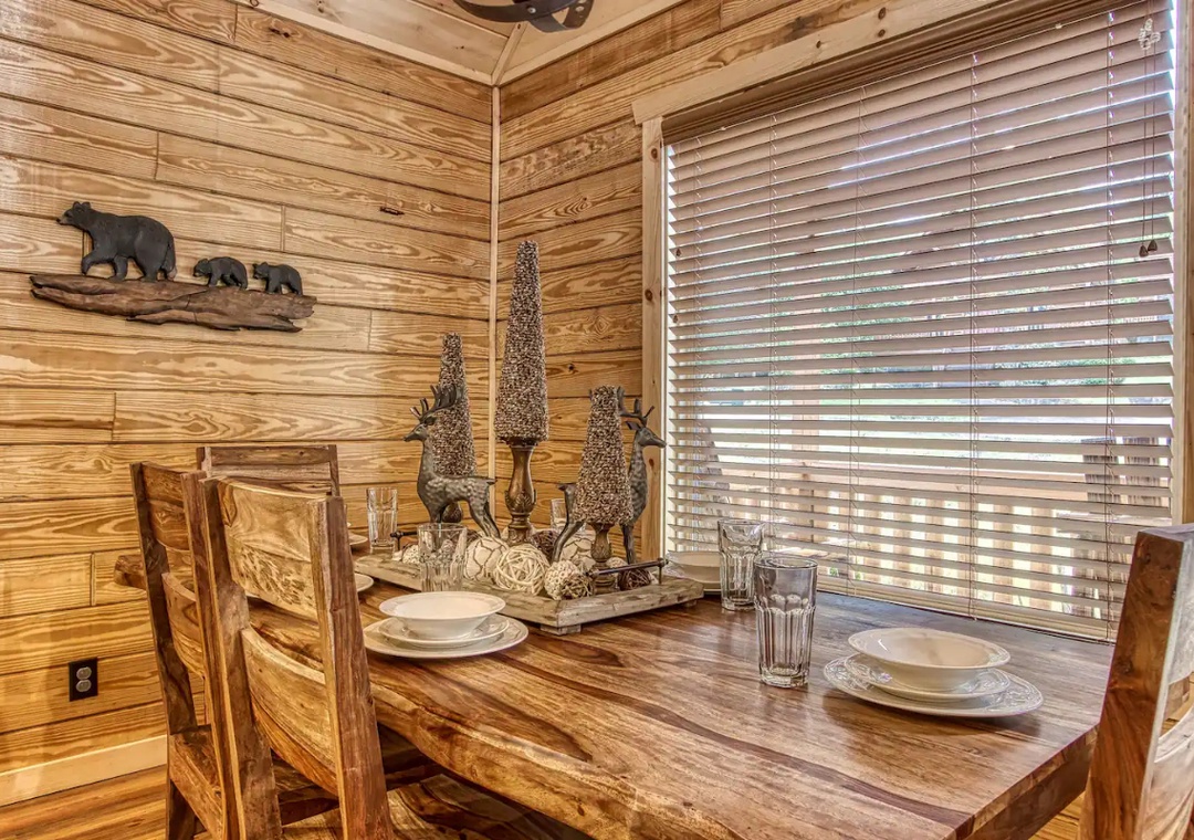 Meals are an important aspect of every vacation, and while the area offers a multitude of restaurants for every culinary craving, if you never want to leave the house to eat, you certainly dont have to. Mimi and Pops offers a modern, fully equipped kitchen complete with everything you need to prepare your own farm-to-table meal, including a standard size refrigerator, oven, stove, toaster, pots, pans, and cutleries. With an open design, stainless steel appliances, and eat-up bar, theres plenty of space to whip up a meal and enjoy it right here in the comfort of your own cabin. The cabin-chic dining area is situated right off the kitchen area, with seating large enough to gather and enjoy your meals comfortably. The community has shared outdoor gas grills, so feel free to use those at any time if you want to grill up a good meal.
