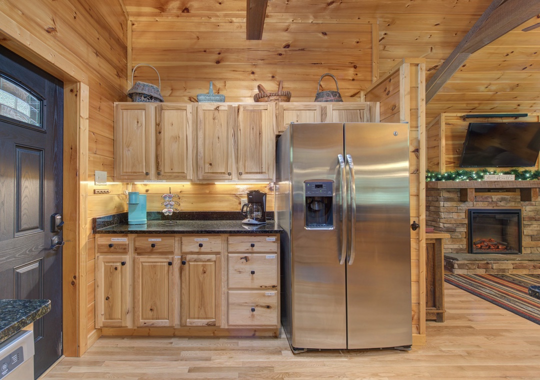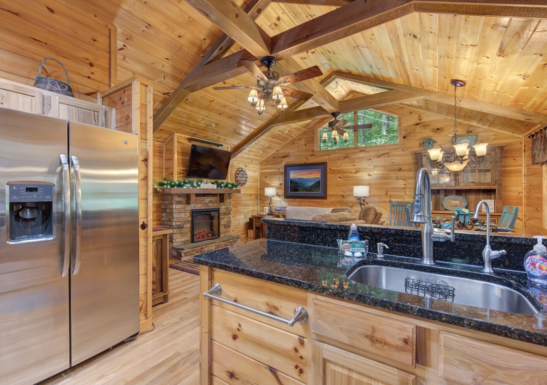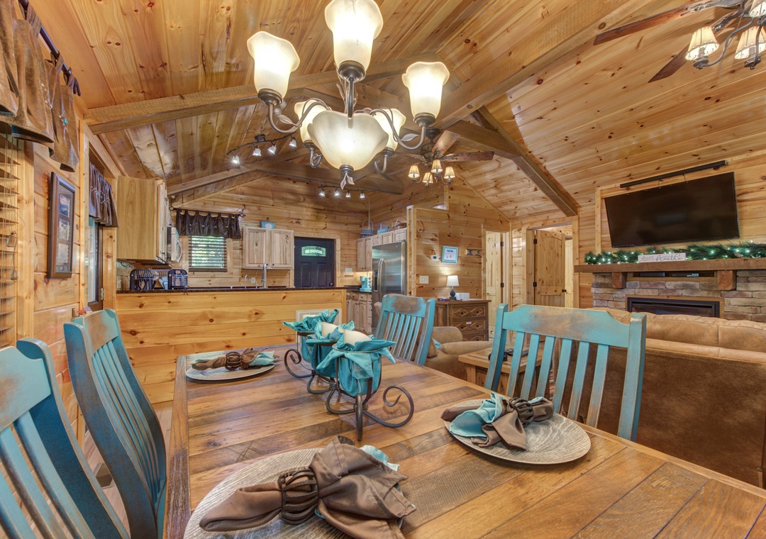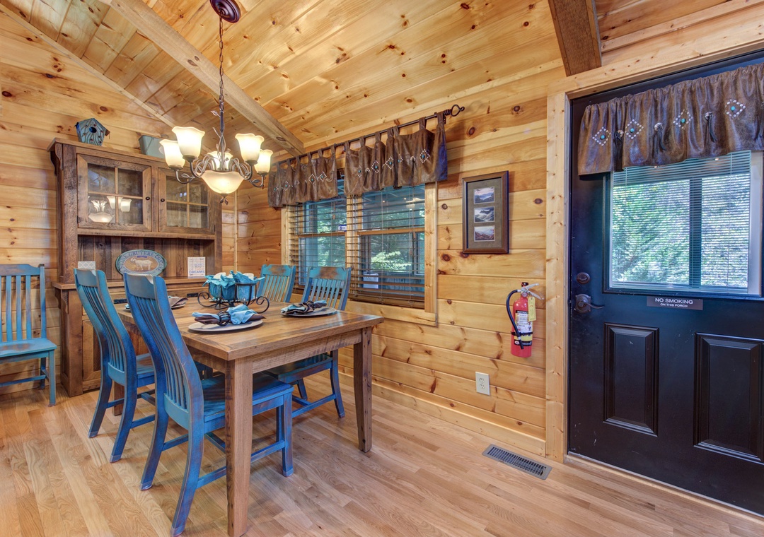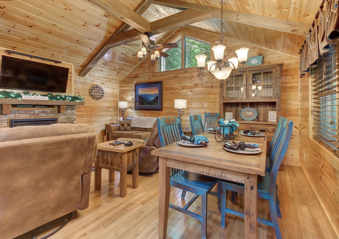 As you step inside, you are greeted by the inviting warmth of the living room. The centerpiece of this cozy space is the electric fireplace, which casts a gentle glow, creating an ambiance that beckons you to unwind. Plush furnishings offer a comfortable spot to relax, whether you're curling up with a good book, watching your favorite shows on the flat-screen TV, or enjoying intimate conversations. The cabin's open layout ensures a seamless flow from the living area to the well-appointed kitchen. Here, you’ll find all the essentials needed to prepare delightful meals, from modern appliances to ample counter space. The dining area, adjacent to the kitchen, provides a charming setting for enjoying your culinary creations, with windows that frame stunning views of the surrounding wilderness. Free Wifi is also available throughout the property.