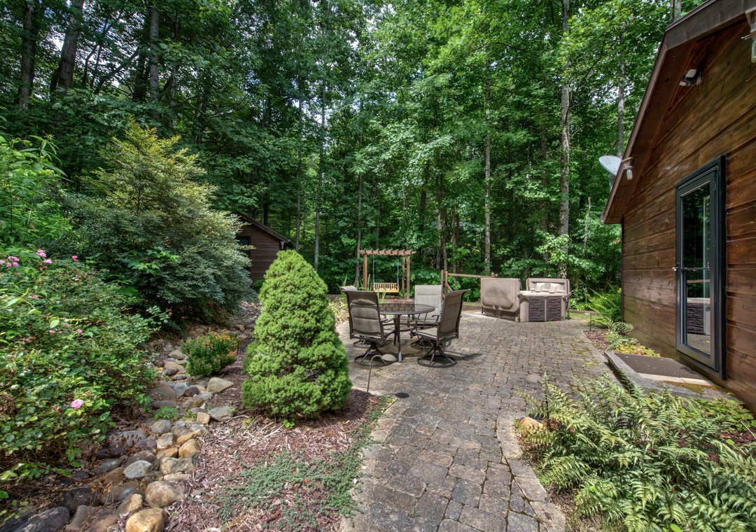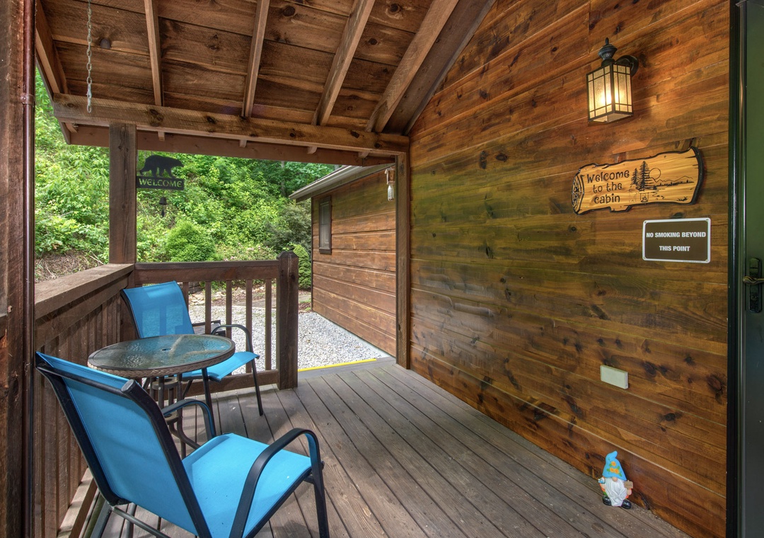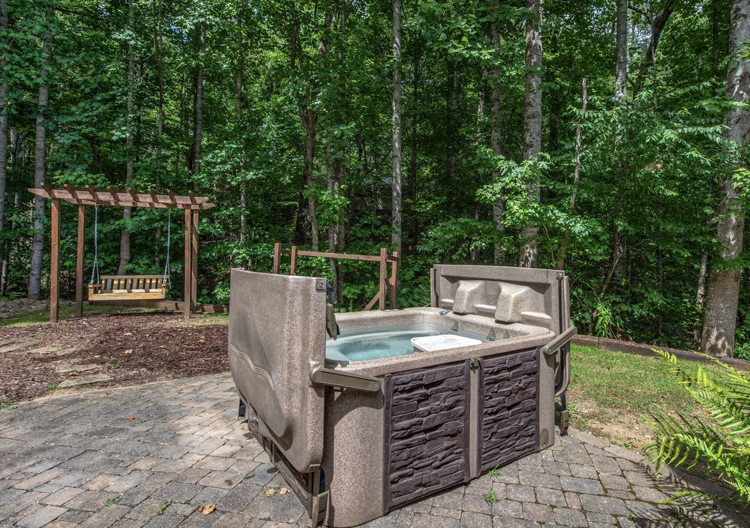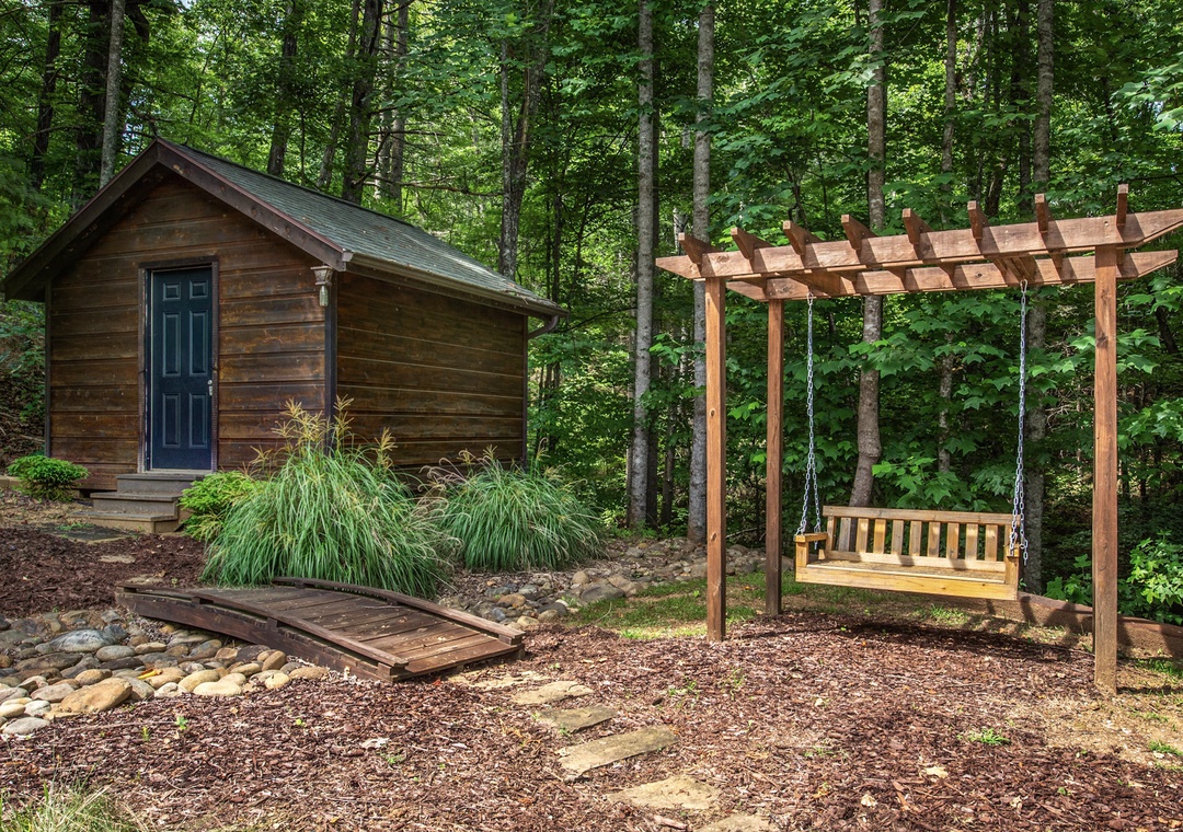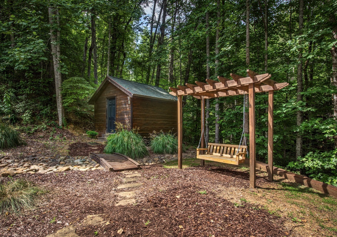 Step onto the front deck and you’ll find a park-style grill on the left, perfect for outdoor cooking and dining. Imagine grilling up a delicious meal while soaking in the relaxing views, creating the perfect start to your entertaining evening. Inside, the living room beckons with its cozy atmosphere, enhanced by an electric fireplace that adds a warm and inviting glow. Here, you can immerse yourself in a selection of board games, perfect for family fun or a competitive night in with friends. The comfortable seating area provides the ideal spot to relax, play games, or watch your favorite movies and shows. Just outside, adventure and relaxation await. On the left side of the property, a wood firepit invites you to gather around for an evening of storytelling and marshmallow toasting under the stars. Nearby, a private hot tub offers a luxurious way to unwind after a day of exploration. Let the bubbling water melt away your stress as you take in the natural beauty surrounding you. The pergola with a swing provides a picturesque spot to sit and enjoy the serene mountain environment. Whether you’re sipping your morning coffee or winding down in the evening, the gentle sway of the swing adds to the cabin’s charming allure.