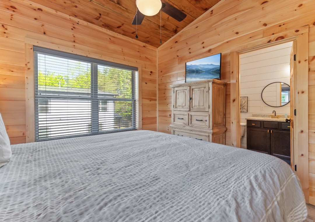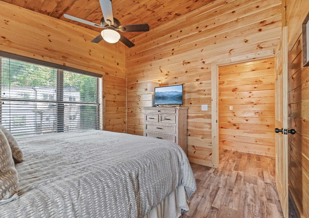 ✔ Bedroom #3 (Upper Level): Cozy Bedroom with a King-sized Bed and Flat-screen TV; Attached Full Bathroom with Stand Up Shower
