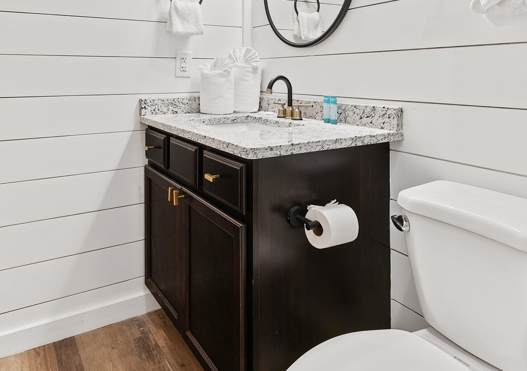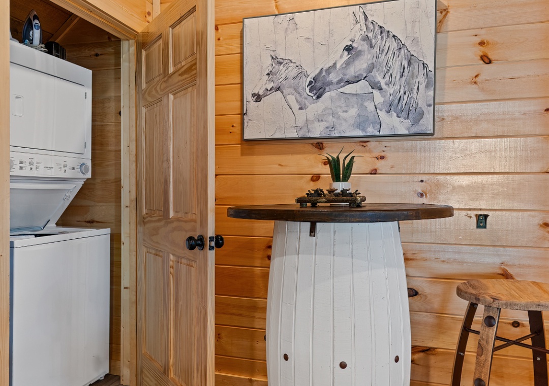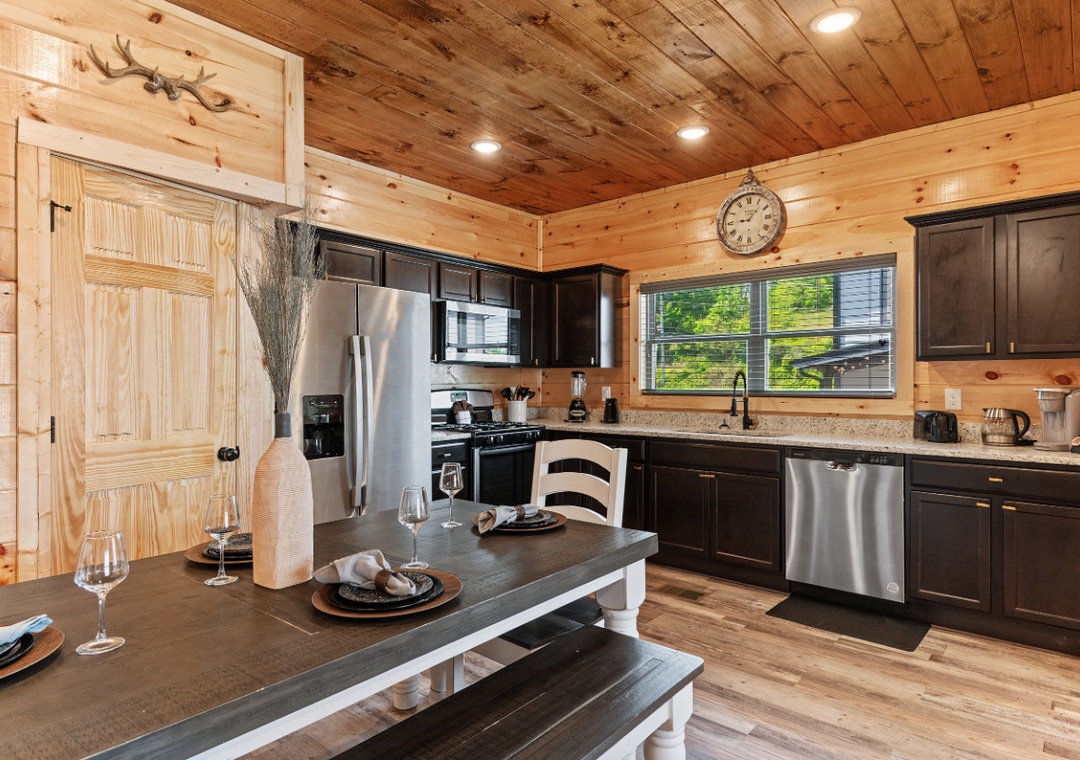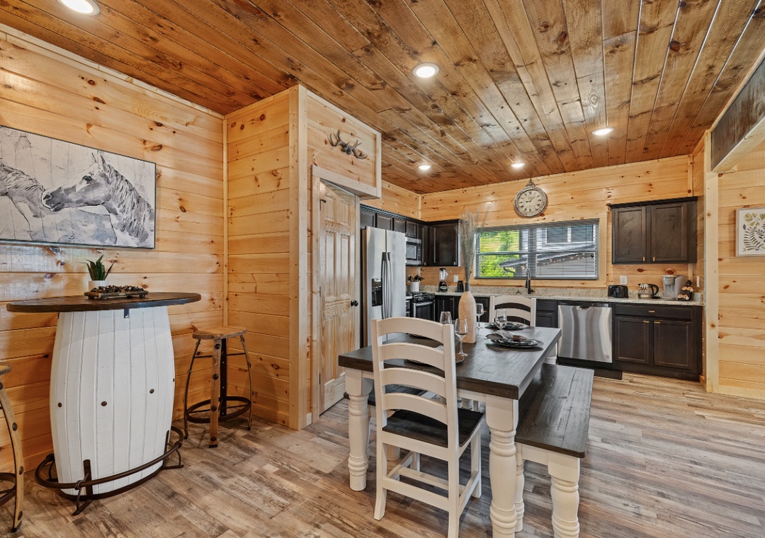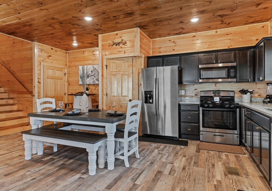 The fully equipped kitchen stands ready, encouraging culinary adventures or simple, shared romantic meals. Complete with a full-sized refrigerator, dishwasher, stove, microwave, and other kitchen appliances perfect for making breakfast, lunch, or dinner throughout your stay! All pots, pans, glasses, plates, silverware, etc. are also there for you! Share laughter and stories around the dining table, creating memories that will be cherished for years to come.