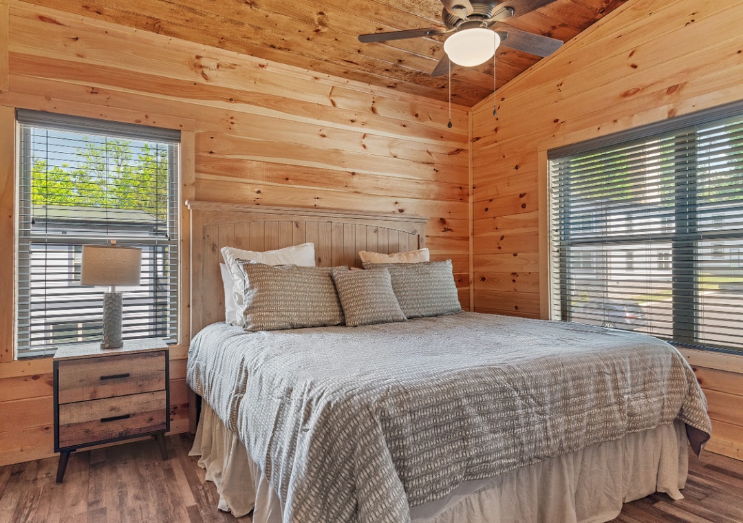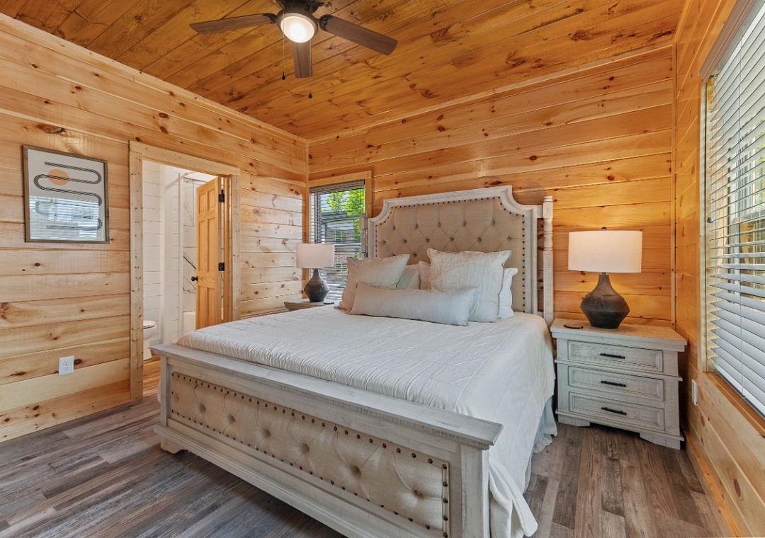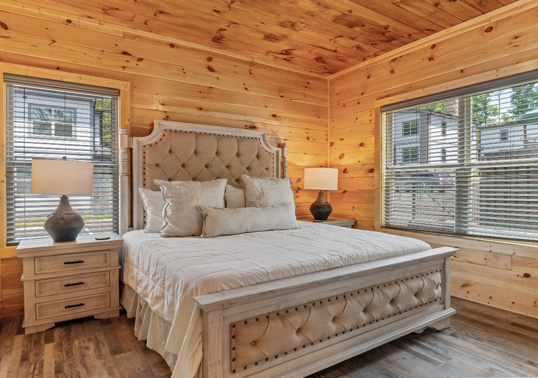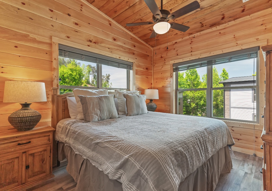 ✔ Bedroom #2 (Upper Level): Spacious Bedroom with a King-sized Bed and Flat-screen TV; Attached Full Bathroom with Stand Up Shower