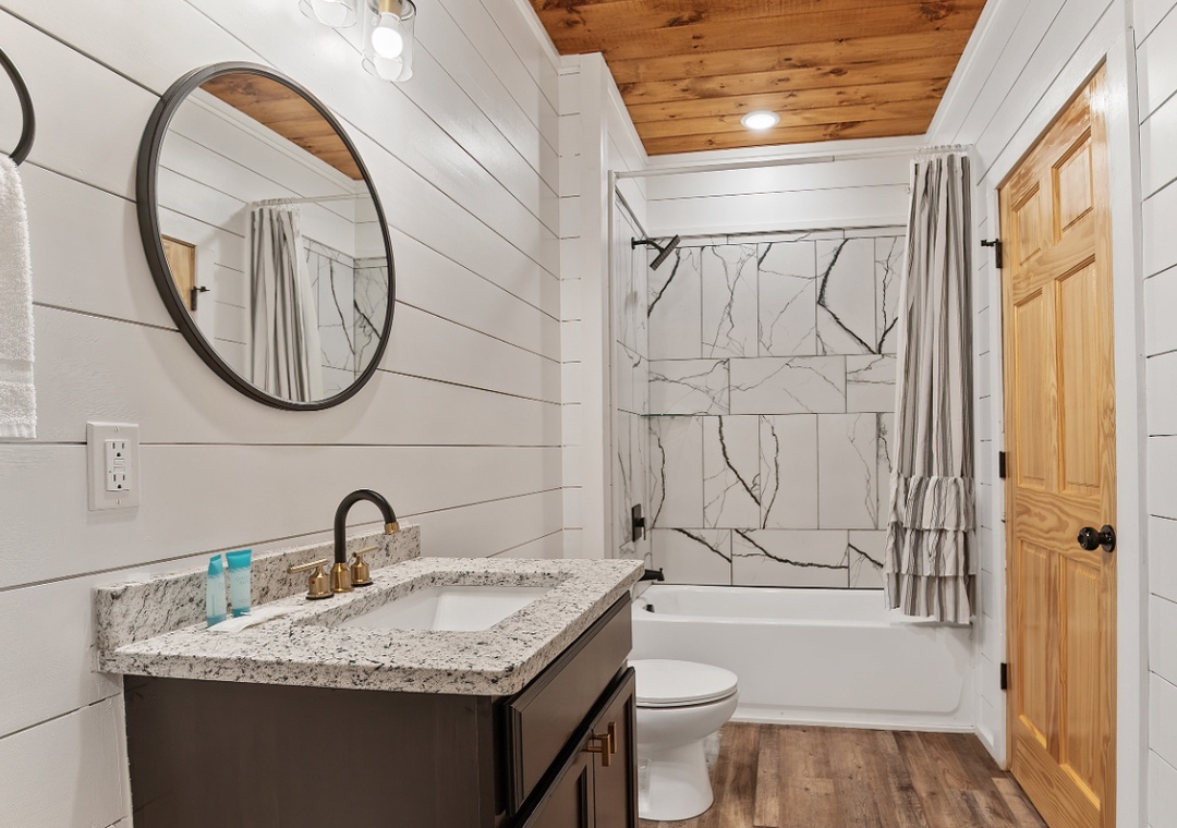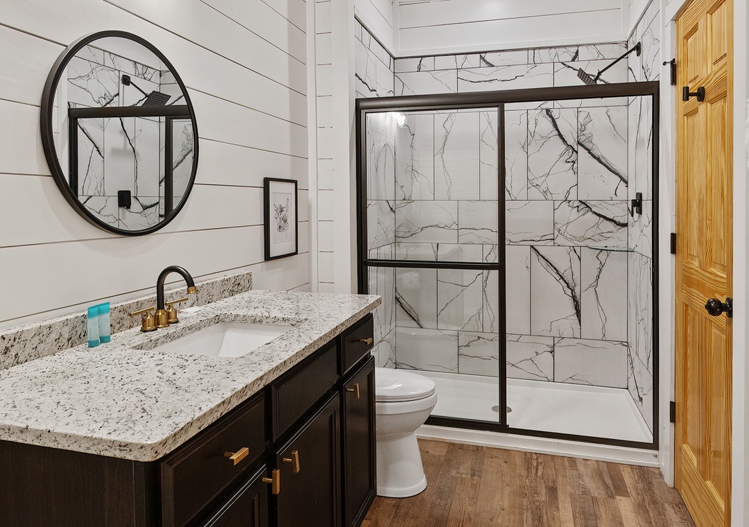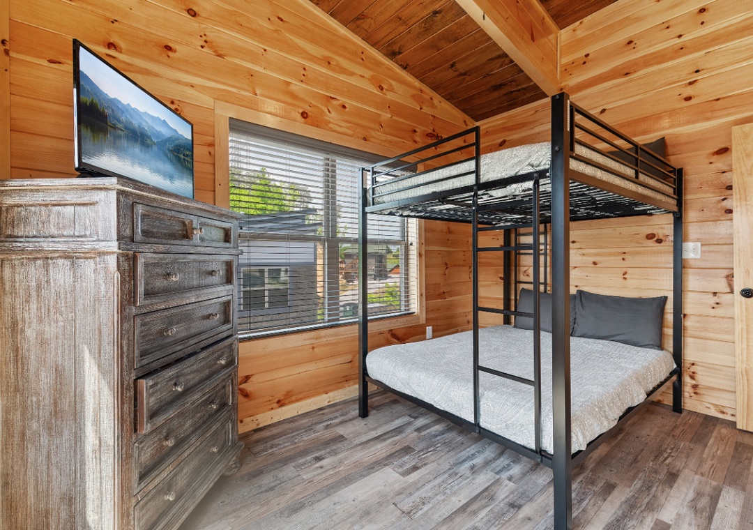 ✔ Bedroom #4 (Upper Level): Inviting Bedroom with a Full-over-Full Bunk Bed and Flat-screen TV; Attached Full Bathroom with Stand Up Shower