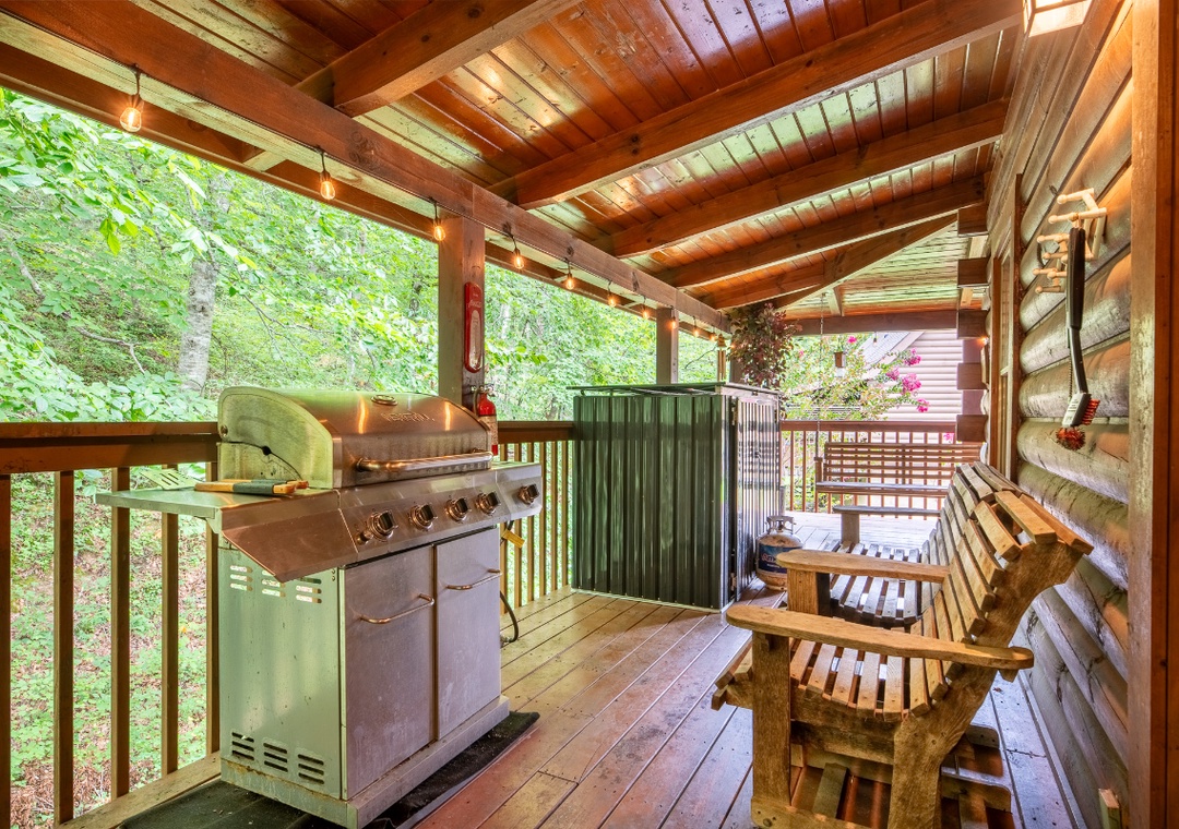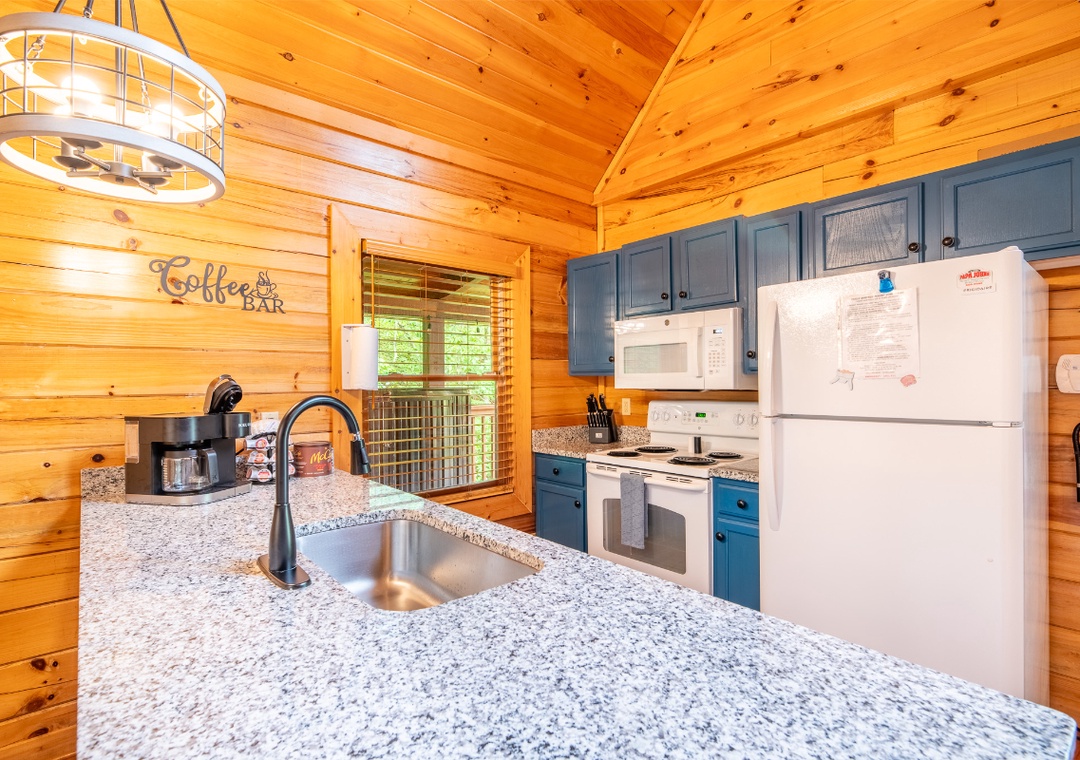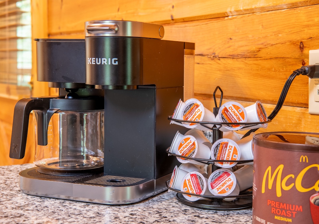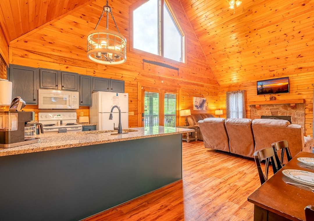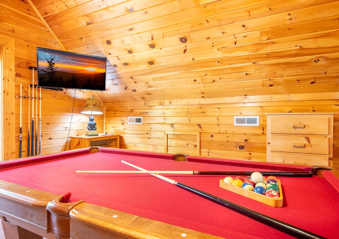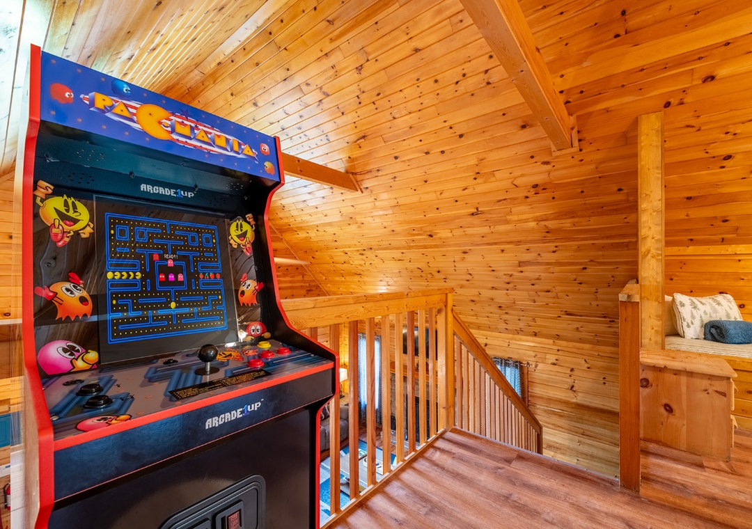 Let’s start in the open-concept living room that sets the stage with a 50" TCL Roku TV paired with the warm glow of an electric fireplace for a cozy atmosphere. Upstairs, the game loft is a hub of nonstop fun. Challenge your friends or family to a friendly game of pool on the full-size table, or dive into the multicade arcade machine for hours of nostalgic gameplay with dozens of classic titles. For a more relaxing kind of entertainment, head out to the side porch where the bubbling hot tub offers a soothing soak. Let the jets melt away any tension as you enjoy the surrounding views or stargaze at night. On the same porch, you’ll find a propane grill, perfect for hosting your own mountain cookout while everyone gathers around. When you’re ready for a change of pace, the seasonal community pool at the resort’s entrance is a refreshing option for sunny days. Spend the afternoon swimming, lounging, and enjoying the company of your travel companions. With so many ways to play, relax, and connect, Moonshine Hollow ensures that every moment of your vacation is filled with something enjoyable.