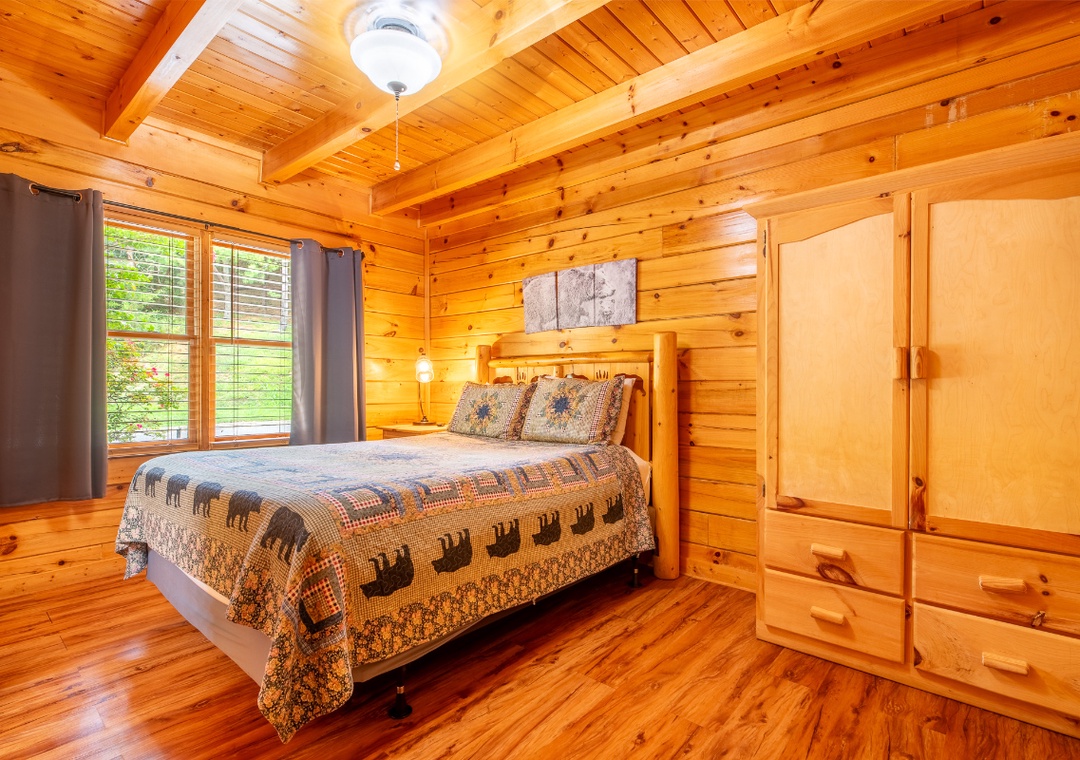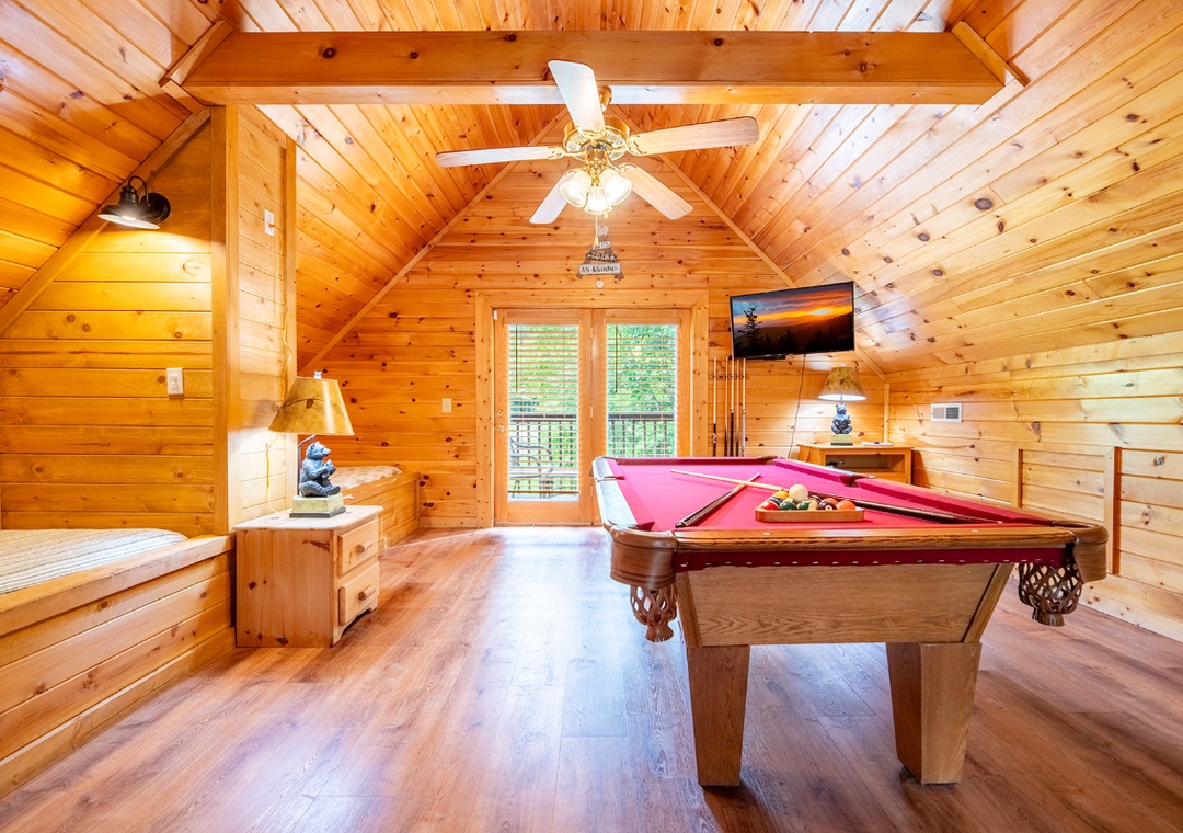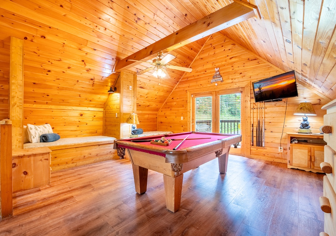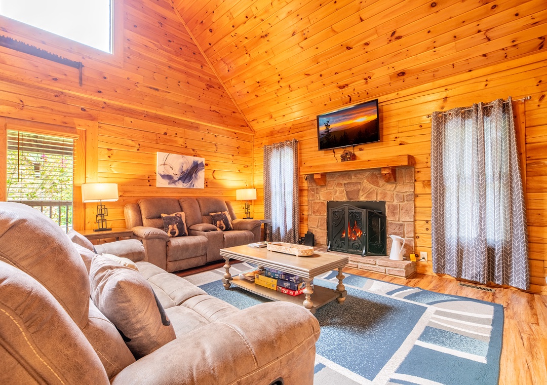 The open-concept living room is the heart of the cabin, where a soft glow from the electric fireplace sets the perfect mood for unwinding after a day in the Smokies. A plush sofa invites you to sink in and relax, while the 50" TCL Roku TV offers endless entertainment, from your favorite movies to binge-worthy series. The fully equipped kitchen sits just steps away, seamlessly connected to the living area so you can cook, chat, and stay part of the conversation. Upstairs, the spacious game loft turns downtime into playtime, designed for both fun and relaxation. Also, find each of the two bedrooms that offer a peaceful retreat for rest and rejuvenation. Soft bedding, warm lighting, and thoughtful touches create an inviting atmosphere that ensures a great night’s sleep. Free WiFi is also available throughout the property.
