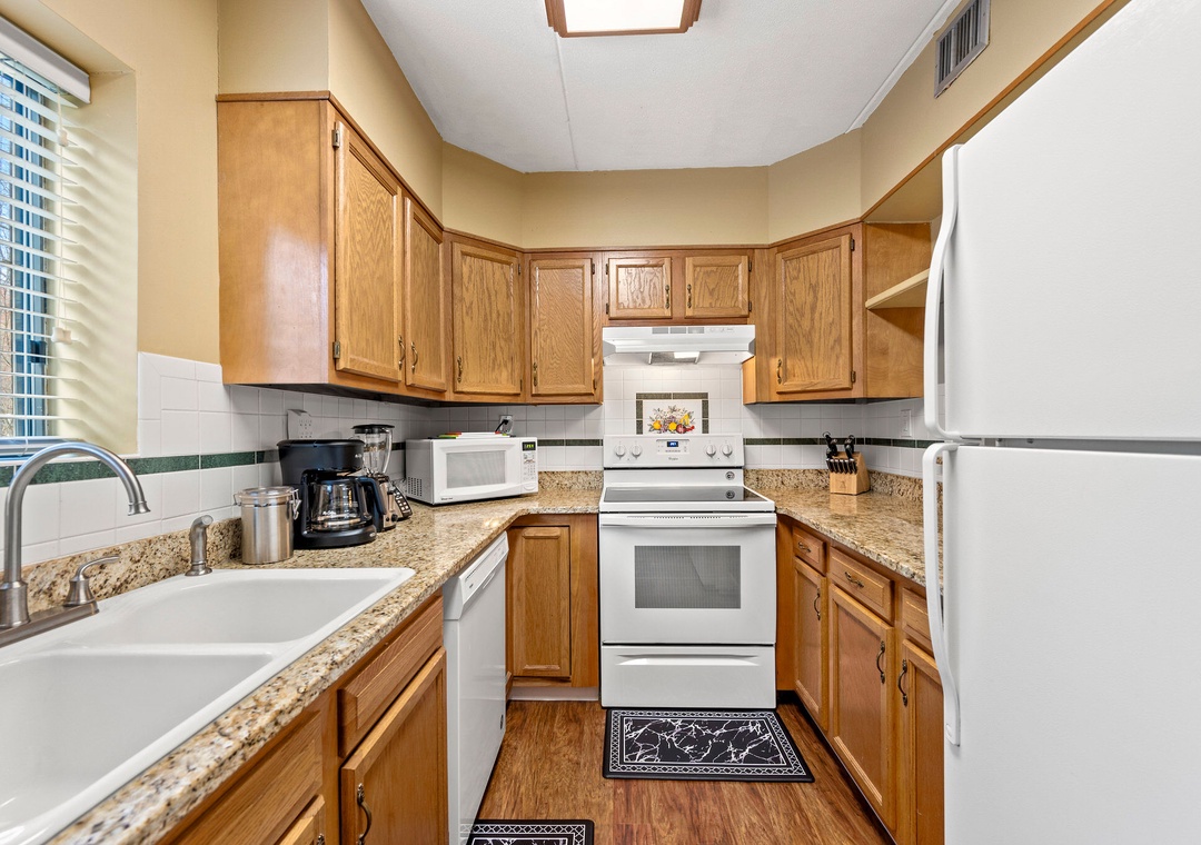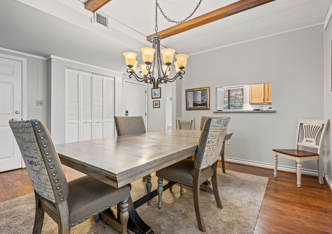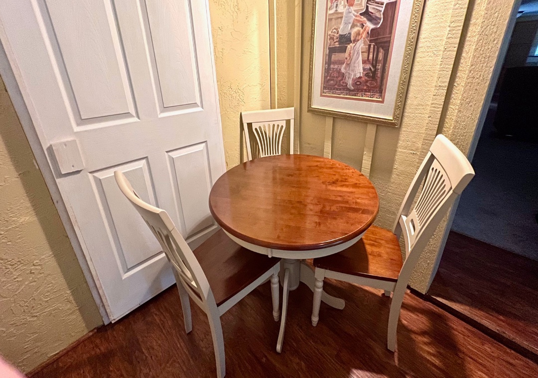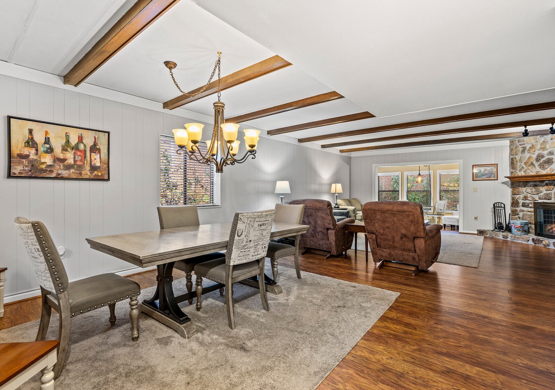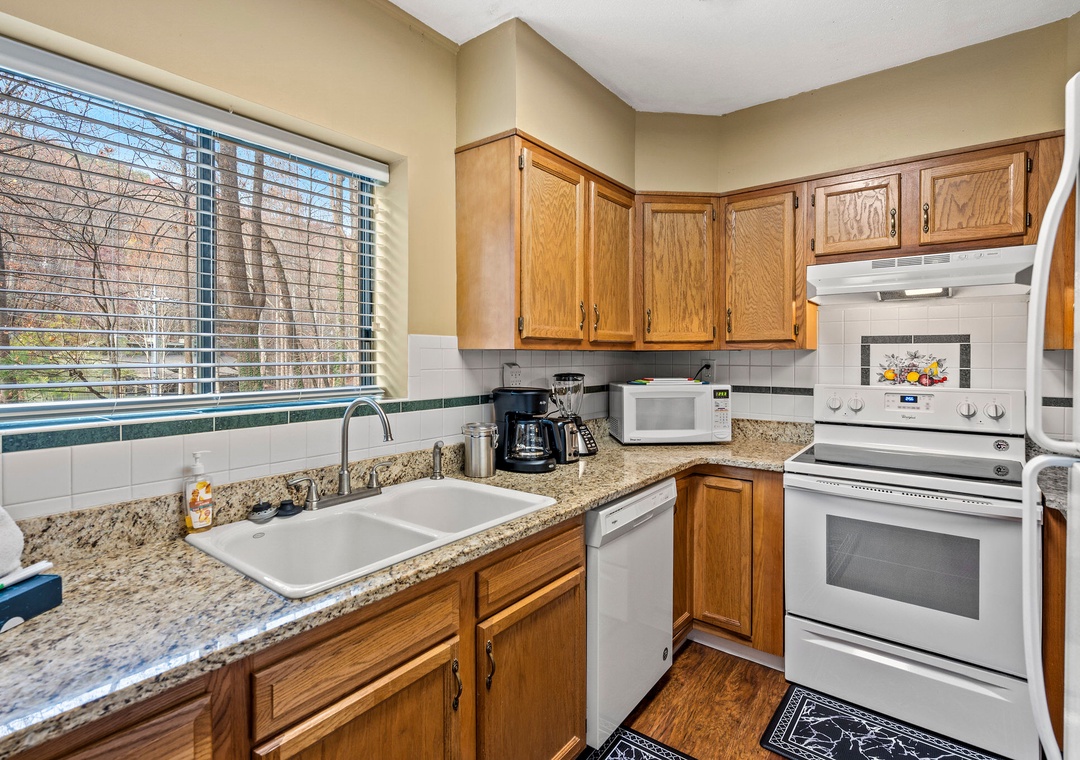 Honey-gold cabinets and granite countertops make this fully equipped kitchen as pretty as it is convenient. Well-appointed with a full-sized refrigerator, dishwasher, stove, microwave, and other kitchen appliances perfect for making breakfast, lunch, or dinner throughout your stay! All pots, pans, glasses, plates, silverware, etc. are also there for you! Dine in style at Mountain Charm's large dining table with open access to the living area.