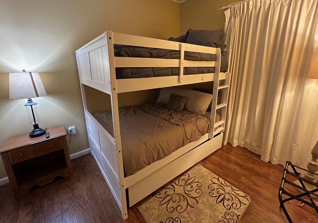 ✔ Bedroom #3 (Left): Cozy bedroom retreat with a Full-over-Full Bunk Bed and access to shared bath (shower/tub combo)