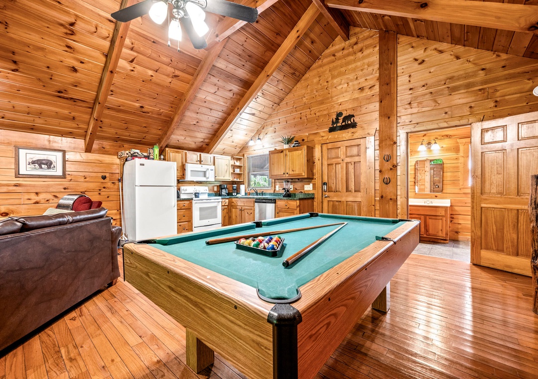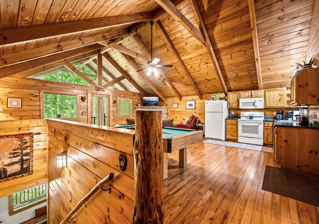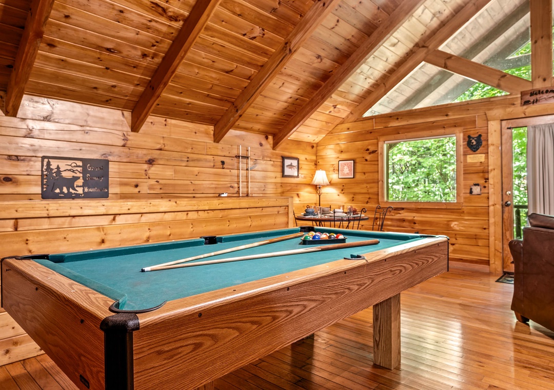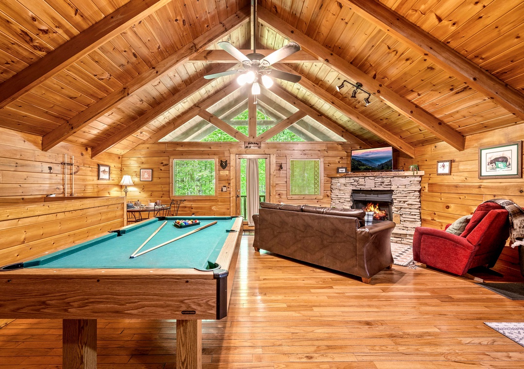 As you step inside "Mountain Dream," you’ll immediately be enveloped by the warm and inviting atmosphere of the living room. Featuring a cozy propane fireplace, this space is perfect for curling up with a good book, sharing a glass of wine, or simply enjoying each other’s company. The decor seamlessly blends rustic charm with modern comforts, creating an ambiance that feels both luxurious and homely. The open floor plan connects the living room to a well-equipped kitchen, where you can whip up delicious meals together. Enjoy your meals at the intimate dining table, designed for two, which provides a lovely setting for candlelit dinners or morning coffee while taking in the scenic views. You’ll also find a pool table that promises hours of fun and friendly competition. Whether you're an avid pool player or just looking to unwind, this space adds an extra layer of enjoyment to your stay. Free WiFi is also available throughout the property.