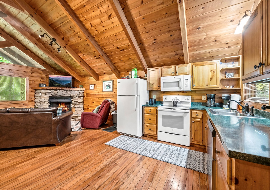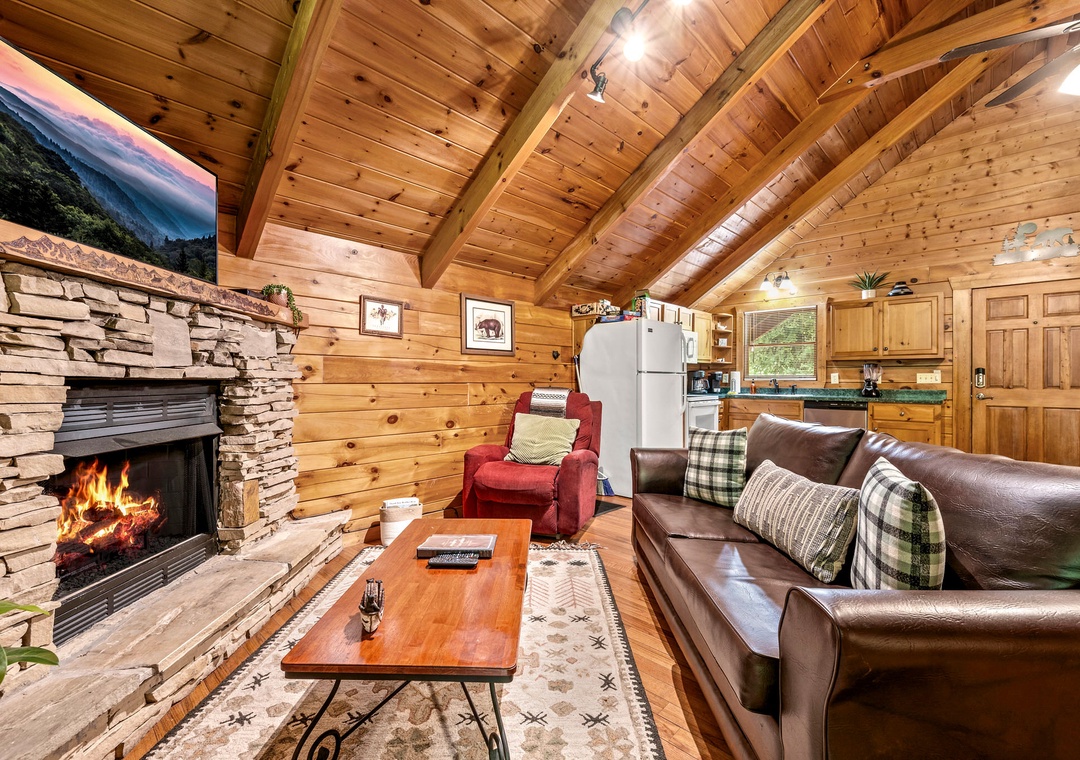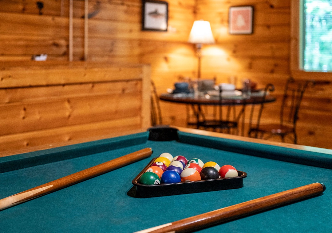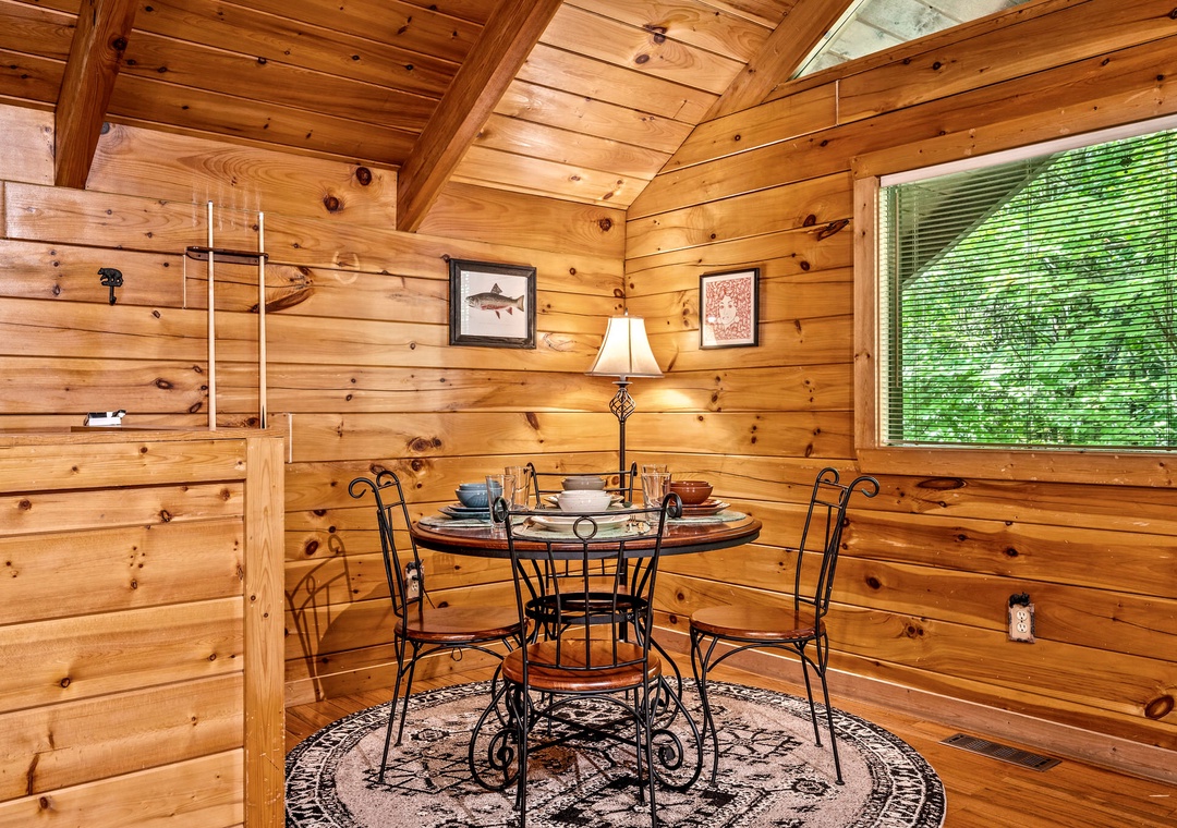 As you step inside "Mountain Dream," you’ll immediately be enveloped by the warm and inviting atmosphere of the living room. Featuring a cozy propane fireplace, this space is perfect for curling up with a good book, sharing a glass of wine, or simply enjoying each other’s company. The decor seamlessly blends rustic charm with modern comforts, creating an ambiance that feels both luxurious and homely. The open floor plan connects the living room to a well-equipped kitchen, where you can whip up delicious meals together. Enjoy your meals at the intimate dining table, designed for two, which provides a lovely setting for candlelit dinners or morning coffee while taking in the scenic views. You’ll also find a pool table that promises hours of fun and friendly competition. Whether you're an avid pool player or just looking to unwind, this space adds an extra layer of enjoyment to your stay. Free WiFi is also available throughout the property.
