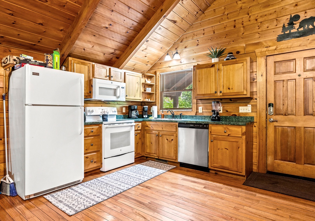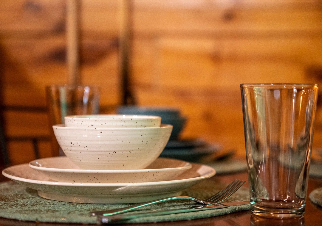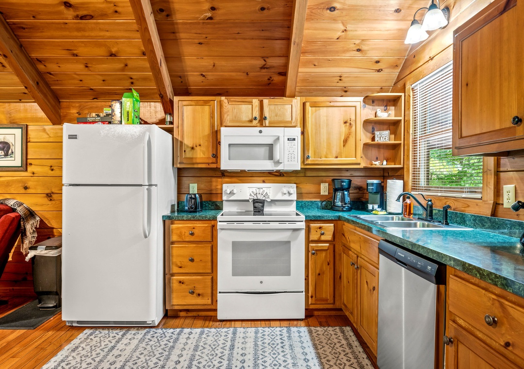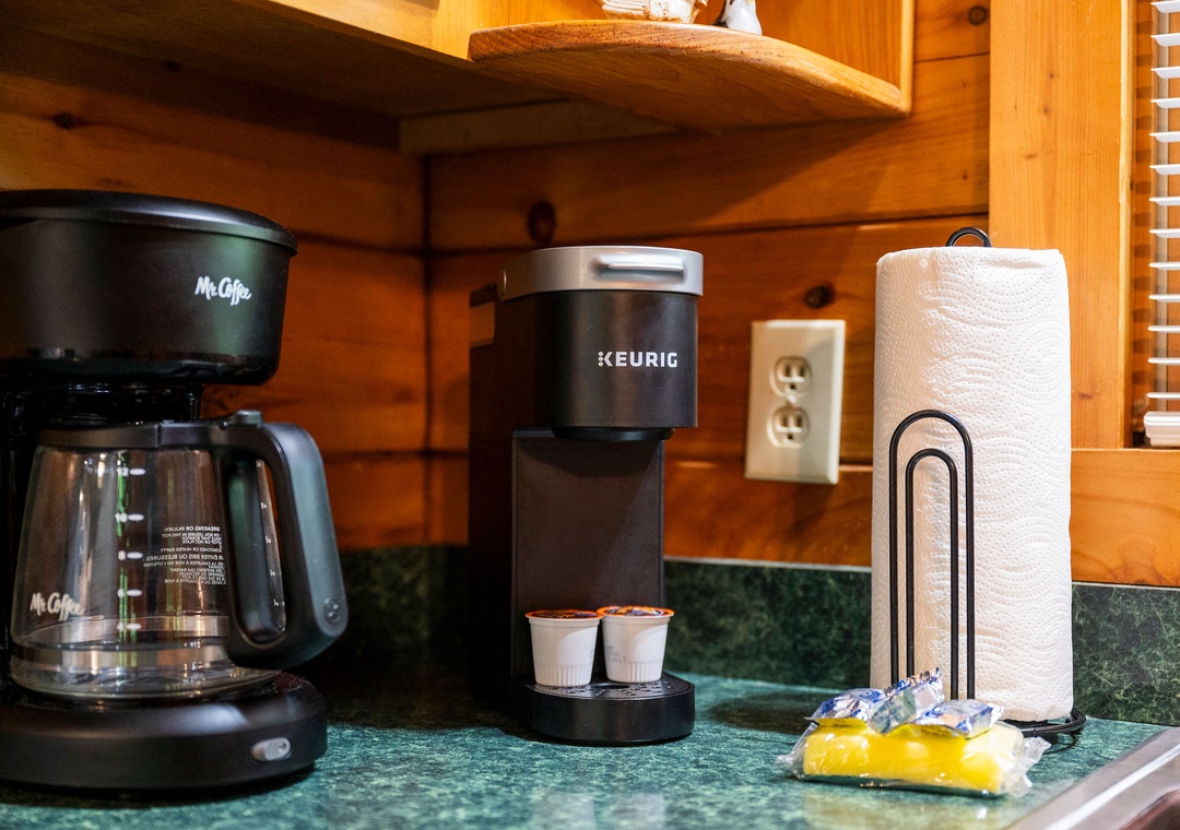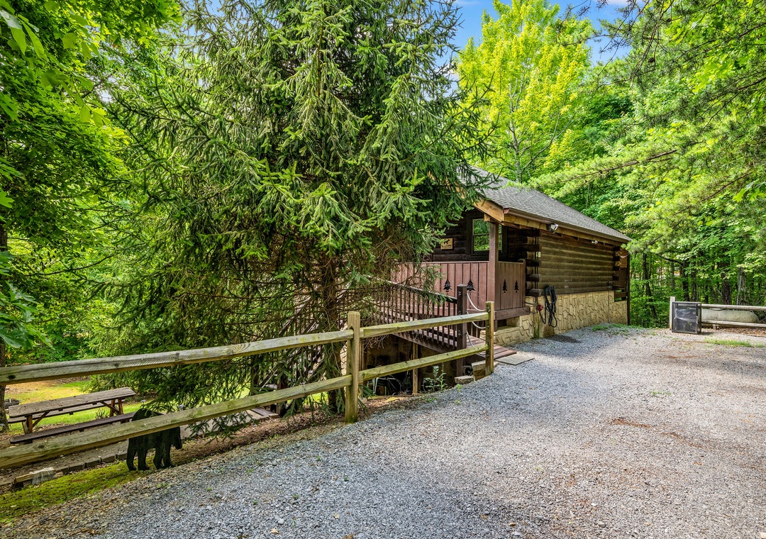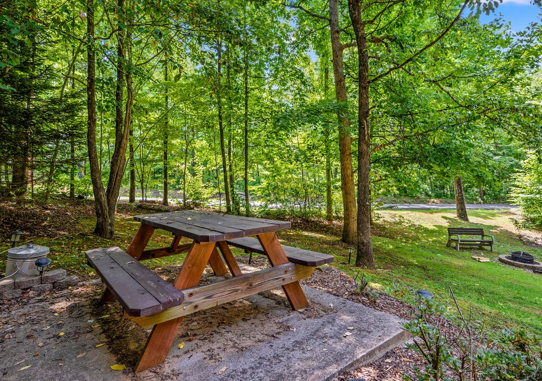 The fully-equipped kitchen boasts modern amenities alongside traditional touches, making it easy to prepare delicious meals for your family or friends. Well-appointed with a full-sized refrigerator, dishwasher, stove, microwave, and other kitchen appliances perfect for making breakfast, lunch, or dinner throughout your stay! All pots, pans, glasses, plates, silverware, etc. are also there for you! Gather around the romantic dining table to share stories and laughter as it invites you to savor each bite while taking in the natural beauty of the surroundings. Adjacent to the cabin, you’ll also find a delightful picnic area perfect for enjoying outdoor meals.