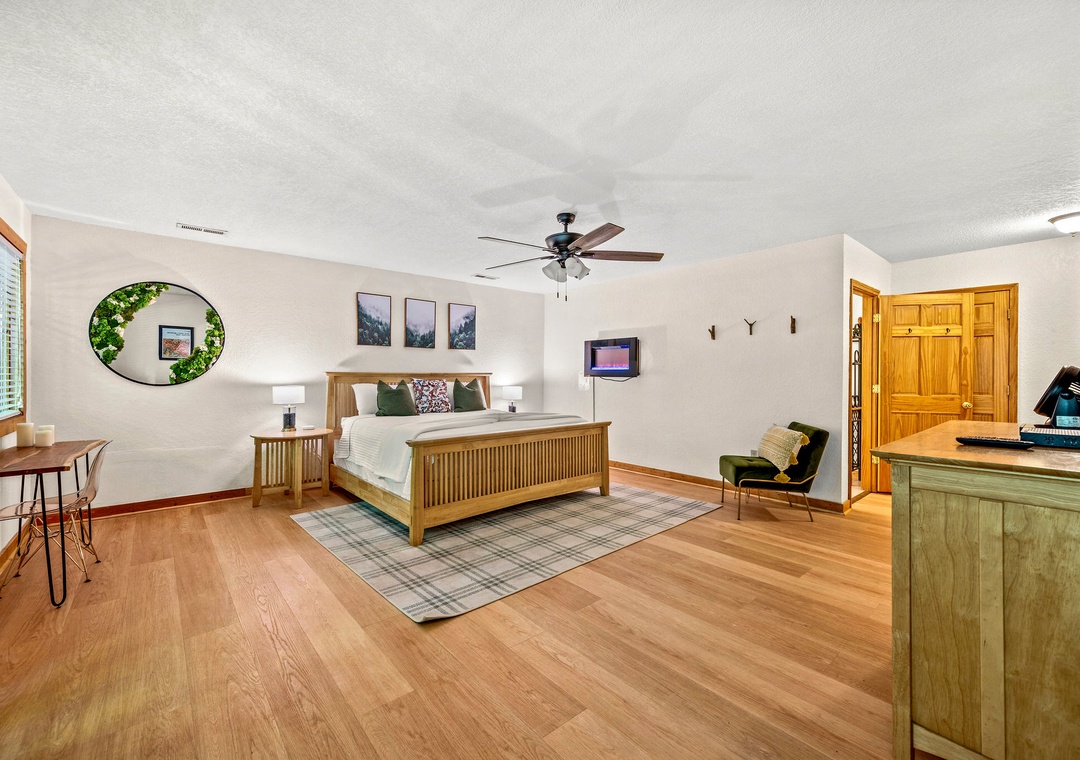 ✔ Bedroom #1 (Lower Level): Luxurious Bedroom with a King-sized Bed and a Flat-screen TV; Attached Full Bathroom with Shower/Tub Combo