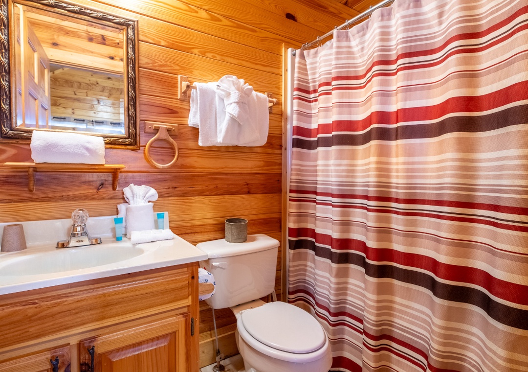 ✔ Bedroom #2 (Upper Level): Comfortable Bedroom with a King Bed and Flat-screen TV; Attached Bathroom with Shower/Tub Combo