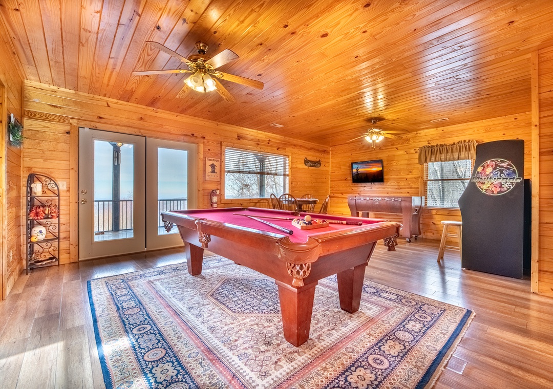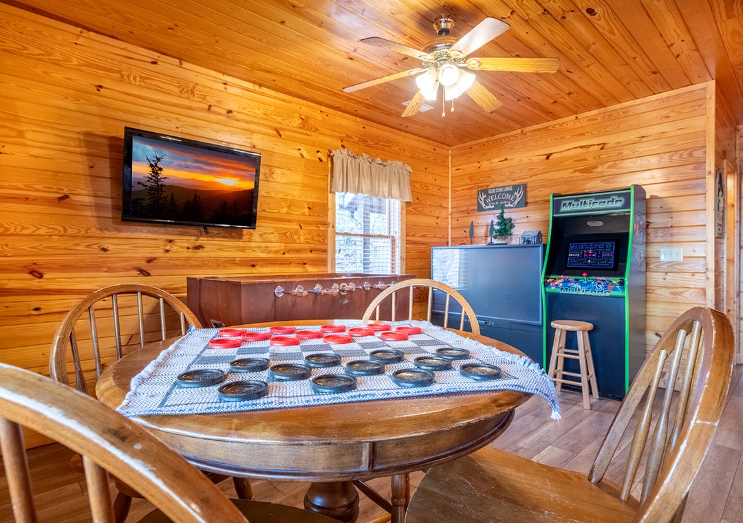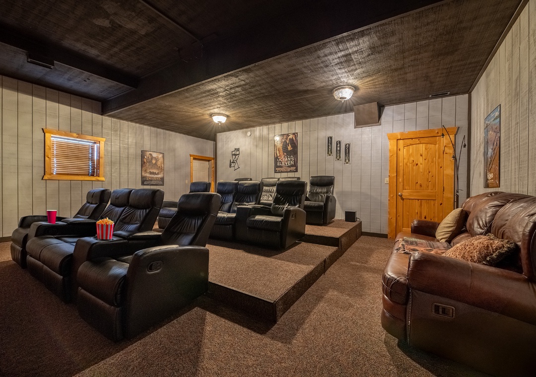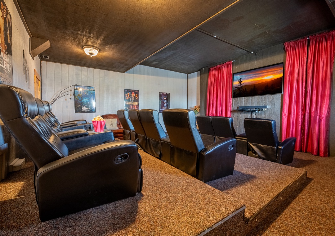 The Main House is an entertainment hub, featuring a fully equipped game room that promises hours of excitement. Test your skills on the pool table, challenge each other to fast-paced foosball matches, or dive into nostalgia with the multicade arcade system. The main-level back deck features a propane grill, perfect for cooking up a delicious meal while taking in the beautiful mountain scenery. For a more relaxing kind of entertainment, head out to the side porch where the bubbling hot tub offers a soothing soak. Nearby, children can climb, slide, and play on their very own outdoor playset, adding an extra layer of fun for families with young kids. Outside, you'll also find the shared wood firepit, located at the back of the Little Cabin. This cozy gathering spot invites you to sit around the fire, toast marshmallows, tell stories, and enjoy the peaceful crackle of the flames under the starlit sky. The entertainment continues in the Little Cabin, which offers an incredible private theater room designed for the ultimate movie-watching experience. Equipped with a massive 75" Sony Smart TV and a DVD player, this space is perfect for screening your favorite films or binge-watching your favorite TV shows.