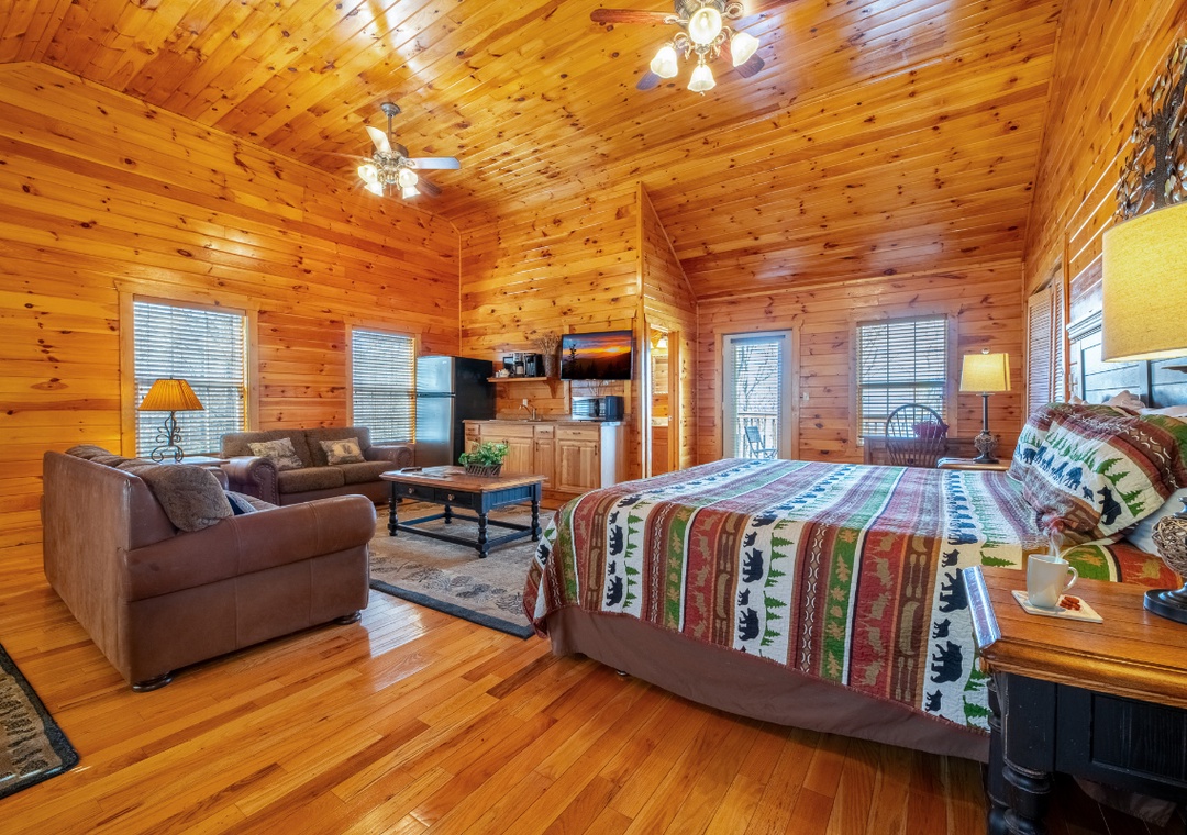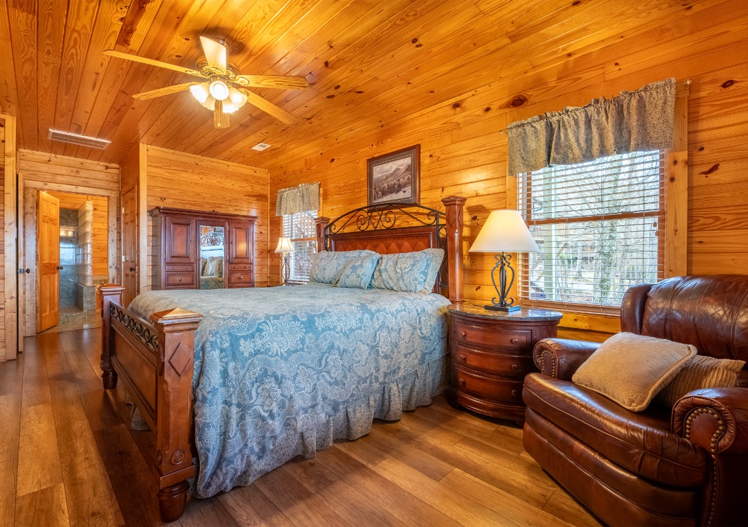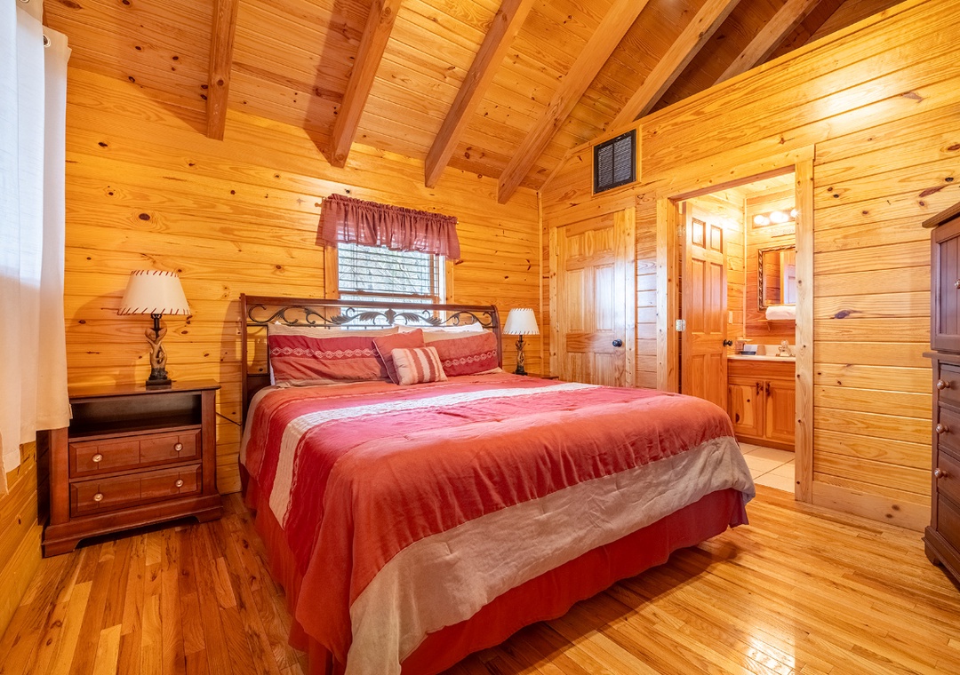 ✔ Bedroom #1 (Main Level): Spacious Bedroom with a King Bed and Flat-screen TV; Attached Bathroom with Stand-up Shower