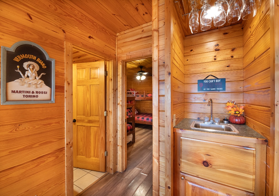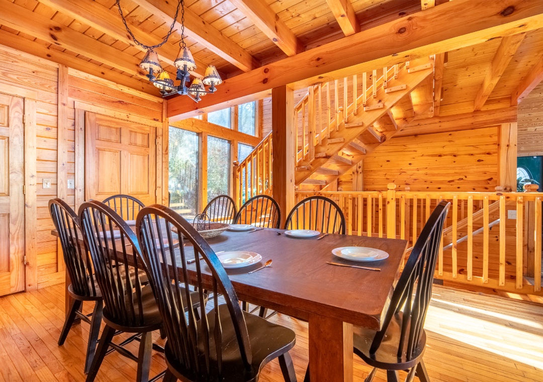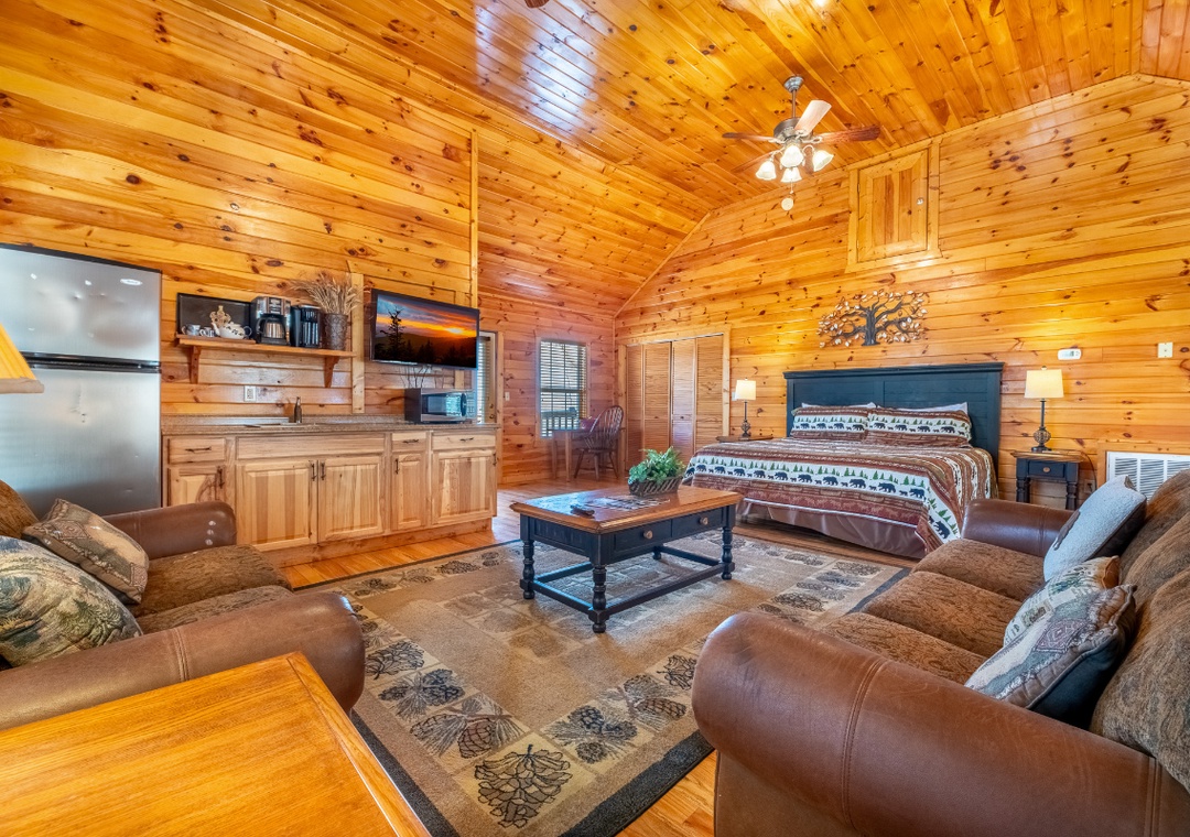 Designed for both functionality and comfort, the Main House kitchen is fully equipped to handle everything from quick breakfasts to elaborate family feasts. Well-appointed with a full-sized refrigerator, stove, microwave, and other kitchen appliances perfect for making breakfast, lunch, or dinner throughout your stay! All pots, pans, glasses, plates, silverware, etc. are also there for you! Gather around the inviting dining table to share stories about the day's adventures. Over at the Little Cabin, guests have access to a kitchenette setup, ideal for preparing smaller meals, snacks, or movie-night treats to enjoy in the theater room.
