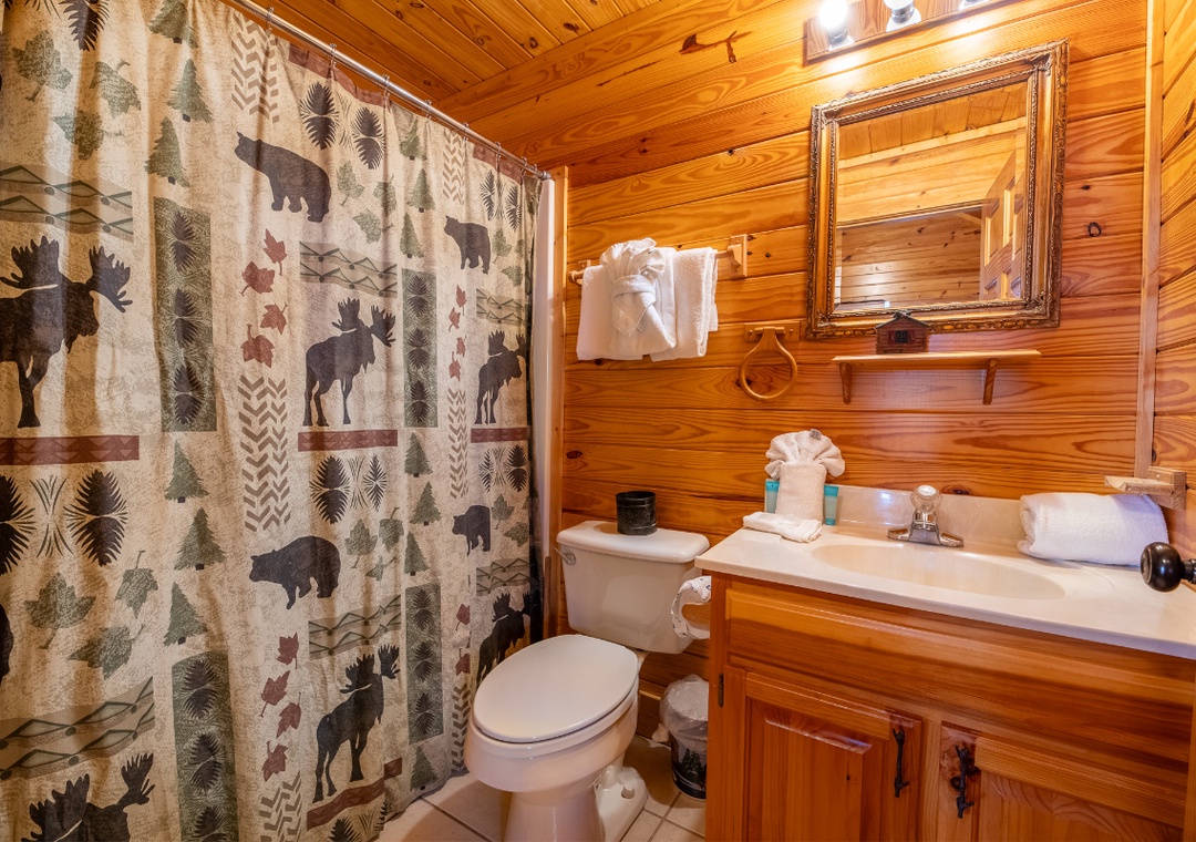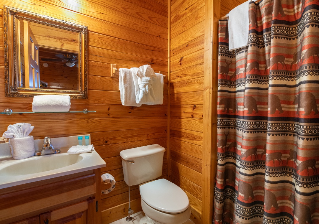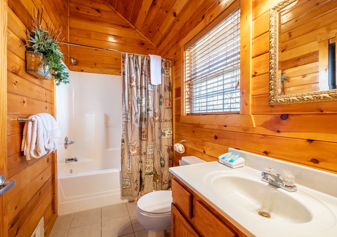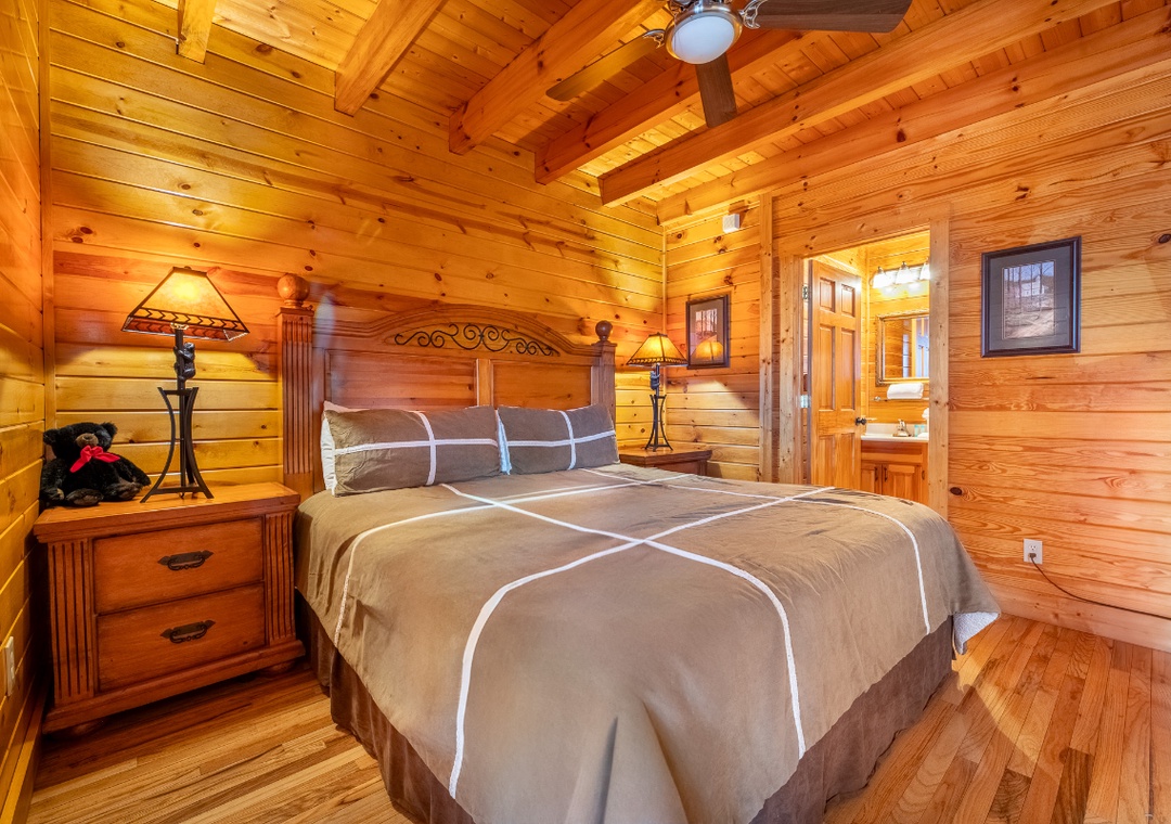 ✔ Bedroom #3 (Upper Level): Cozy Bedroom with a King Bed and Flat-screen TV; Attached Bathroom with Shower/Tub Combo