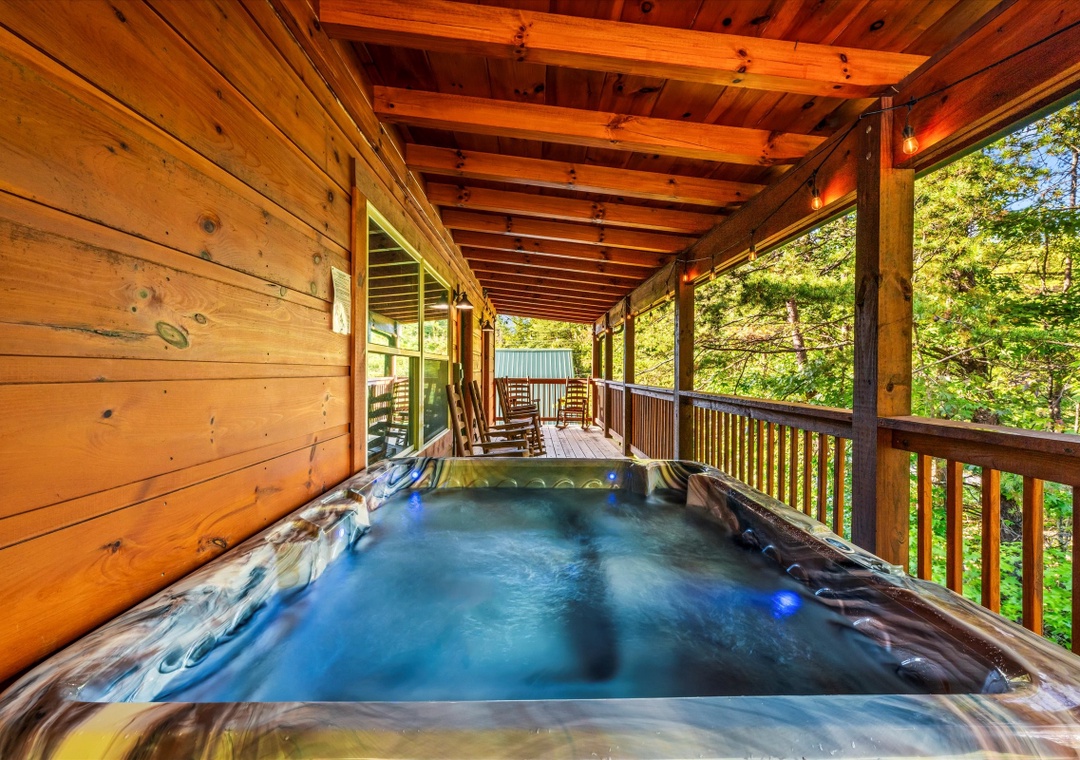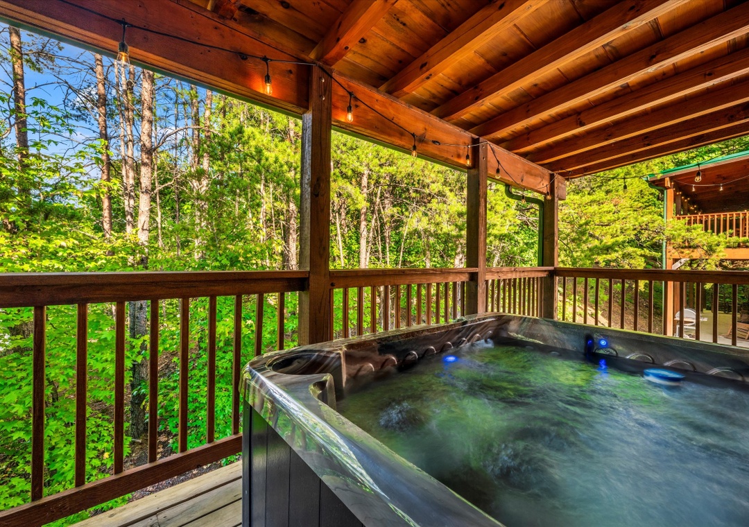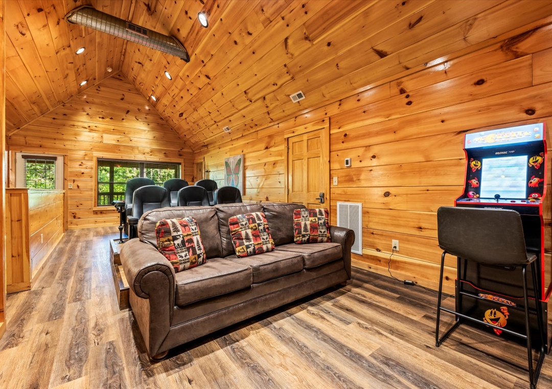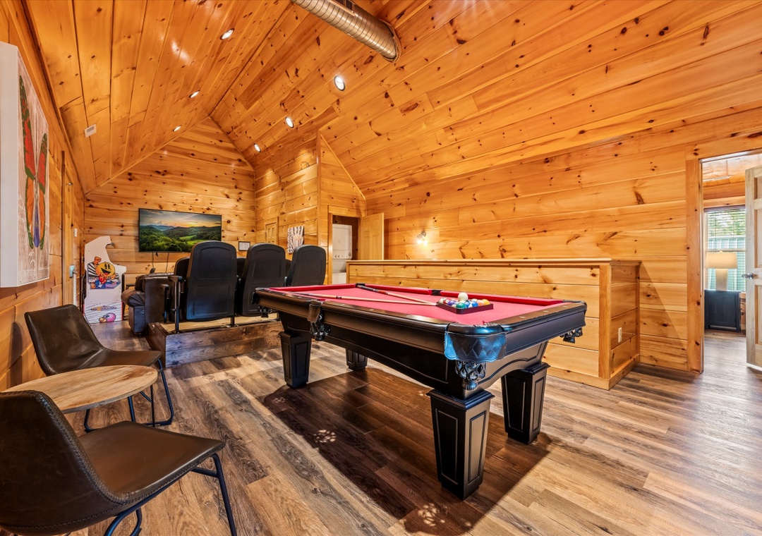What sets our cabin apart is its entertainment offerings. Go upstairs and unwind with the family in the game/theater room where a pool table takes center stage promising hours of friendly competition for everyone. For the ultimate cinematic experience, immerse yourself in the 9-seater home theater complete with a HUGE flat-screen TV where you can enjoy movie nights or catch up on your favorite shows in style. Step outside onto the deck and unwind under the starlit sky as the bubbling waters of the hot tub soothe your senses. The deck surrounding the hot tub offers a private escape with views of the resort, creating a serene ambiance for moments of tranquility. Our cabin's strategic location means you're also within easy reach of an array of attractions, dining options, and entertainment options that Pigeon Forge and the nearby towns have to offer.