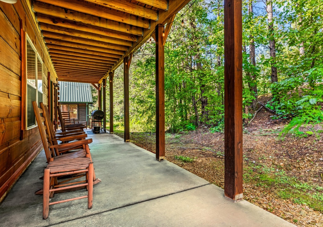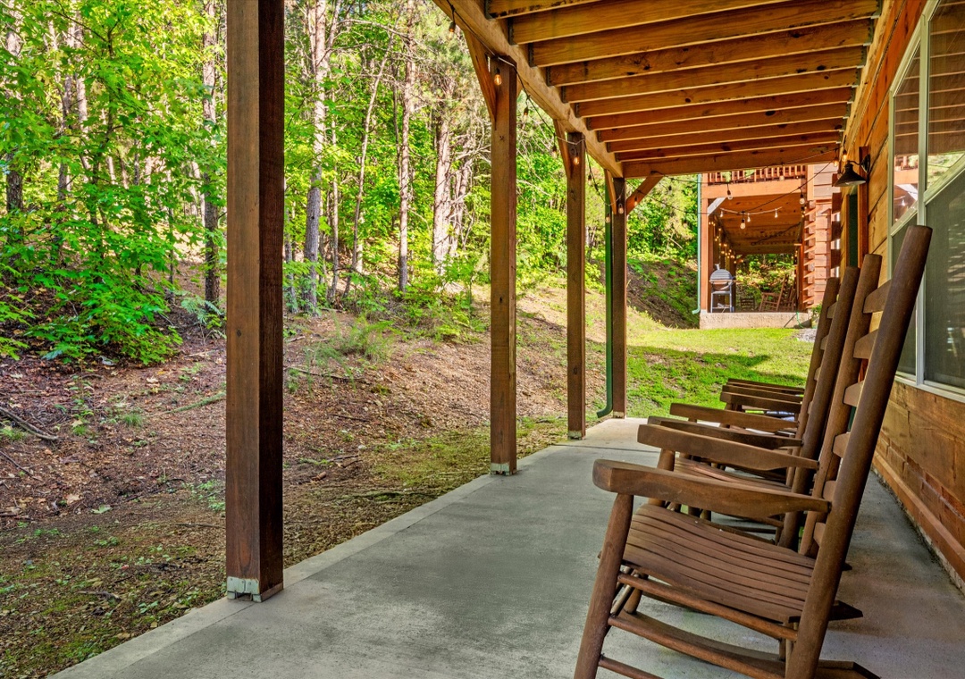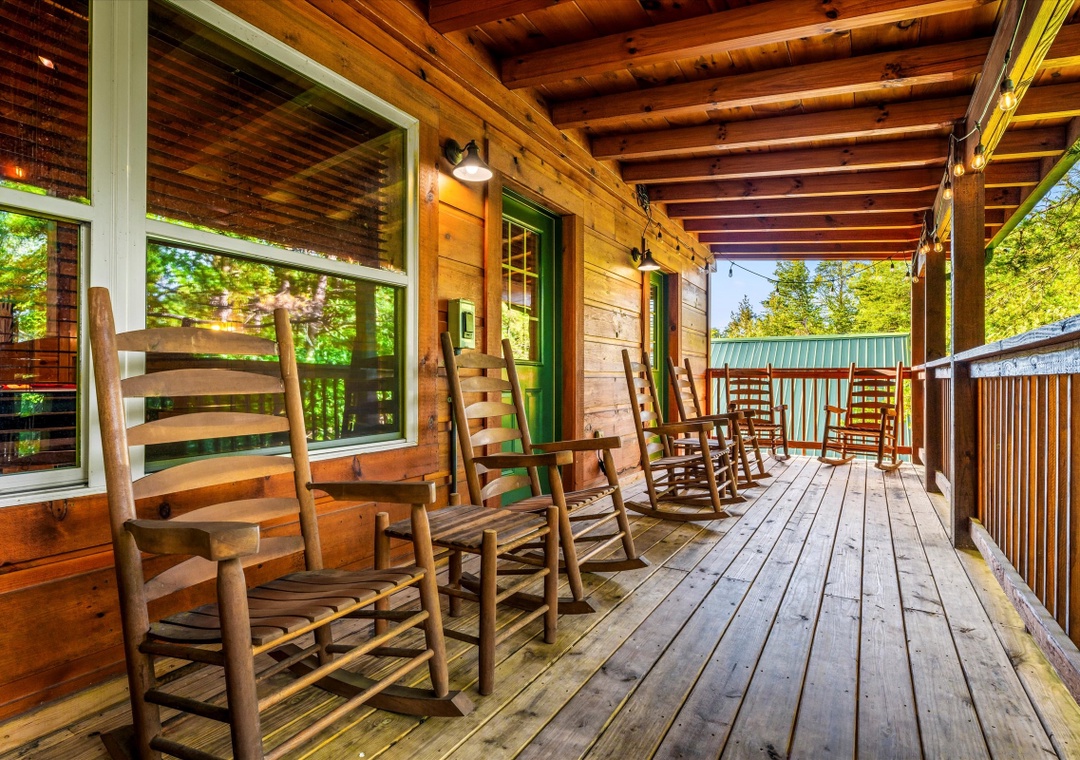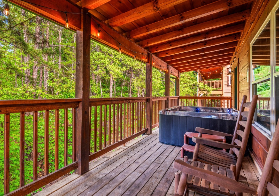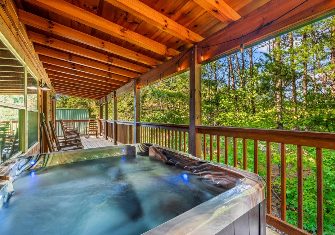 What sets our cabin apart is its entertainment offerings. Go upstairs and unwind with the family in the game/theater room where a pool table takes center stage promising hours of friendly competition for everyone. For the ultimate cinematic experience, immerse yourself in the 9-seater home theater complete with a HUGE flat-screen TV where you can enjoy movie nights or catch up on your favorite shows in style. Step outside onto the deck and unwind under the starlit sky as the bubbling waters of the hot tub soothe your senses. The deck surrounding the hot tub offers a private escape with views of the resort, creating a serene ambiance for moments of tranquility. Our cabin's strategic location means you're also within easy reach of an array of attractions, dining options, and entertainment options that Pigeon Forge and the nearby towns have to offer.