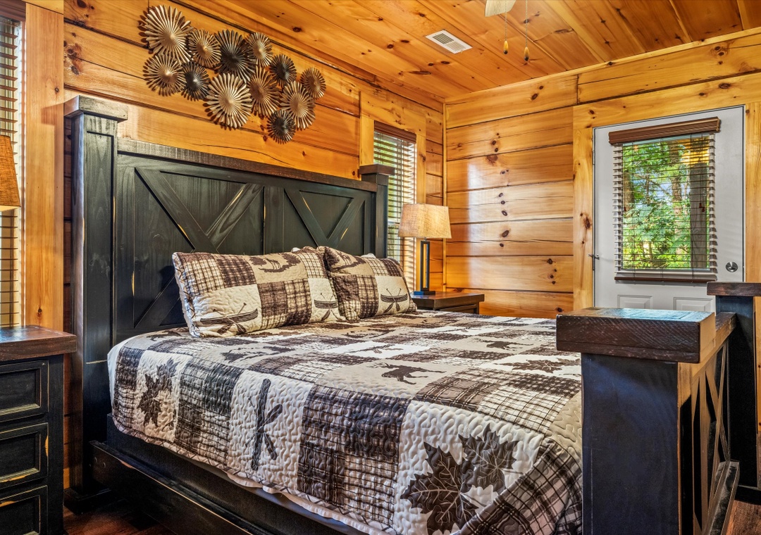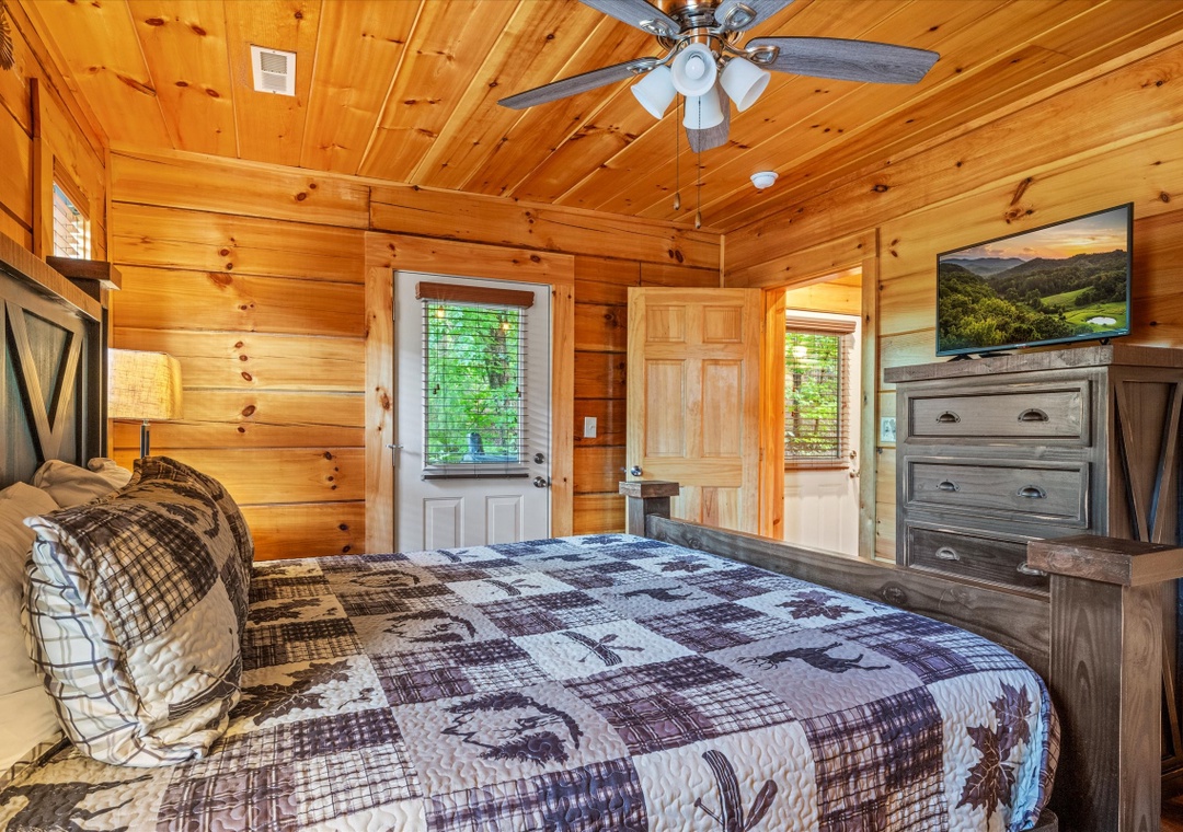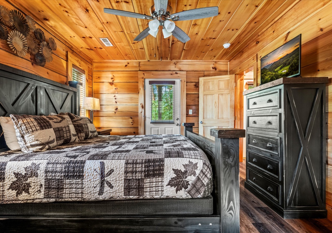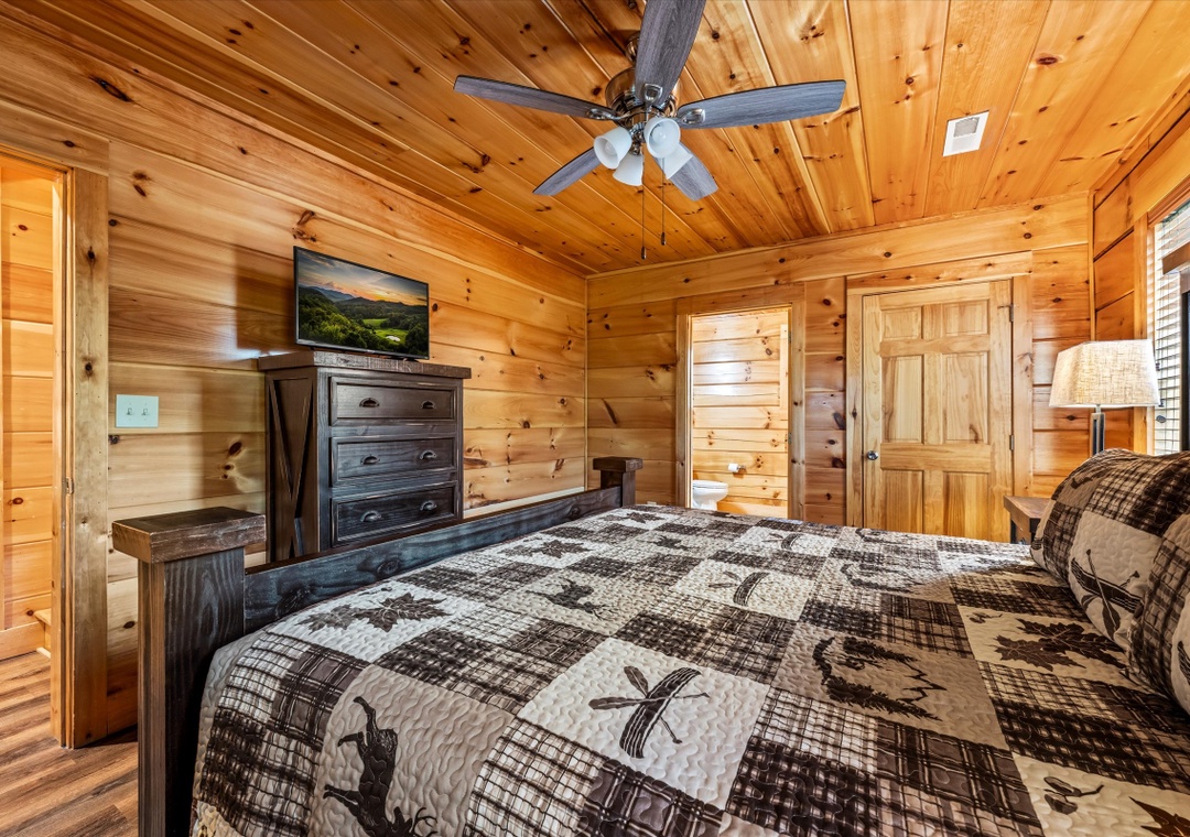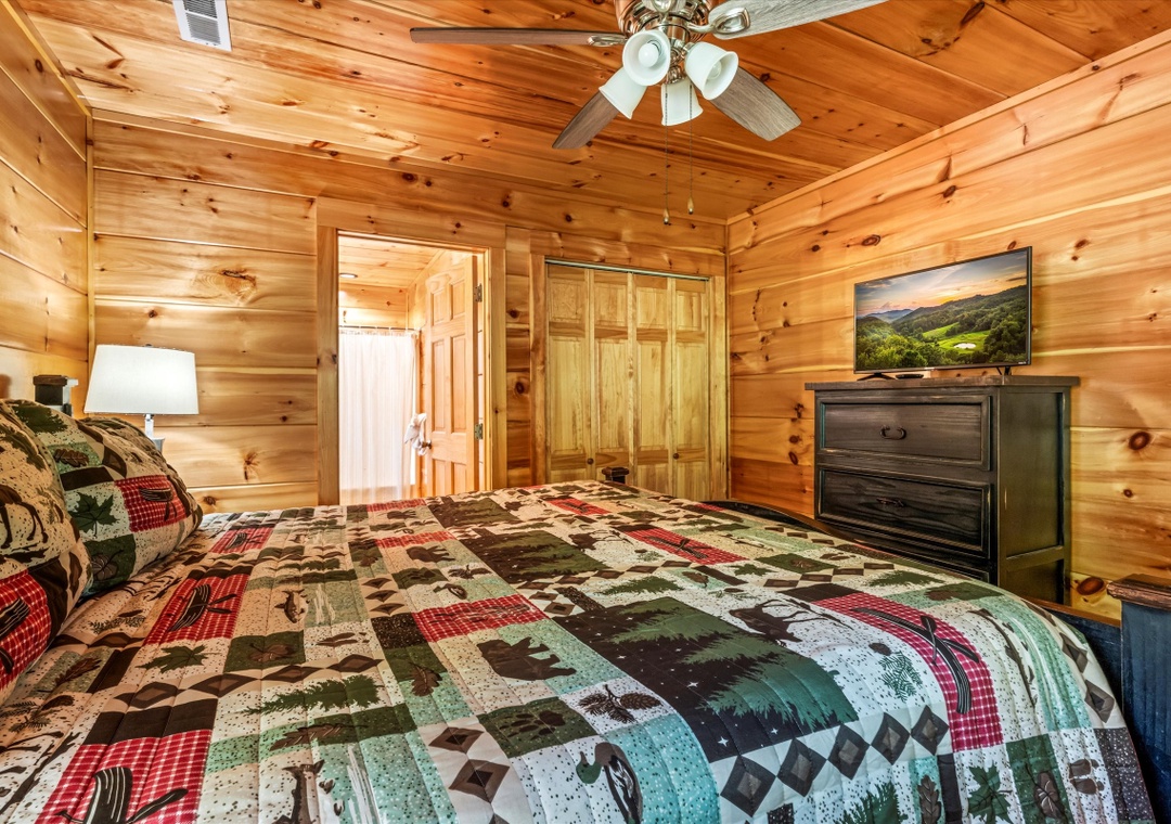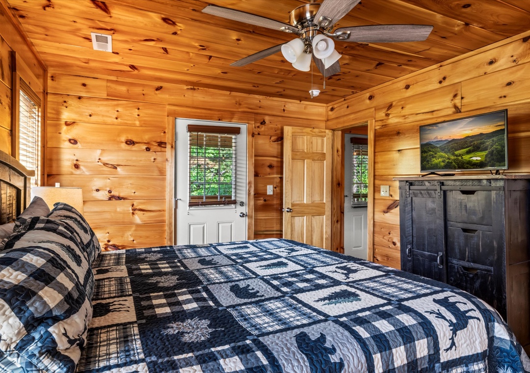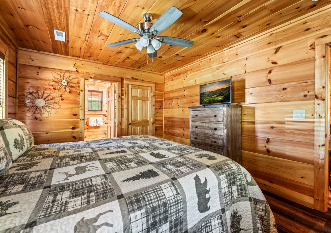 ✔ Bedroom #1 (Main Level): Spacious bedroom with King-sized bed & flat screen TV; Attached Full-sized bathroom with Stand Up Shower