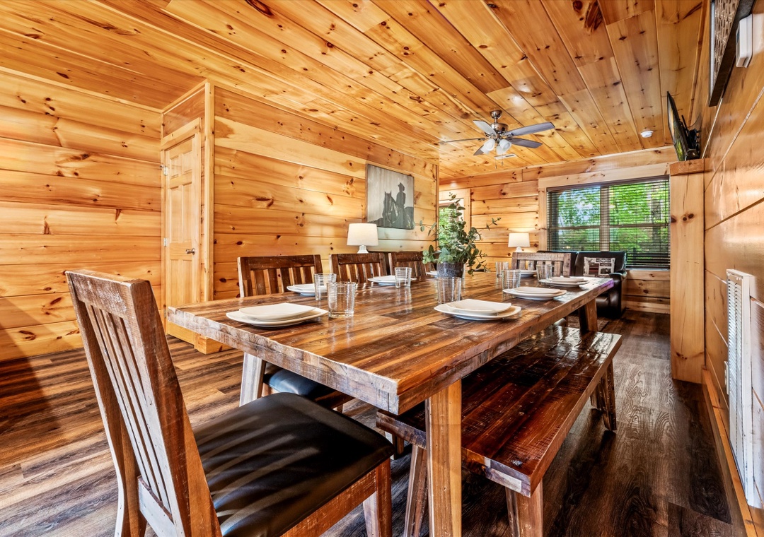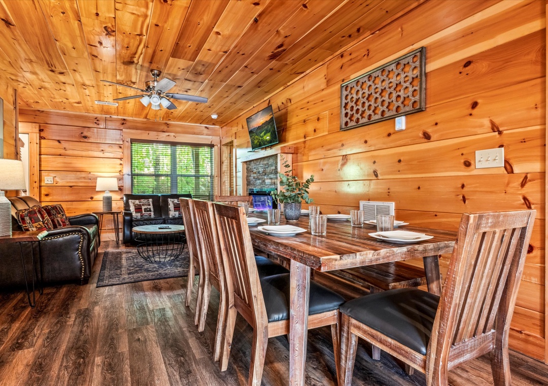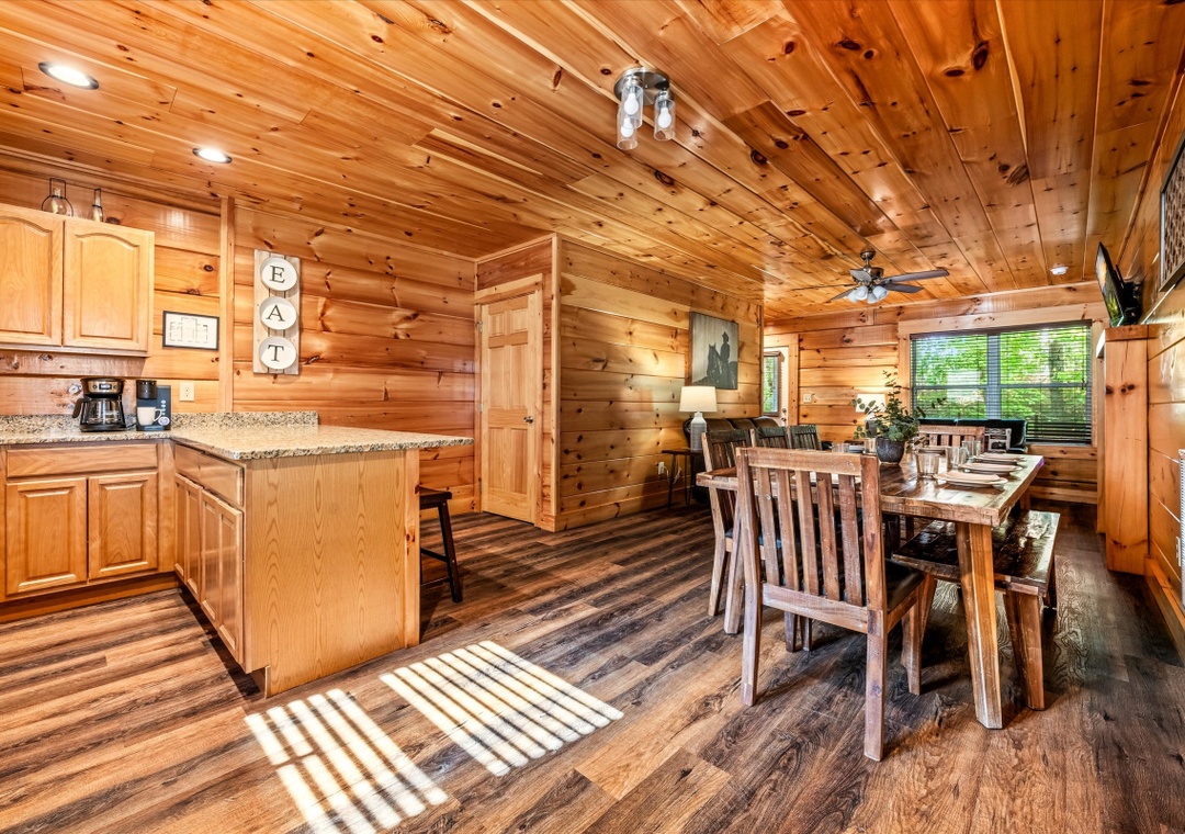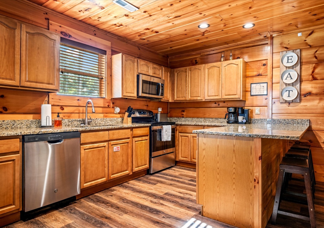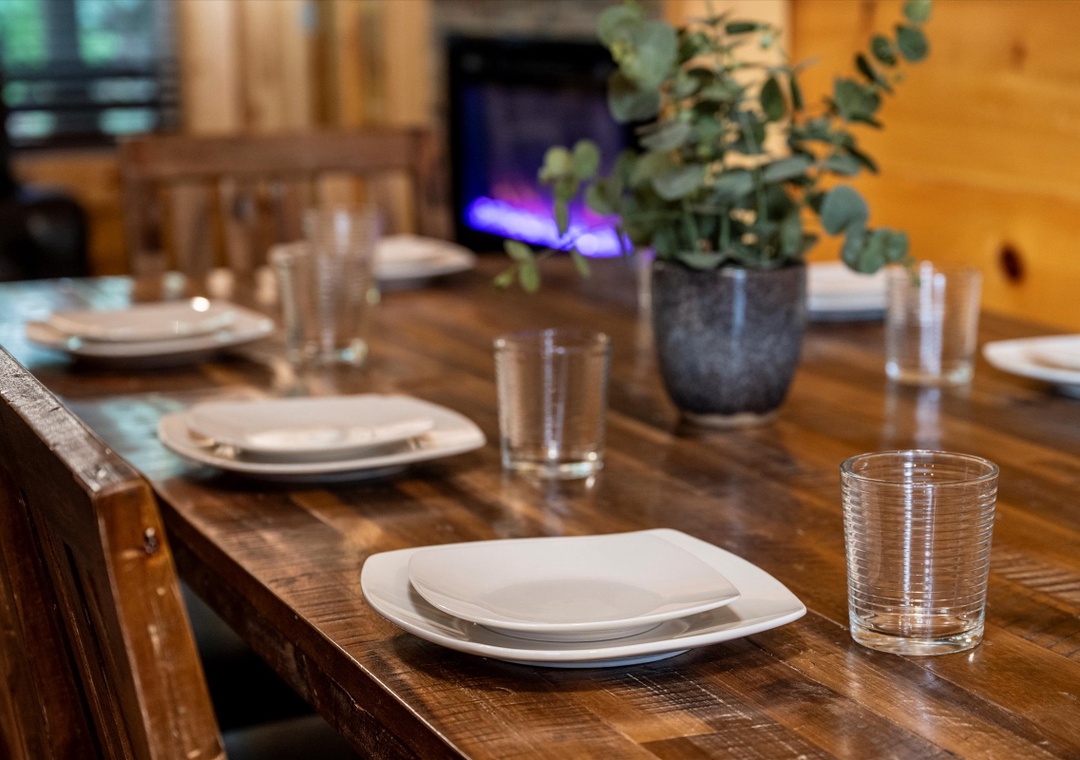 The fully equipped kitchen, featuring stainless steel appliances and granite countertops, invites you to create culinary masterpieces for family and friends. Complete with a full-sized refrigerator, dishwasher, stove, microwave, and other kitchen appliances perfect for making breakfast, lunch, or dinner throughout your stay! All pots, pans, glasses, plates, silverware, etc. are also there for you. Adjacent to the kitchen is a dining area with a rustic dining table, perfect for hosting memorable family dinners or entertaining guests.