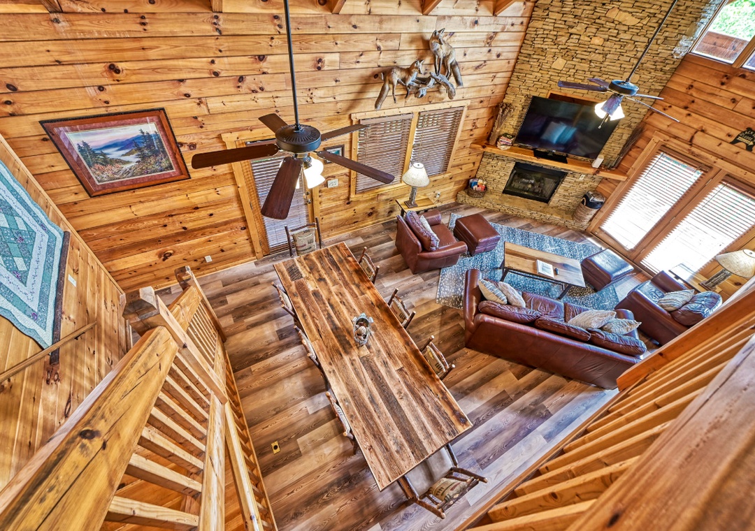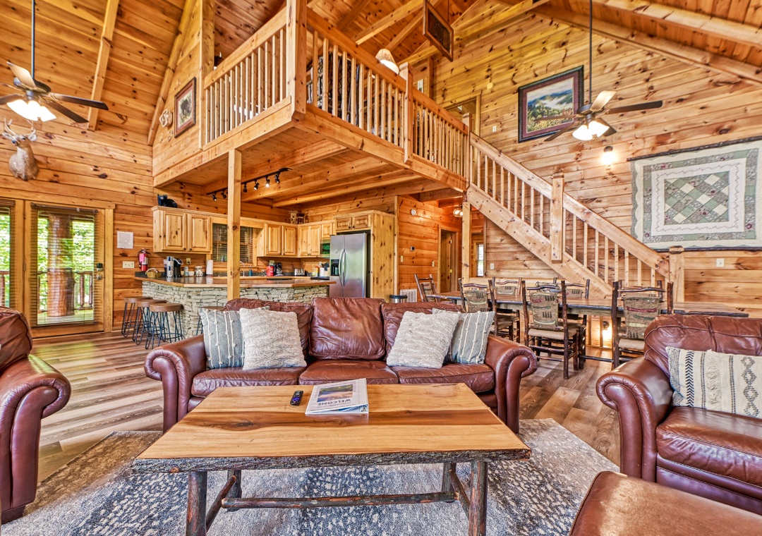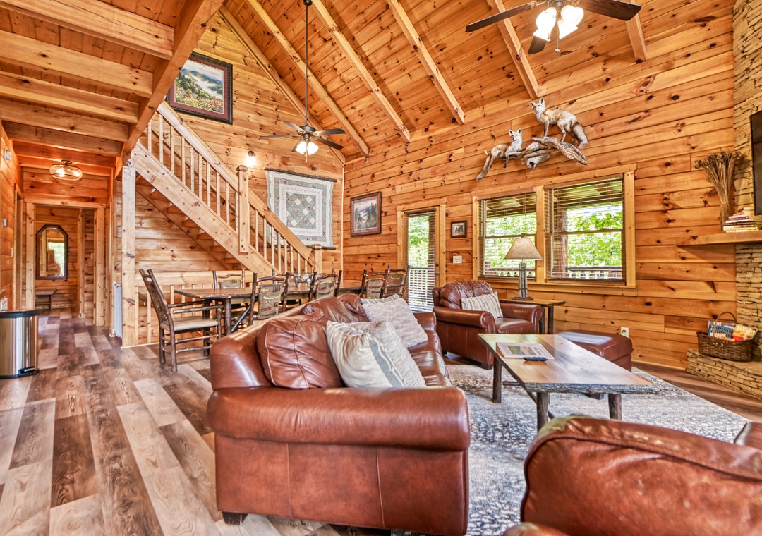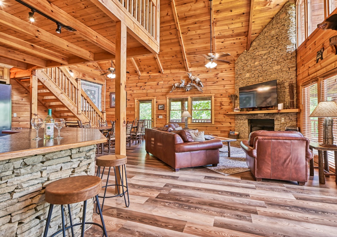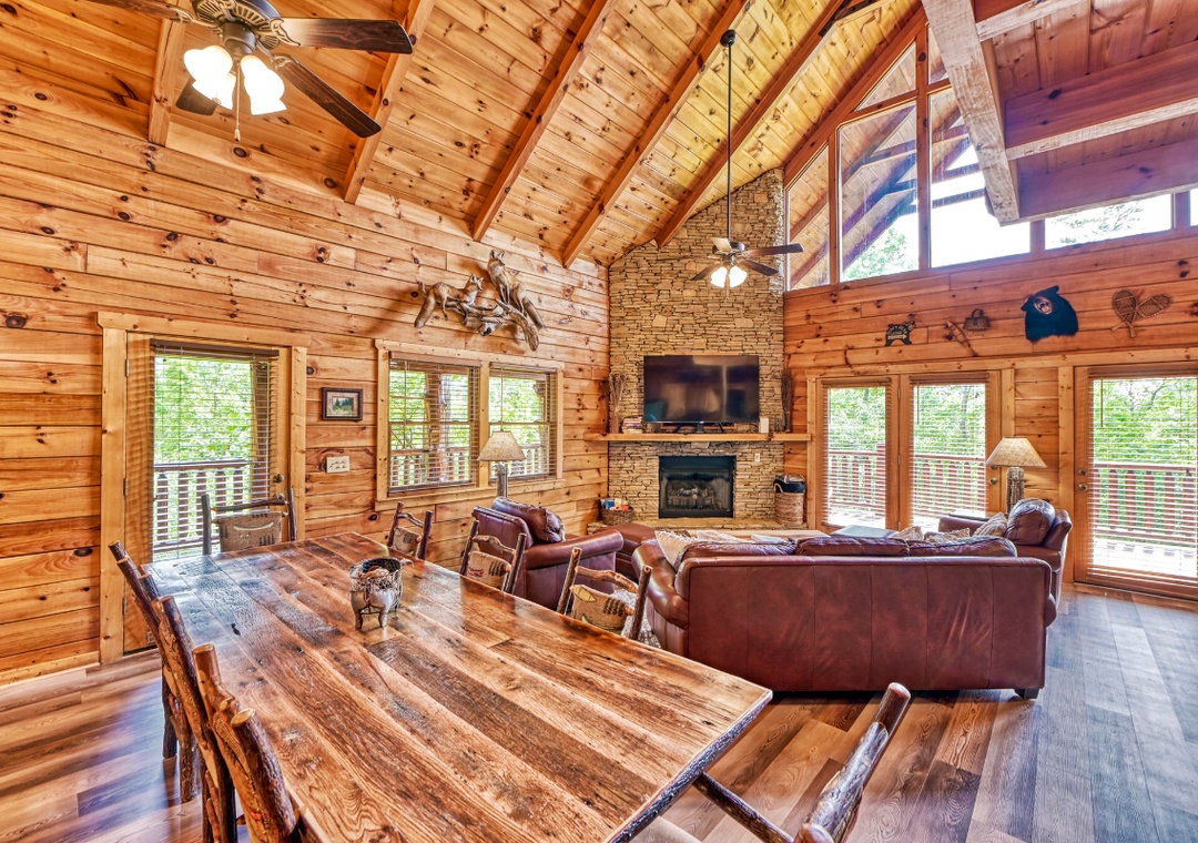 Upon entering, you're immediately welcomed by an open-concept living space filled with warmth and panoramic wooded views pouring in through expansive cathedral-style windows. The grand living room is the heart of the lodge with a large stone propane fireplace anchoring the space. Sink into plush sofas and turn on the 65” TCL Roku smart TV to stream your favorite shows. Just steps away, the fully equipped kitchen is a central gathering space where family and friends naturally come together. Also, find the spacious game room downstairs designed to bring people together with fun for all ages. A second propane fireplace keeps the space warm and inviting, while the 55” TCL Roku TV ensures that the entertainment never stops. Free WiFi is also available throughout the property.