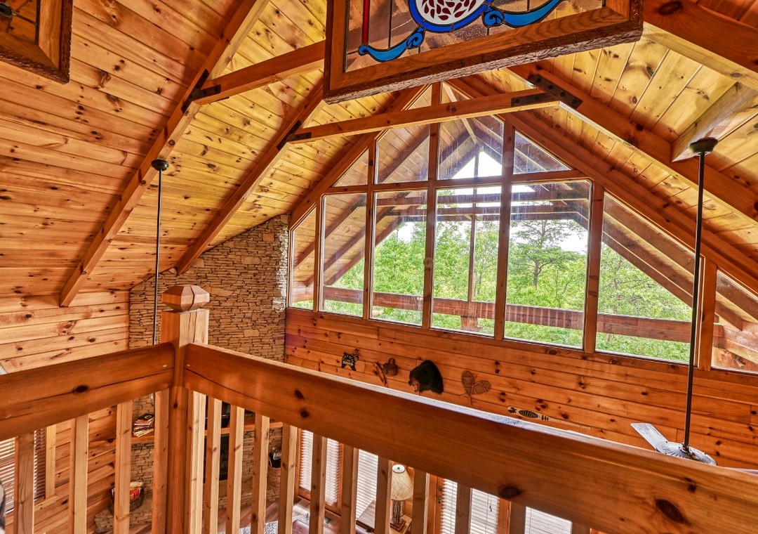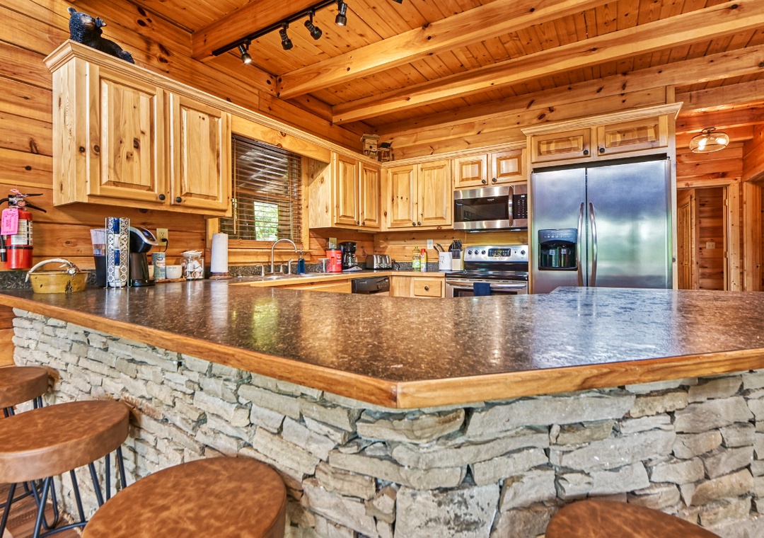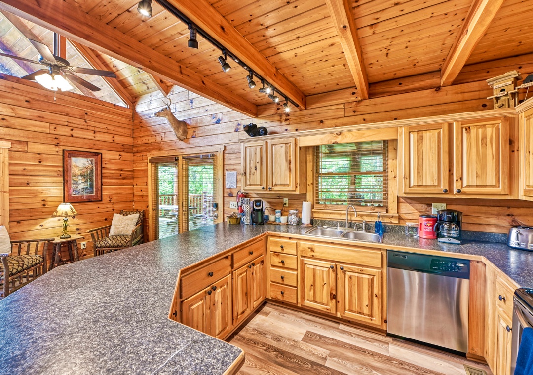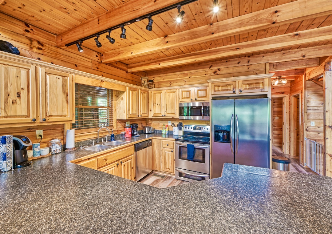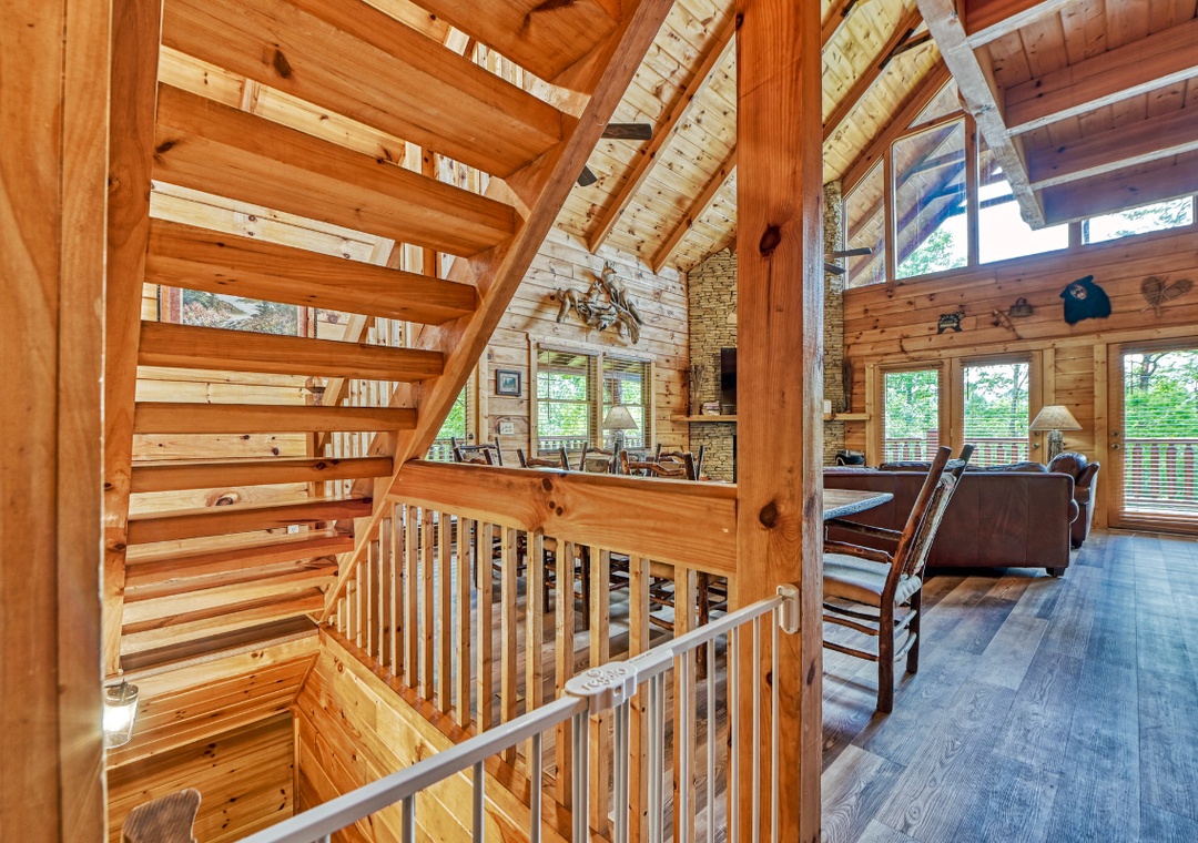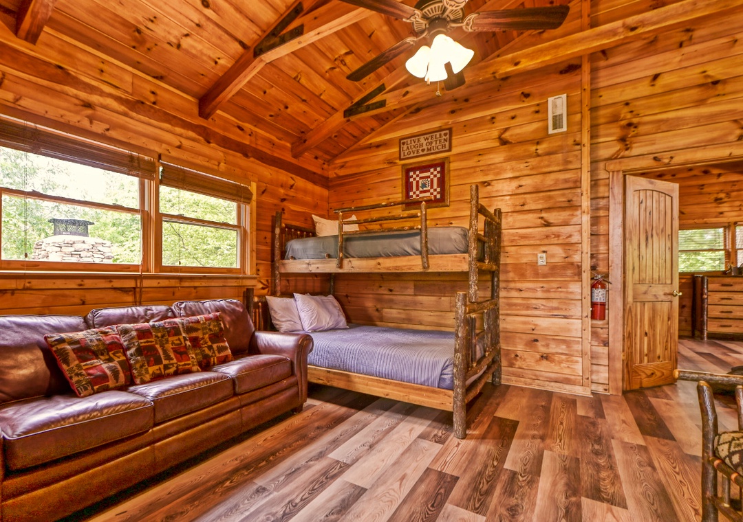 Upon entering, you're immediately welcomed by an open-concept living space filled with warmth and panoramic wooded views pouring in through expansive cathedral-style windows. The grand living room is the heart of the lodge with a large stone propane fireplace anchoring the space. Sink into plush sofas and turn on the 65” TCL Roku smart TV to stream your favorite shows. Just steps away, the fully equipped kitchen is a central gathering space where family and friends naturally come together. Also, find the spacious game room downstairs designed to bring people together with fun for all ages. A second propane fireplace keeps the space warm and inviting, while the 55” TCL Roku TV ensures that the entertainment never stops. Free WiFi is also available throughout the property.
