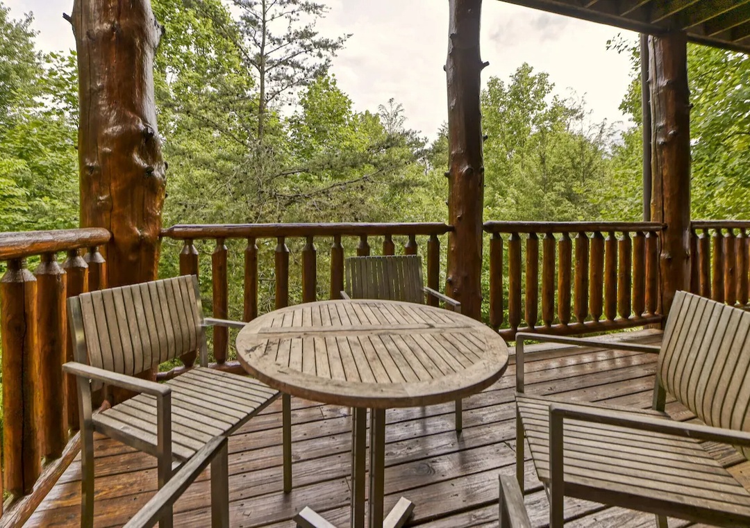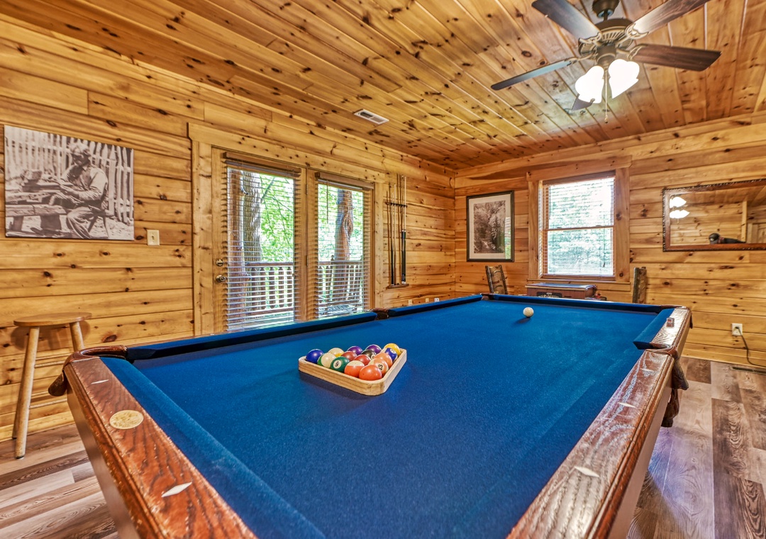 Start from the main level that features a cozy propane fireplace and a 65” TCL Roku smart TV. Stream your favorite shows, cue up a family movie night, or settle in for a sports-filled afternoon with all your streaming apps at your fingertips. Just off the living room, step onto the wrap-around deck and head over to the outdoor stone wood-burning fireplace, located on the front porch, where you can enjoy storytelling and s’mores under the stars. In the downstairs game room is where the fun really comes to life. Here, you'll find a 55" TCL Roku TV, perfect for gaming or streaming, with plenty of ports available to connect your own video game devices. A pool table sits at the center of the game room, inviting endless hours of friendly competition. For arcade lovers, the multicade arcade is packed with dozens of classic games that span generations. A propane fireplace also keeps the game room cozy in cooler months, making it a year-round hangout zone. But the entertainment doesn’t stop indoors. Step out onto the lower-level porch and discover the bubbling hot tub. It’s the perfect place to unwind after a day exploring the Smokies. Sit back with a drink, let the bubbles ease your muscles, and enjoy the quiet solitude or chat with friends as the sun sets. Just steps away, a cornhole game is also set up on the deck. Beyond the lodge, “Mountain Song” offers access to seasonal community pools in the Cobbly Nob neighborhood, where you can cool off on warm summer days. And if golf is your game, you're just minutes from the Bent Creek Golf Course, designed by golf legend Gary Player.