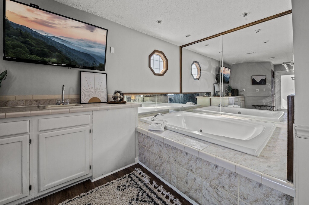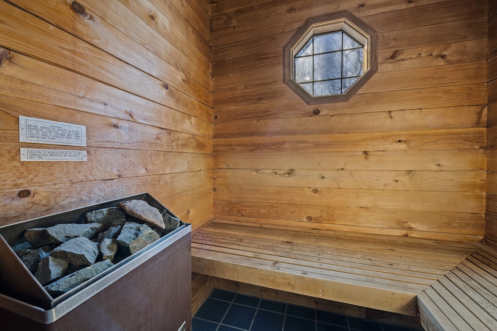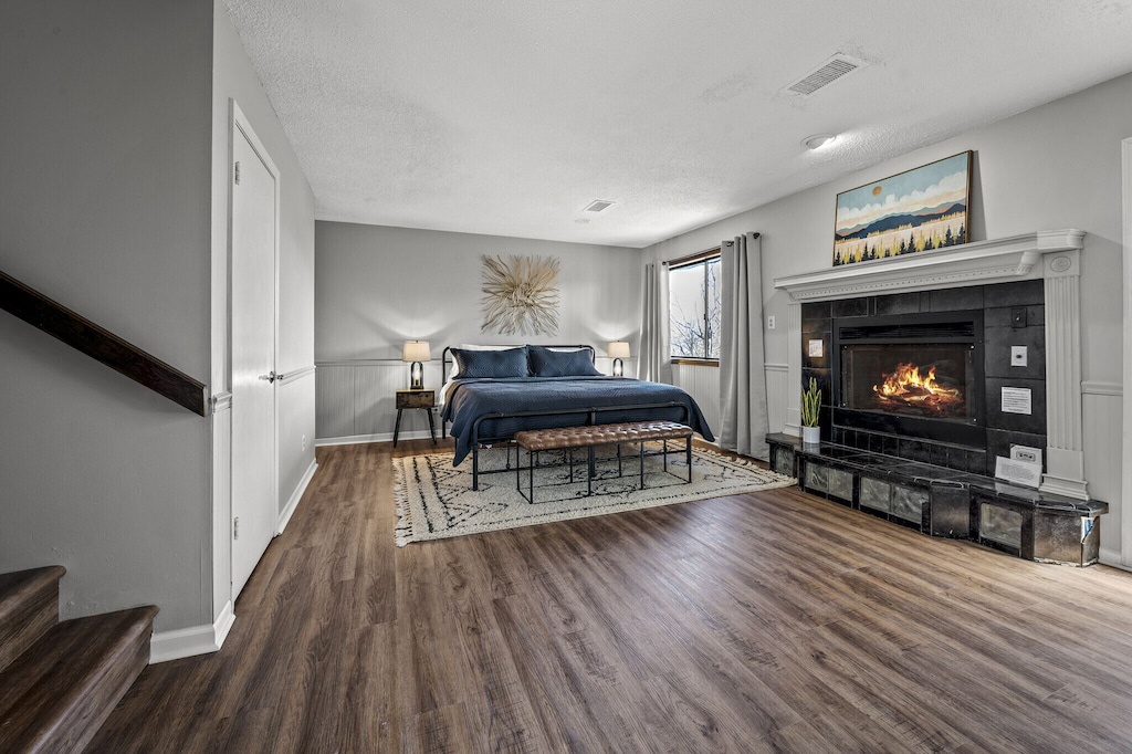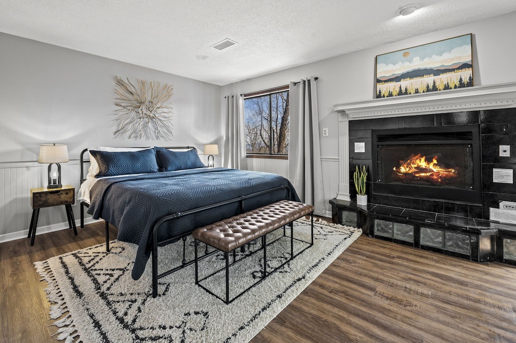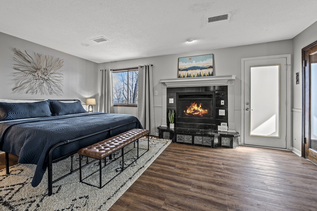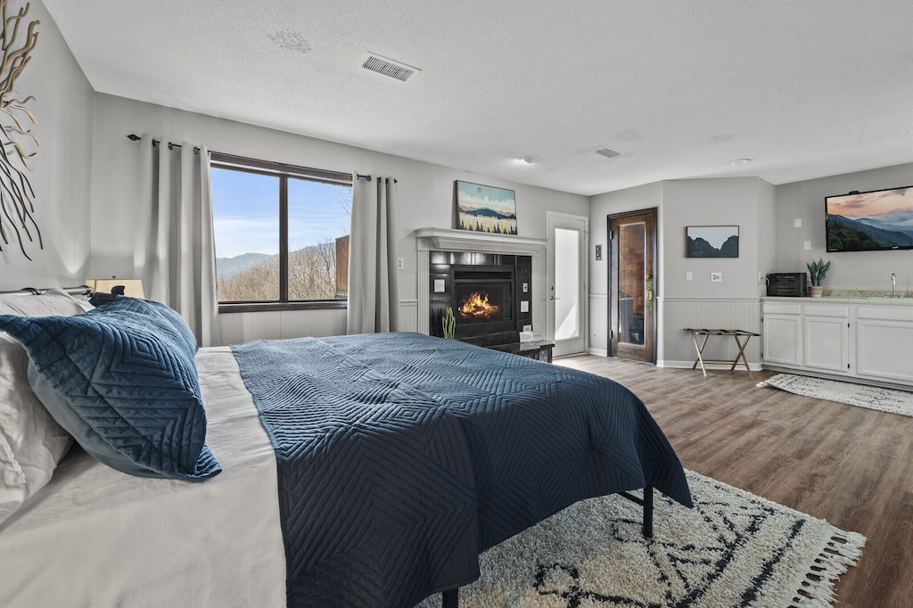 Primary bedroom includes a King-sized bed + jacuzzi tub + sauna + fireplace!