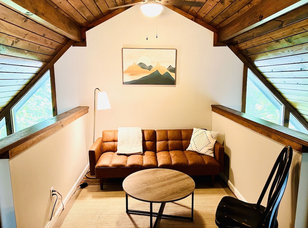 Loft Area (upstairs): Open and airy loft area with a sleeper sofa and TV
