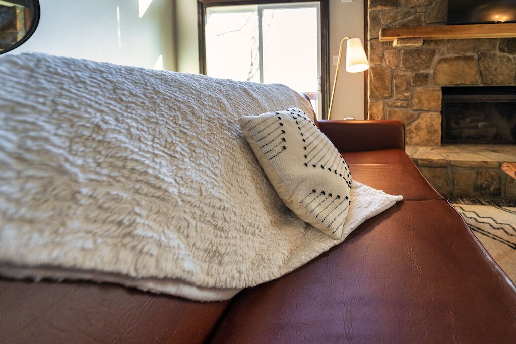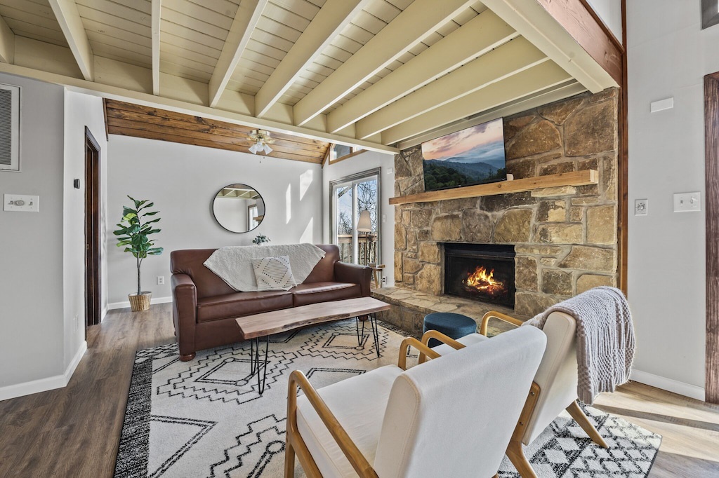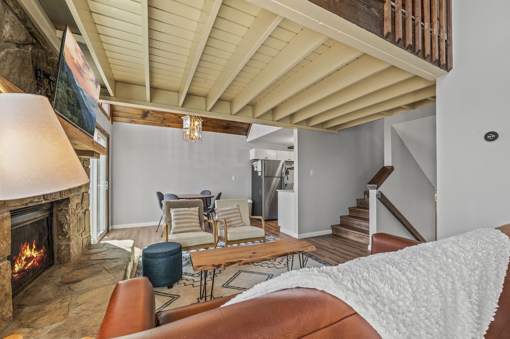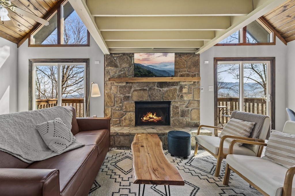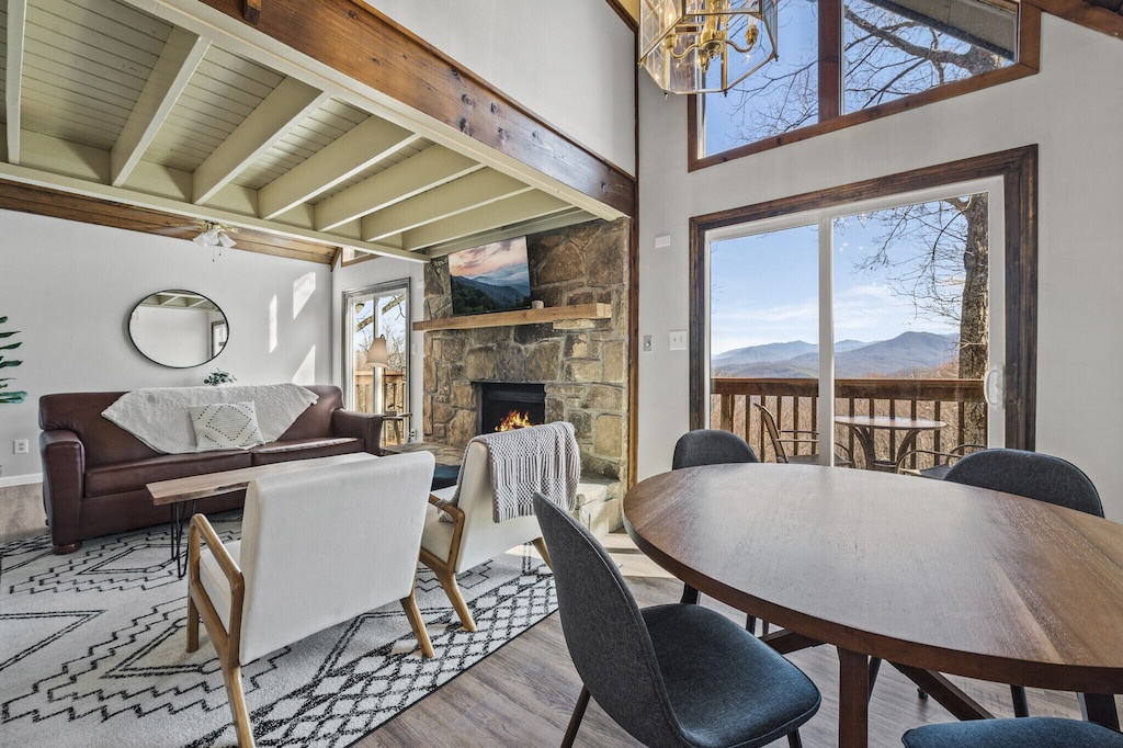 Romantic mountain home with modern decor; Open living room with large stone fireplace, comfy furniture, and tons of windows with views; Separate dining room area and fully equipped kitchen; Enjoy the indoor sauna, jacuzzi tub, and bedroom fireplace; Outside, relax in the hot tub overlooking the scenic views or enjoy dinner on the balcony while taking in the fresh mountain air while sipping a glass of wine.