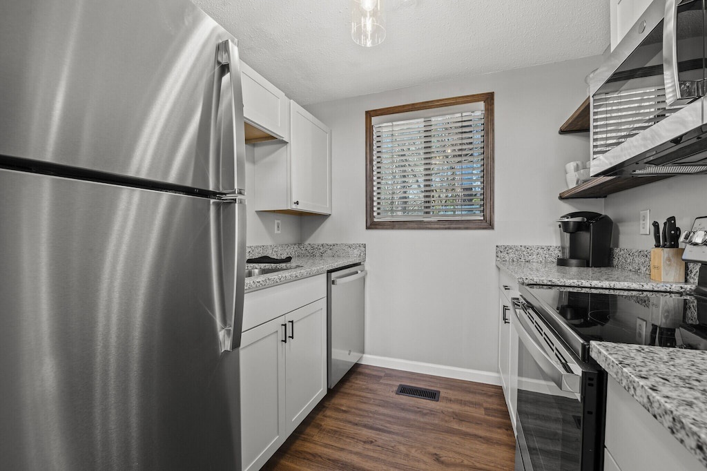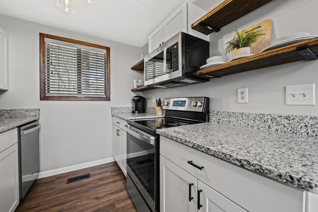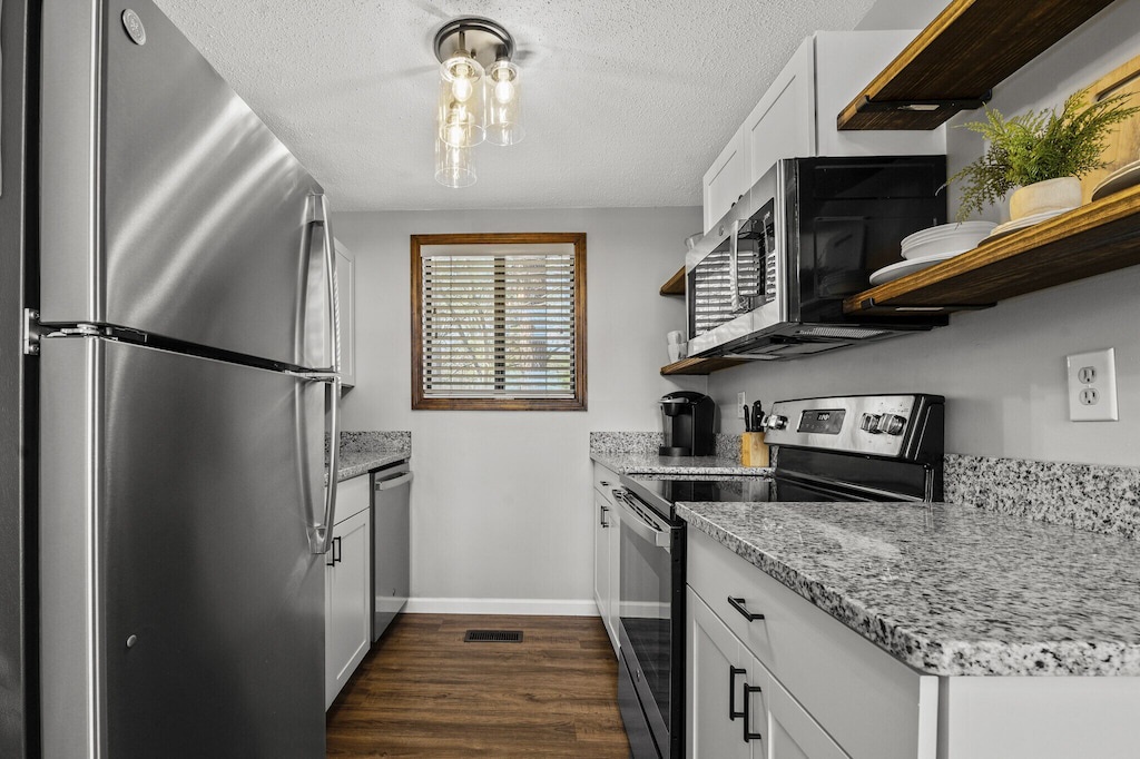 Modern and newly remodeled kitchen with full-sized refrigerator, dishwasher, stove, microwave, and other kitchen appliances perfect for making breakfast, lunch, or dinner throughout your stay! All pots, pans, glasses, plates, silverware, etc. are also there for you. There is also plenty of seating at the dining room table that is located right off the kitchen with tons of natural light coming in from the windows and balcony.