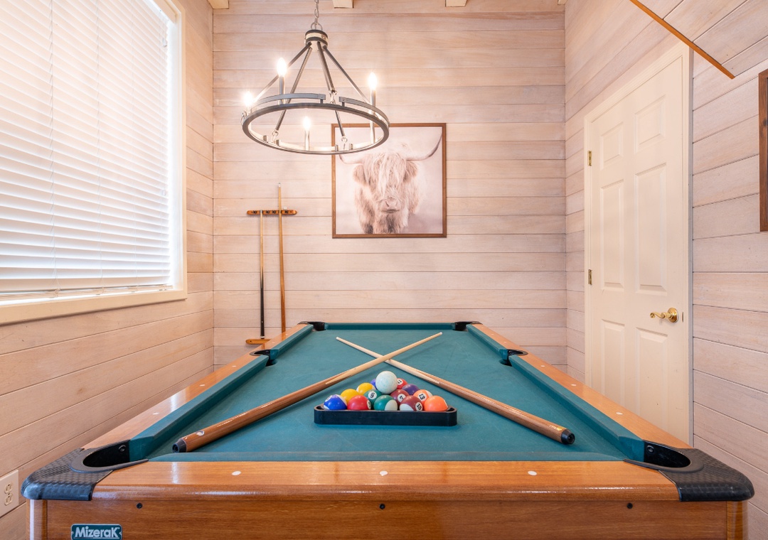 As you step inside, you’re greeted by a pool table and the warm glow of a propane fireplace, the heart of the living room. Its crackling flames create a cozy ambiance, perfect for curling up with a good book, enjoying a movie, or simply basking in its warmth after a day of exploring. Upstairs in the loft, you’ll find a twin bed over a twin trundle, ensuring hours of relaxation without ever needing to leave the comfort of your cabin. The kitchen is fully equipped with everything you need to whip up delicious meals, from hearty breakfasts to romantic dinners while the adjacent dining area provides a cozy spot to enjoy your meals together. And when it’s time to unwind, the main bedroom offers a serene retreat. The comfortable bed invites you to sink in and drift off into peaceful sleep, while the soft lighting and tasteful decor enhance the cozy vibe. Free WiFi is also available throughout the property.