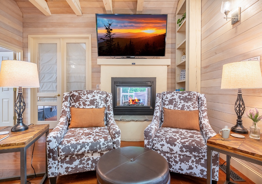 One of the cabin’s standout features is the see-through fireplace, enjoyed from the cozy living room and from outside near the hot tub — a rare and special amenity that makes evenings relaxing year-round.