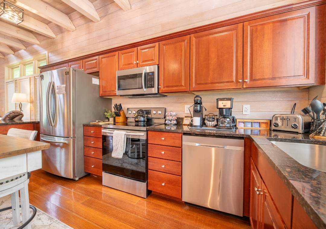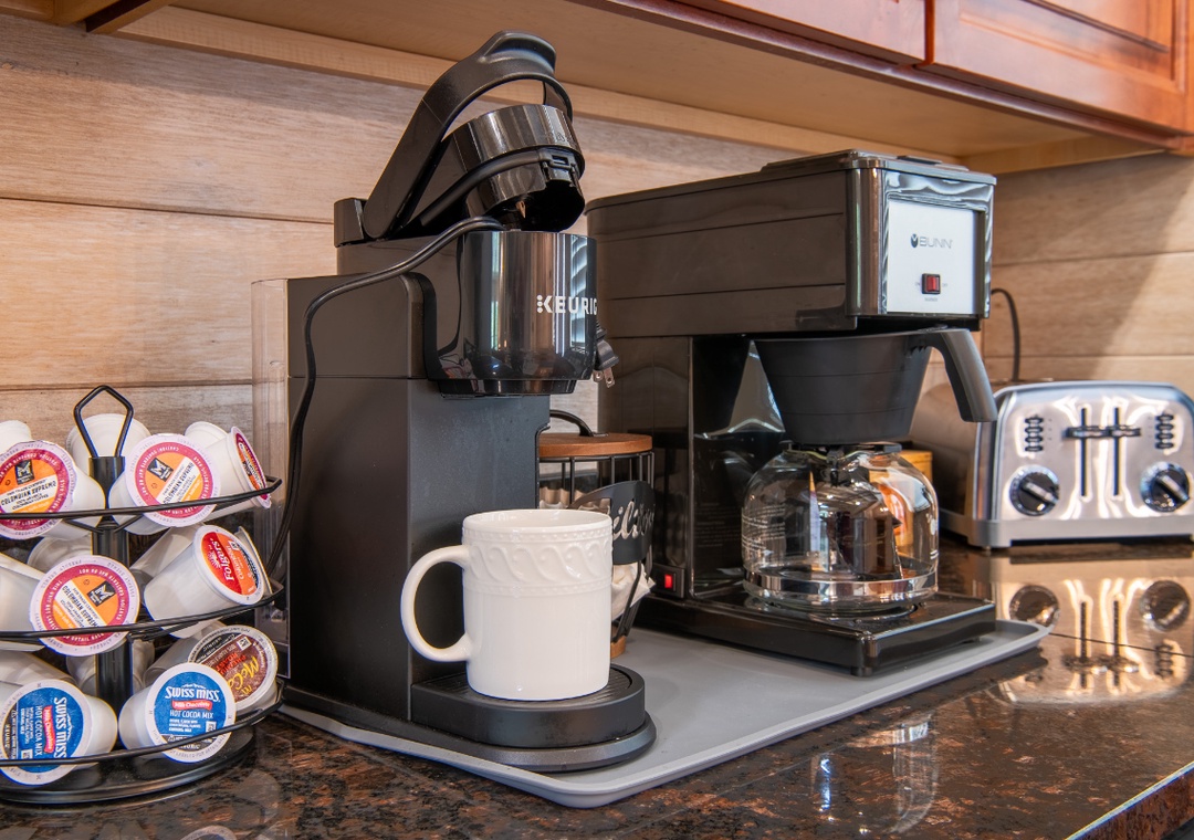 Full-size appliances and a dishwasher. Cookware (pots, pans, baking sheets, casserole dishes, plates, glasses, silverware), blender, crockpot, and more – essentially everything needed to prepare meals. Cooking essentials also stocked with basic cooking supplies like spices, cooking sprays, salt and pepper, dishwashing detergent pods, and other pantry staples. Coffee bar with K-cups, hot chocolate, and tea all provided, and a full-size coffee maker