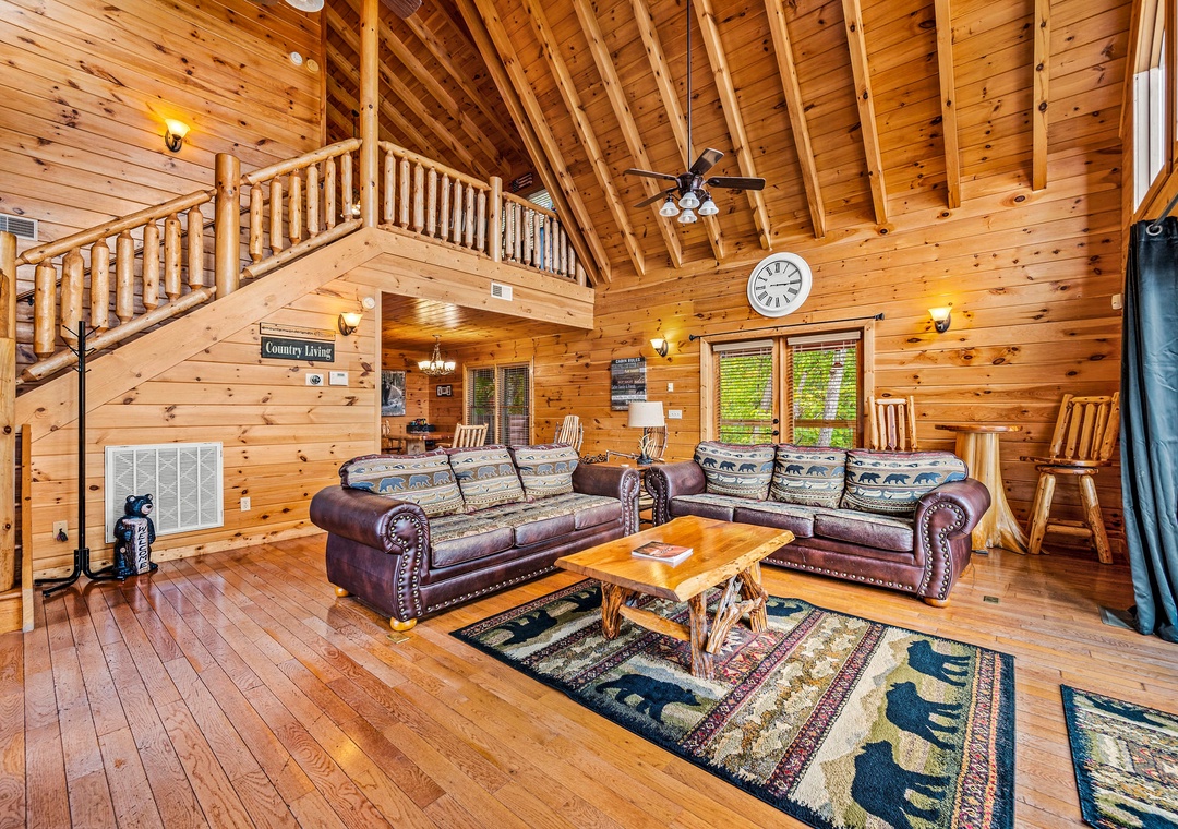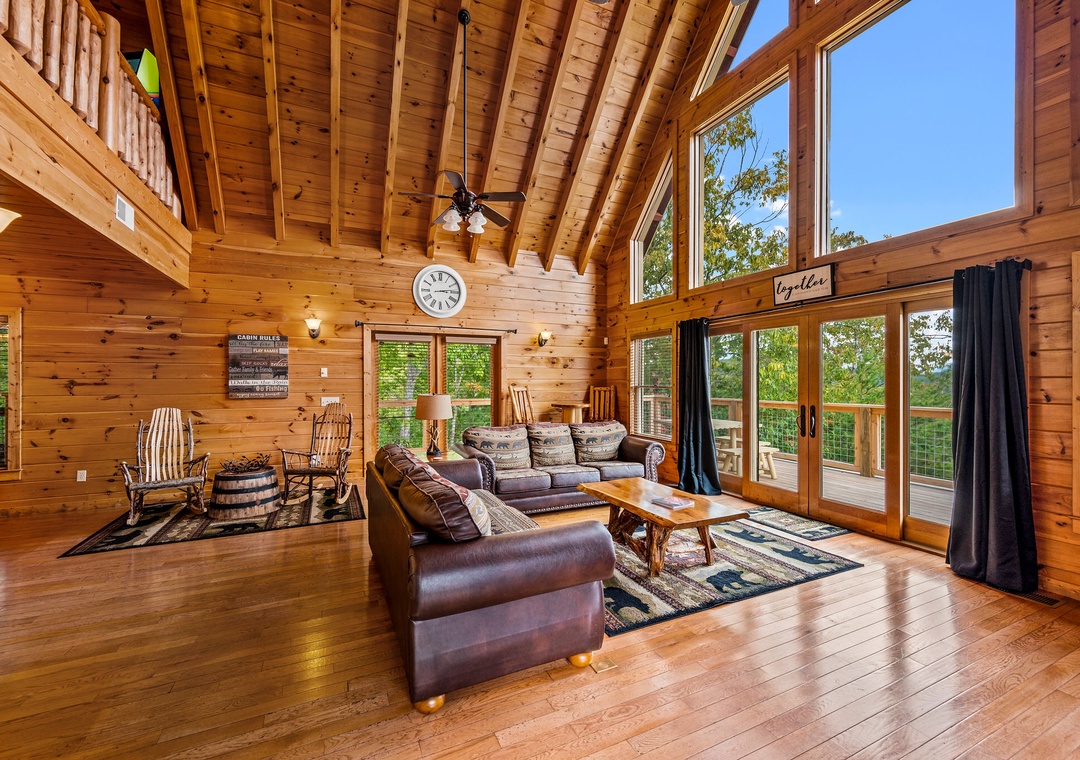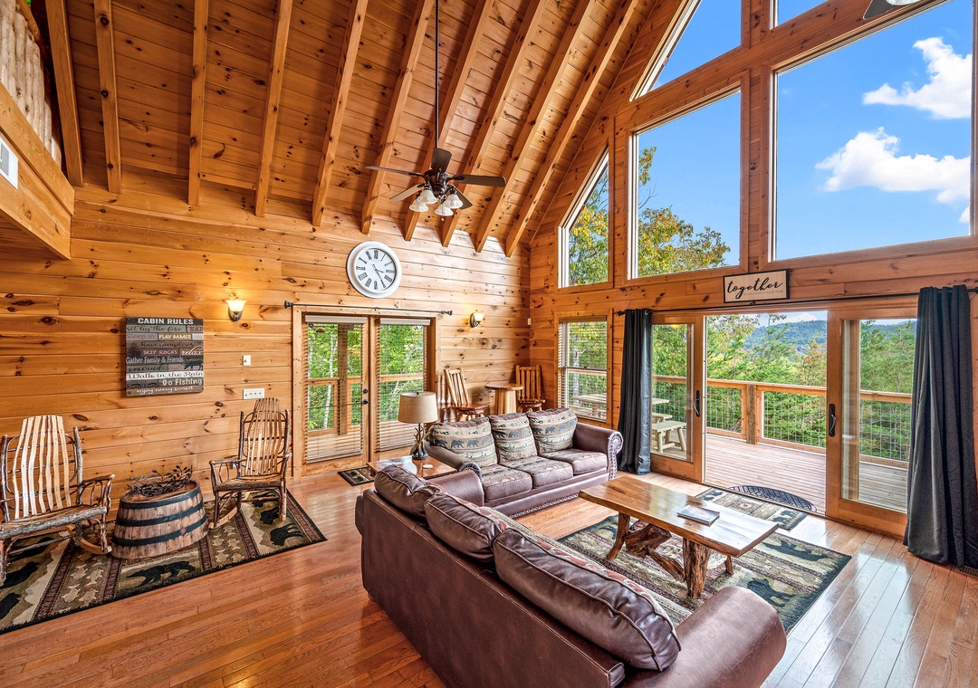 Newly furnished lodge with modern mountain decor; Open living room with soaring ceilings and large stone fireplace, comfy leather furniture and tons of windows with views; Smart TVs throughout; Modern and fully equipped Kitchen; Large Dining Area; Separate Game Room with Pool Table; Free WiFi