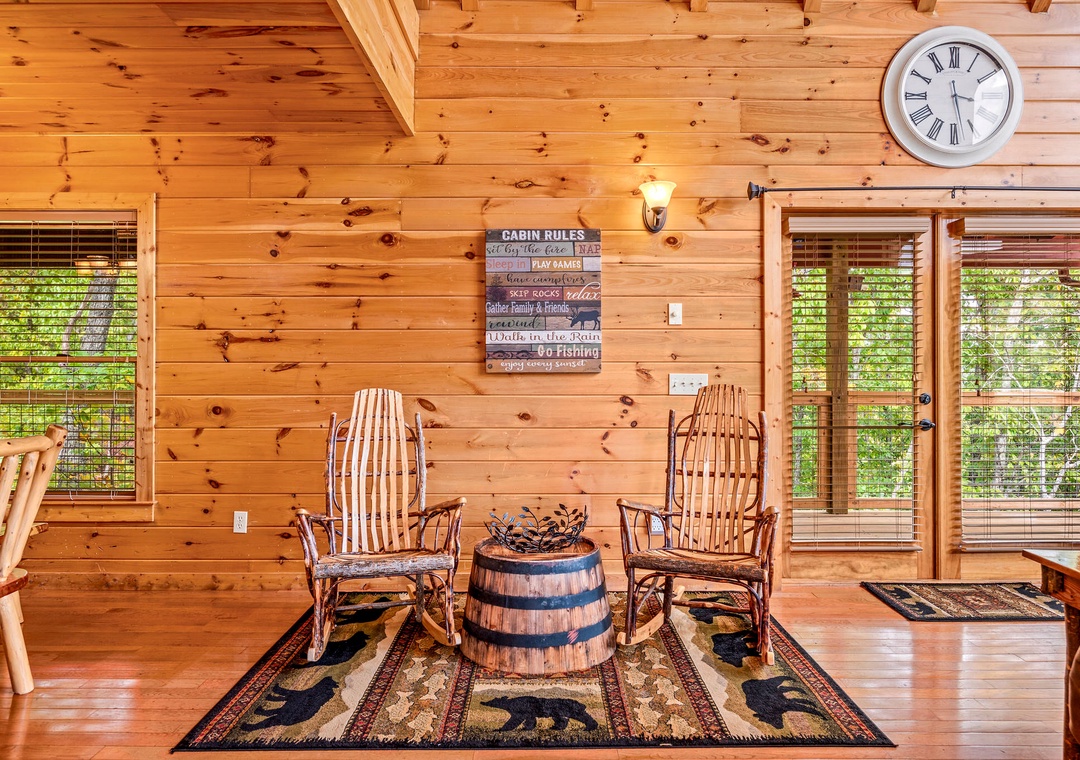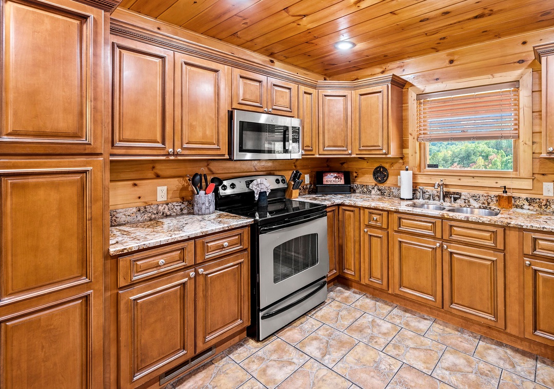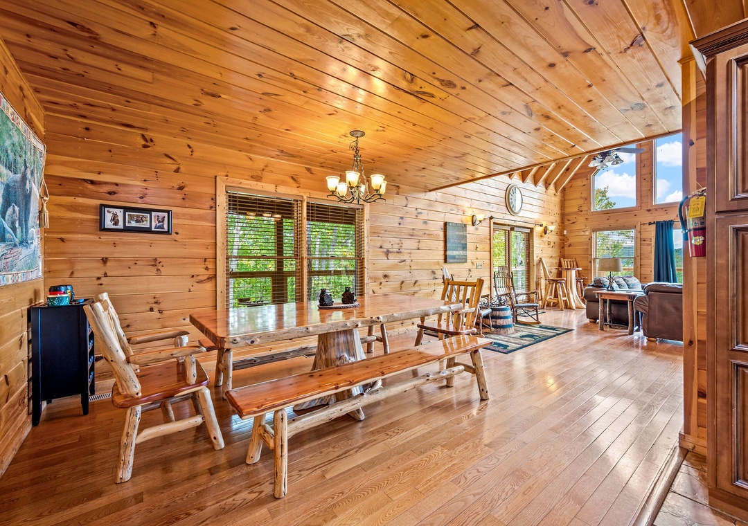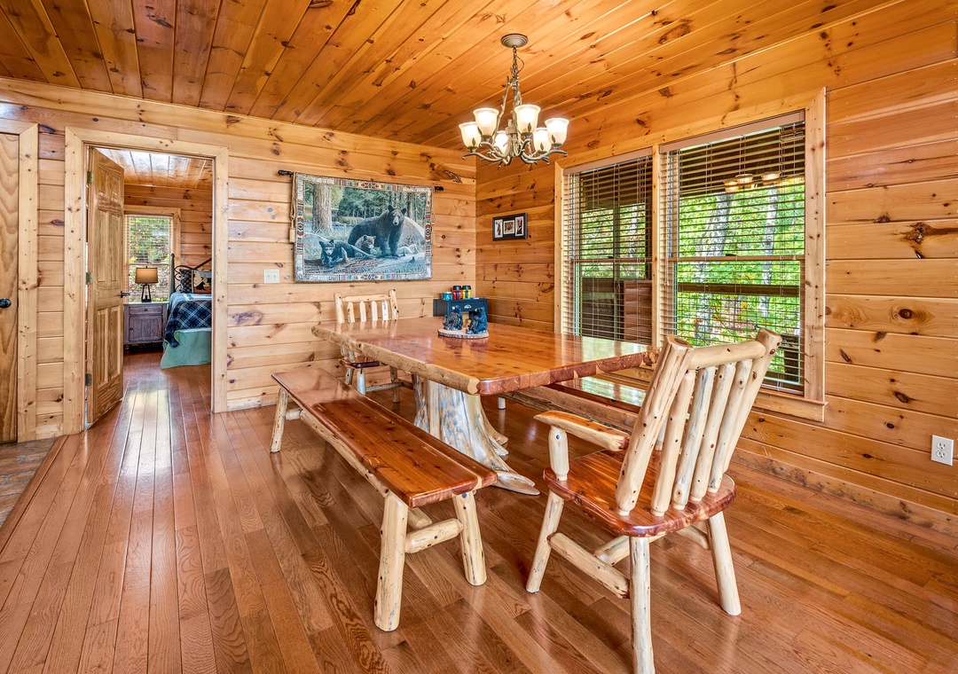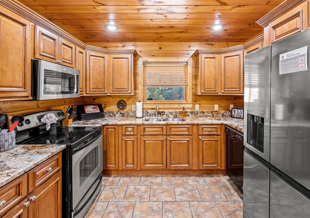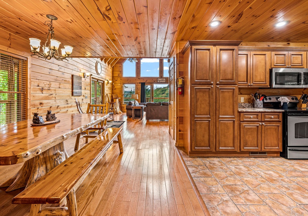 Mountain Wonderland is the perfect place to both relax and play! The living room boasts a huge stone fireplace and large flat screen TV, perfect for cuddling by the fire or snuggling up for a family move night. Step upstairs into the game room, and you are met with a large pool table, flat screen TV and, of course, views! Step outside onto one of the covered balconies and you are greeted with scenic views. And outside, you can it back and relax in the swing chair, roast marshmallows in the stone firepit, or sit back in a rocking chair while sipping your morning cup of coffee or evening glass of wine. You’ll also love our lodge's private hot tub perfect for soaking in the warm water after a long day of exploring. And there’s even several tables where your entire crew can dine outside and take in the fresh Smoky Mountain air. Mountain Wonderland has a little bit of everything for every one!