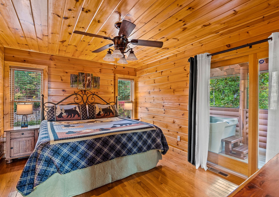 Bedroom #1 (Main Level): Spacious bedroom retreat with King-sized bed and attached full-sized bathroom + Jacuzzi Tub