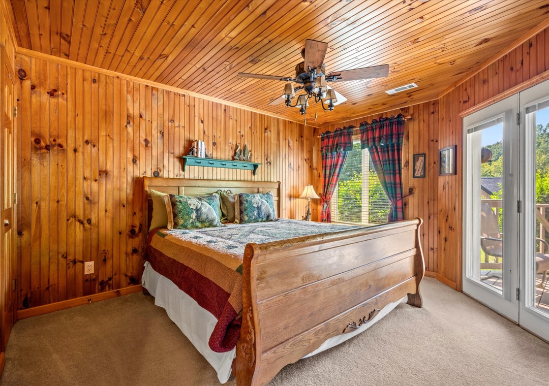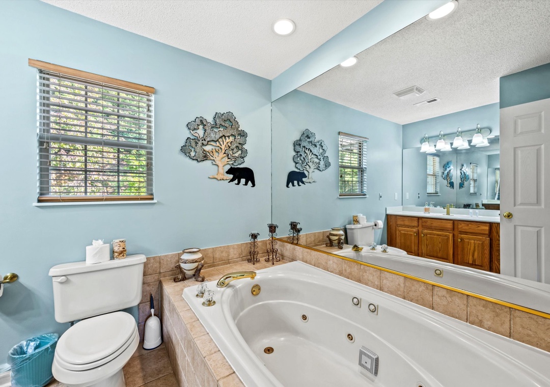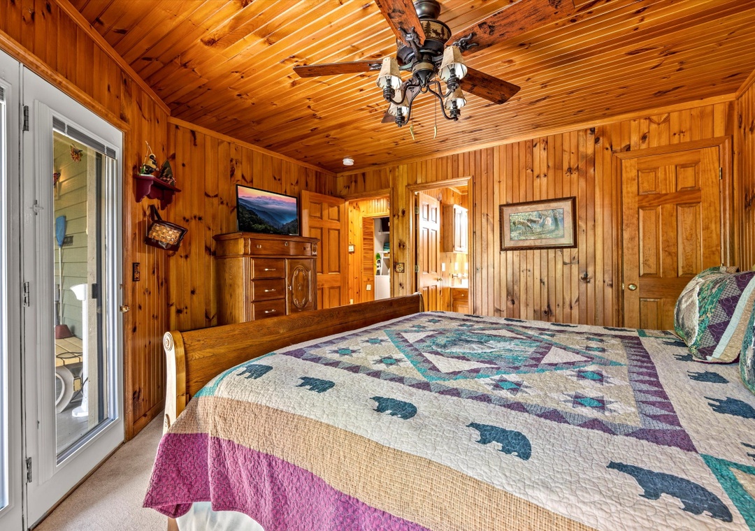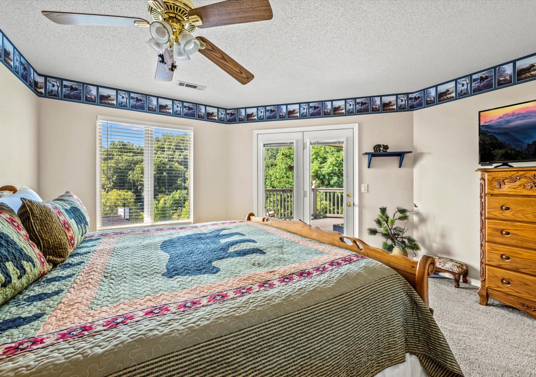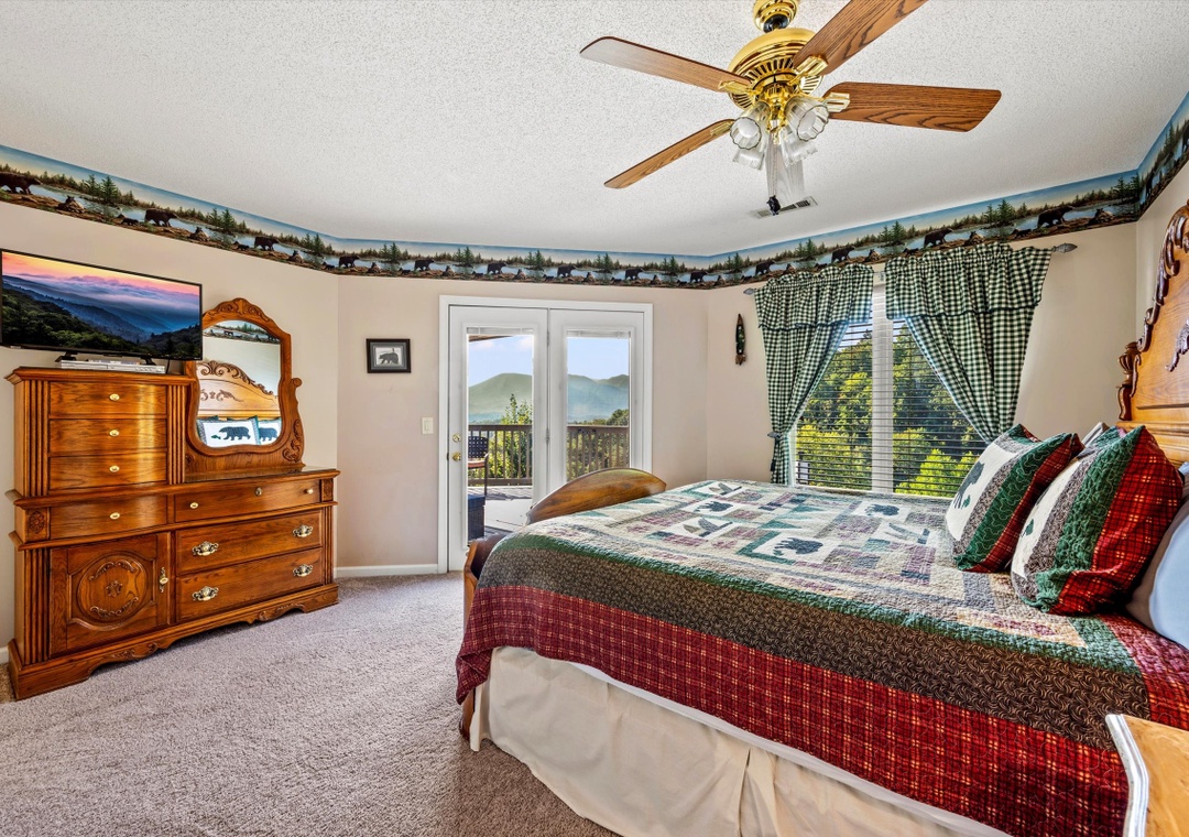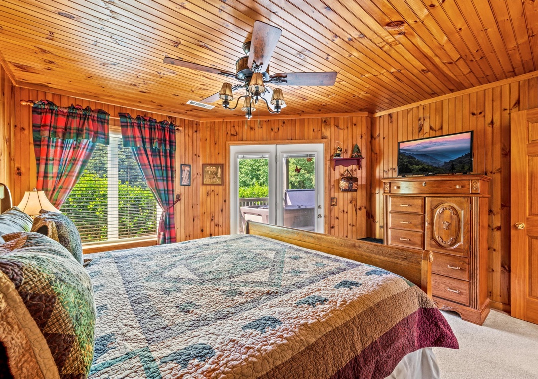 ✔ Bedroom #1 (Upper Level): Spacious Bedroom with a King-sized Bed and a Full-screen TV; Attached Full Bathroom with a Jacuzzi Tub