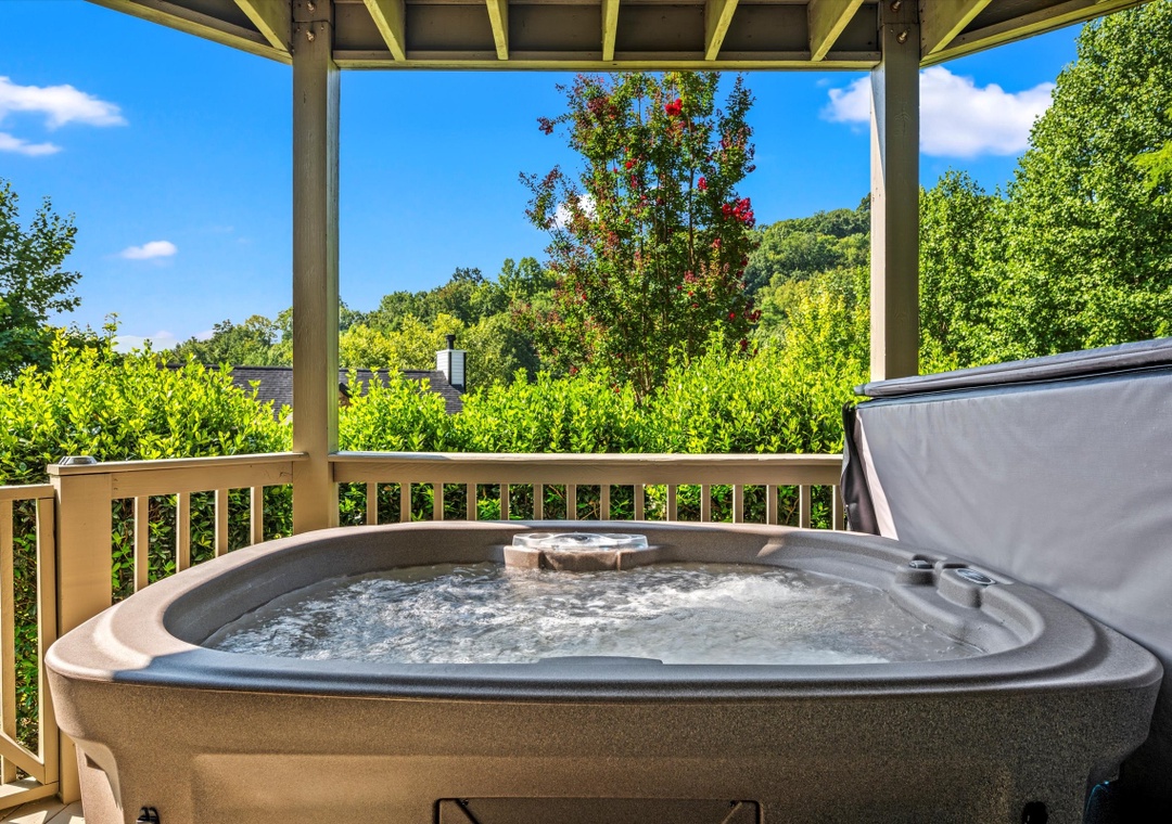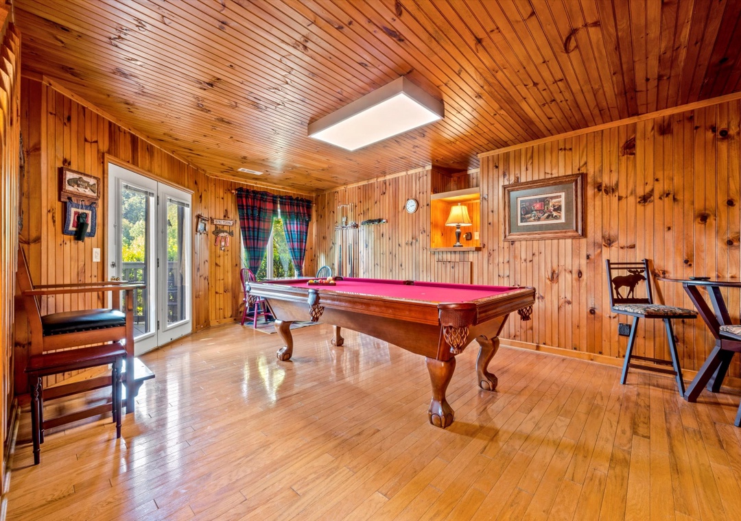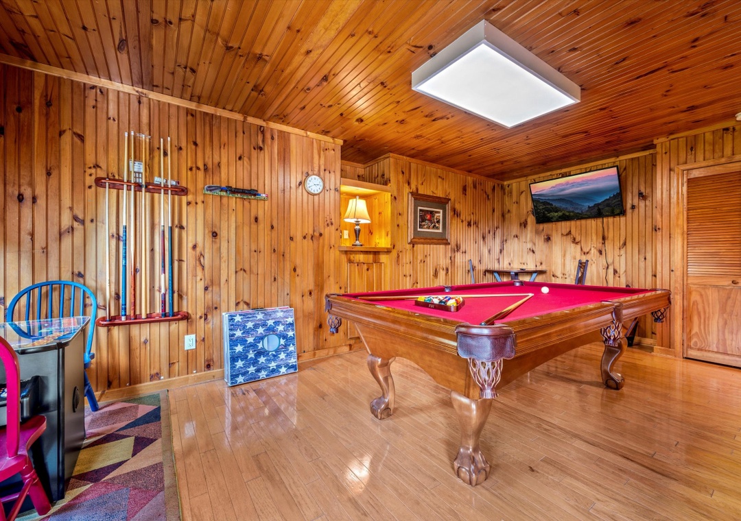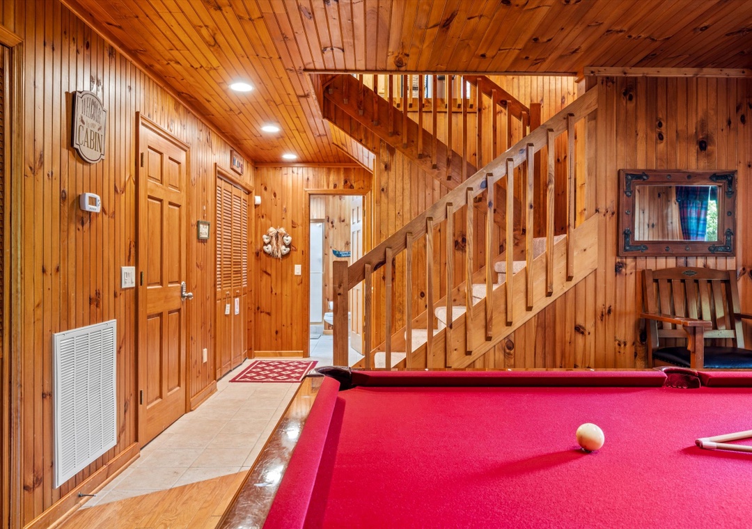 Whether you’re looking to unwind, have fun with friends and family, or enjoy a cozy night, our lodge offers a wealth of entertainment options that cater to every mood and occasion. Start in the inviting living area, centered around a warm and cozy propane fireplace – the perfect spot to gather with your loved ones for a movie night or to play board games as the fire crackles in the background. Downstairs, the lower level is where the fun truly begins. At the heart of the game room is a full-size pool table, where you can challenge friends and family to endless rounds of friendly competition. The room is also set up with an arcade and additional seating, so everyone can watch the action or take a break between games. Just outside the game room, on the lower-level deck, you’ll find the lodge’s private hot tub. This is the ultimate relaxation spot, where you can unwind and soak in the bubbling warmth while taking in the stunning mountain views. Imagine ending your day with a soothing dip in the hot tub, surrounded by the peace and serenity of the Smokies.