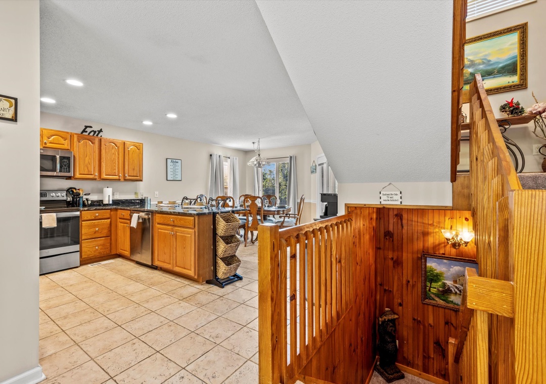 As you step through the front door, you are immediately welcomed into the expansive open-concept living area, where the warmth of the lodge envelops you. The plush seating arrangement is centered around a beautiful propane fireplace, which not only provides warmth on cool mountain evenings but also adds a comforting ambiance that invites you to unwind. Connected seamlessly to the living area is the fully-equipped kitchen, a chef's dream with its modern appliances and ample counter space. For those who enjoy a bit of indoor fun, the lower level of “Mountains 4 Miles” is home to a game room that promises hours of entertainment. Free WiFi is also available throughout the property.
