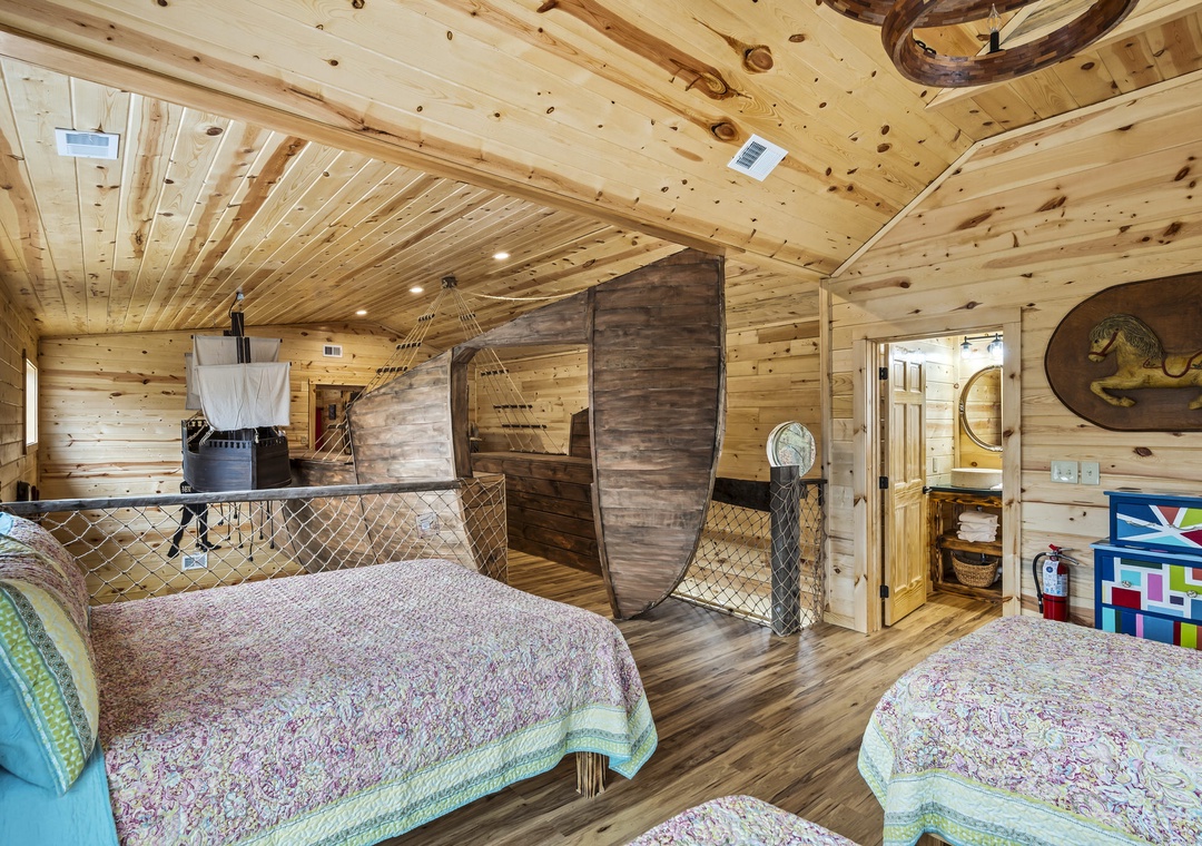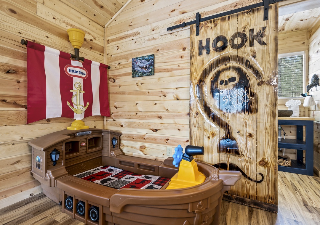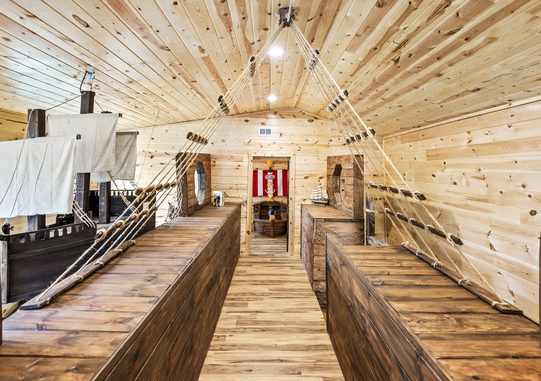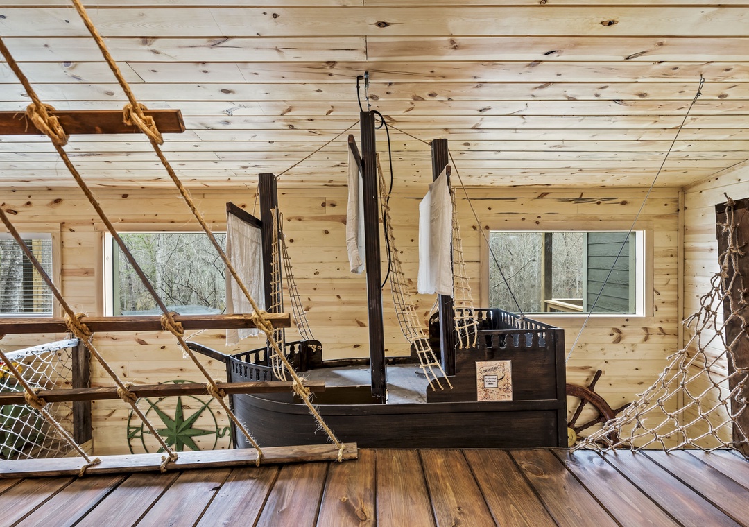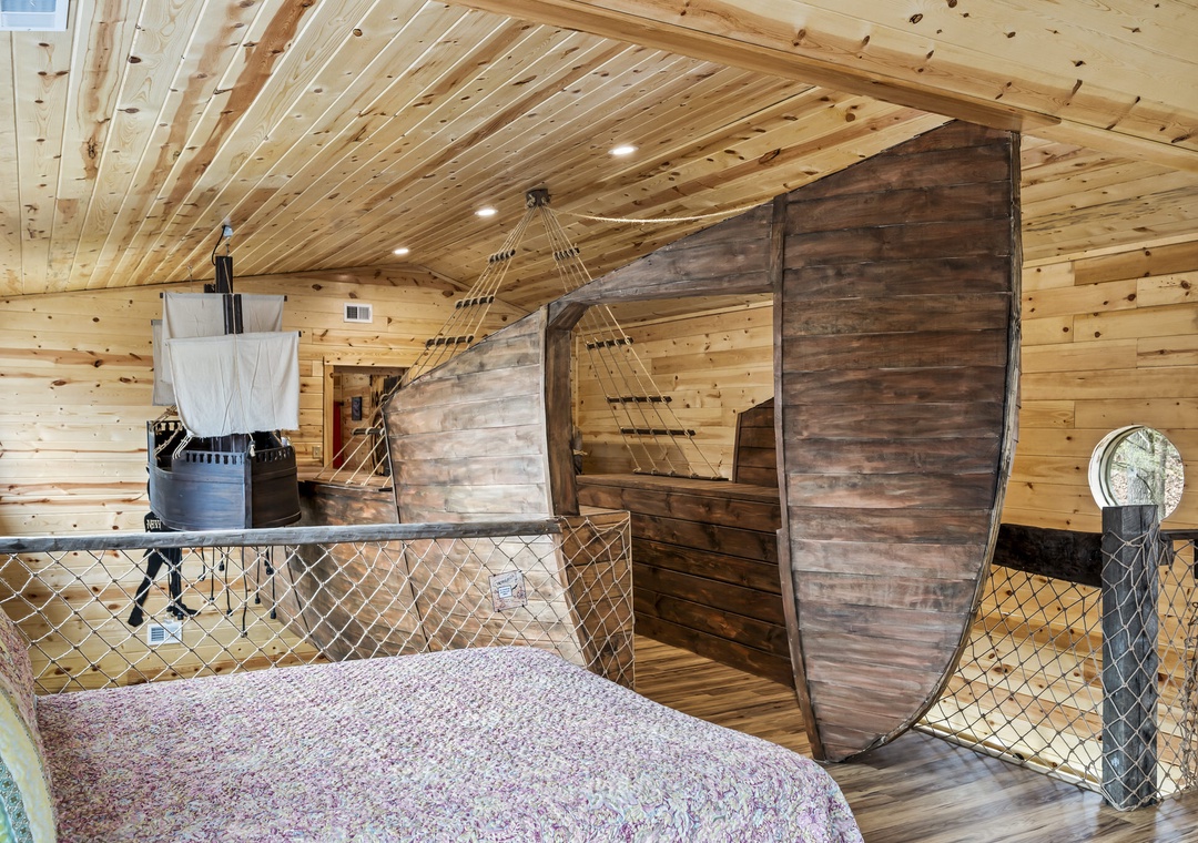 “Neverland” offers a plethora of entertainment options designed to delight guests of all ages. As you step inside, the first thing you'll notice is the vibrant and whimsical loft, designed to resemble a playful ark. Ascend the spiral stairs and let your imagination run wild as you explore this fantastical space, complete with a toy pirate ship waiting to set sail on imaginary seas. Back on the main level, challenge each other to a friendly competition on the Multicade Arcade, where classic games await. And when it's time to unwind outdoors, the expansive deck offers the perfect setting for relaxation and fun. Gather around on the outdoor seating area and relax under the starlit sky, or simply soak in the serene beauty of the wooded surroundings while enjoying your evening glass of wine. Also find the bubbling hot tub, which offers another way to unwind while taking in the peaceful mountain air. In the summer months, you will have access to an outdoor shared pool just a few steps away! Whether you're looking to take a refreshing swim, lounge poolside, or play water games with the family, this shared amenity adds another layer of fun to your stay. And let's not forget about the cabin's proximity to downtown Gatlinburg, just minutes away. Here, you'll discover a world of entertainment options, from charming shops and delicious dining to exciting attractions and live entertainment.