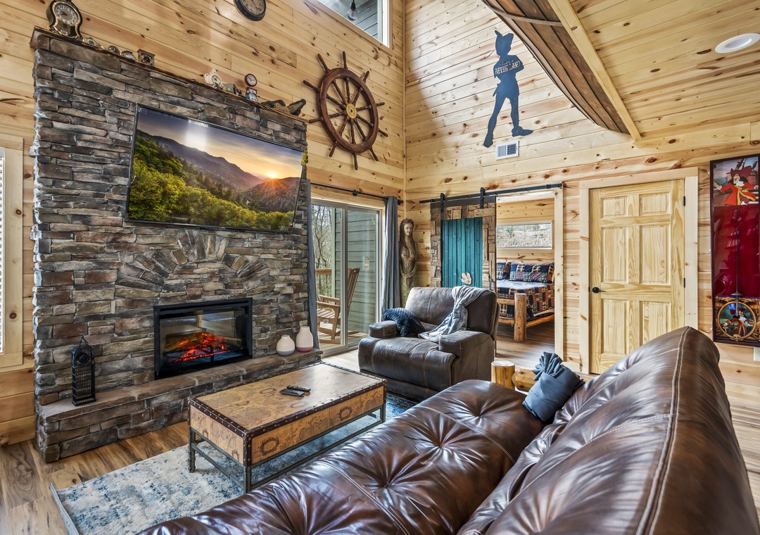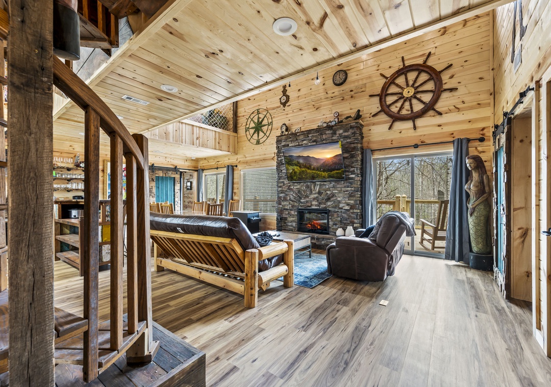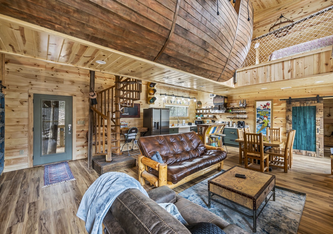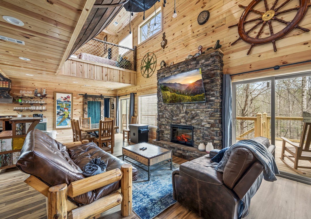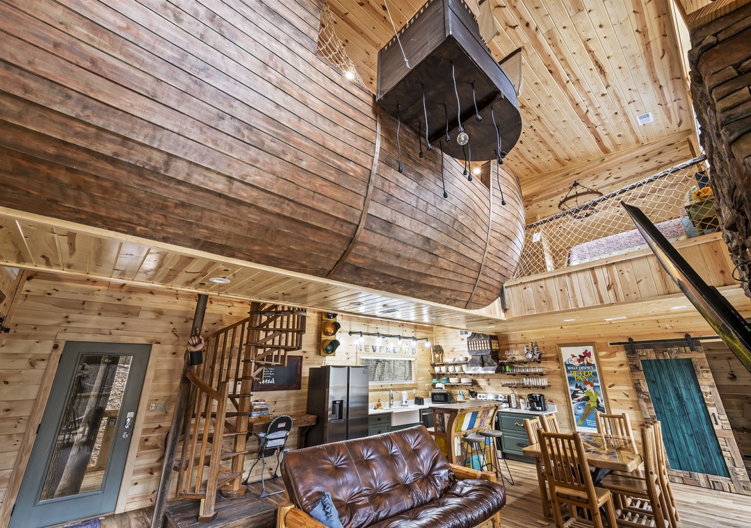 “Neverland” offers a plethora of entertainment options designed to delight guests of all ages. As you step inside, the first thing you'll notice is the vibrant and whimsical loft, designed to resemble a playful ark. Ascend the spiral stairs and let your imagination run wild as you explore this fantastical space, complete with a toy pirate ship waiting to set sail on imaginary seas. Back on the main level, challenge each other to a friendly competition on the Multicade Arcade, where classic games await. And when it's time to unwind outdoors, the expansive deck offers the perfect setting for relaxation and fun. Gather around on the outdoor seating area and relax under the starlit sky, or simply soak in the serene beauty of the wooded surroundings while enjoying your evening glass of wine. Also find the bubbling hot tub, which offers another way to unwind while taking in the peaceful mountain air. In the summer months, you will have access to an outdoor shared pool just a few steps away! Whether you're looking to take a refreshing swim, lounge poolside, or play water games with the family, this shared amenity adds another layer of fun to your stay. And let's not forget about the cabin's proximity to downtown Gatlinburg, just minutes away. Here, you'll discover a world of entertainment options, from charming shops and delicious dining to exciting attractions and live entertainment.