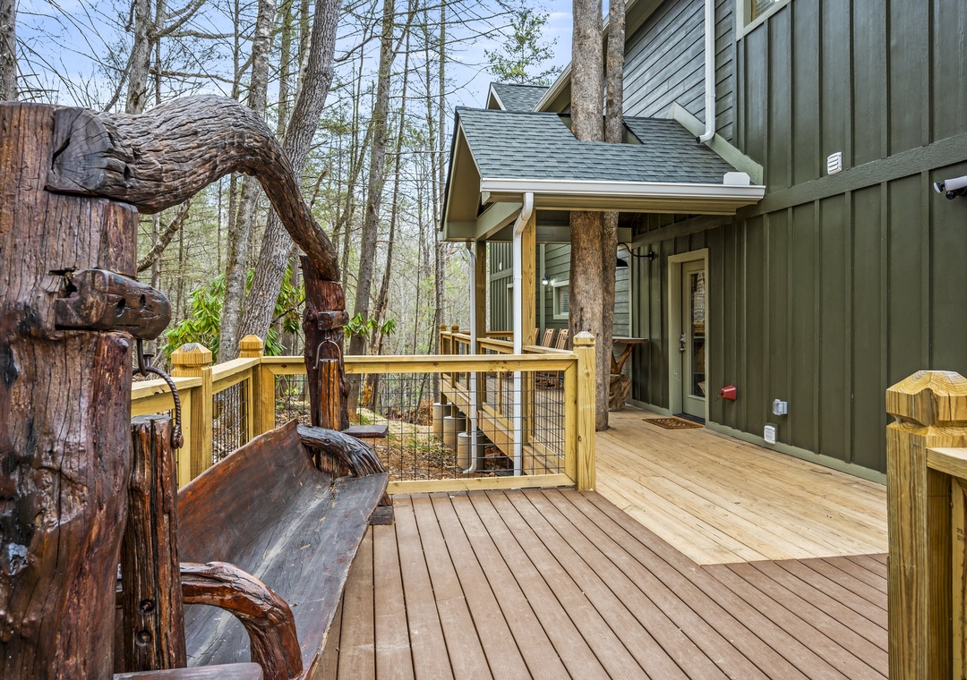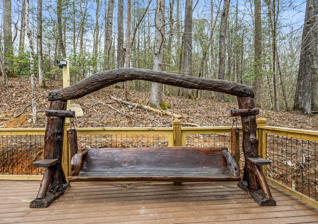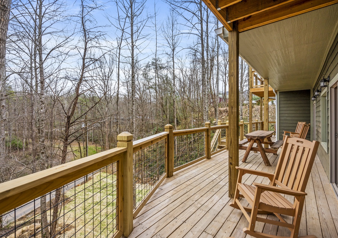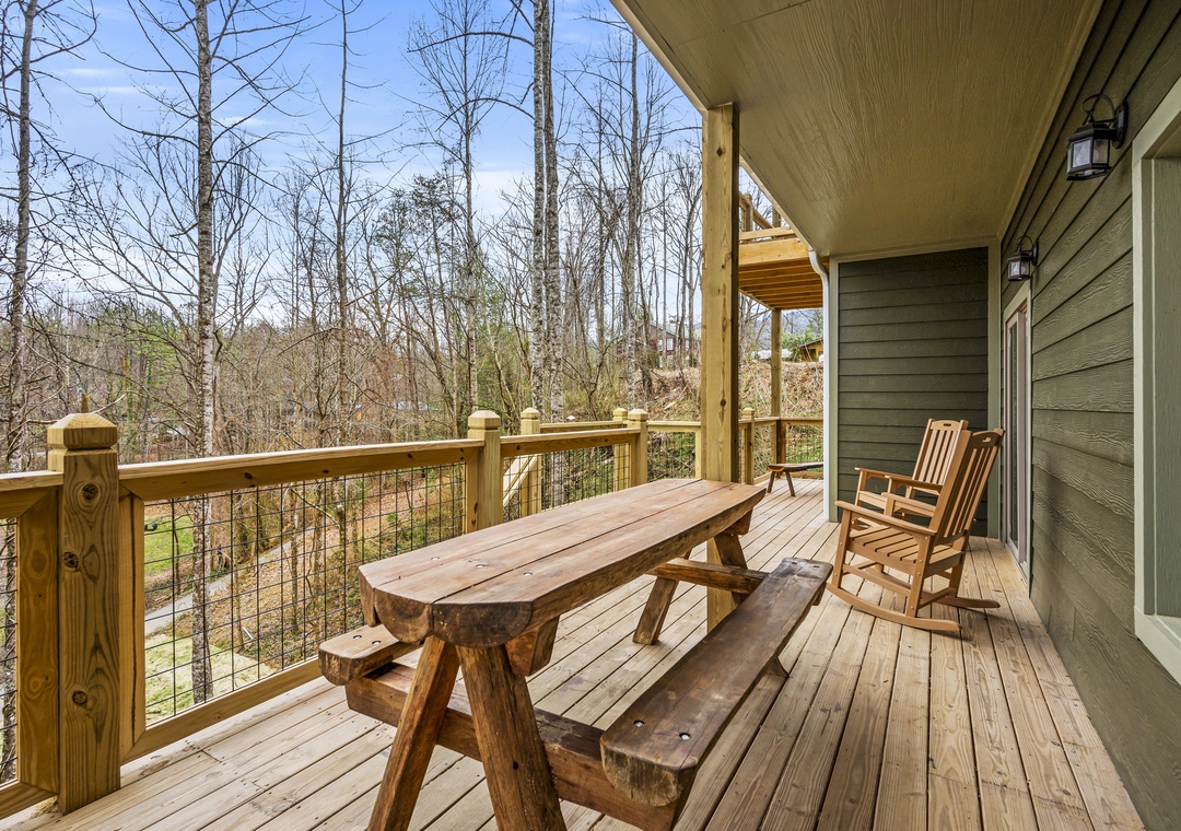 The fully-equipped kitchen is a chef's delight, equipped with all the amenities you need to whip up gourmet delights or just simple comfort food. Complete with a full-sized refrigerator, dishwasher, stove, microwave, and other kitchen appliances perfect for making breakfast, lunch, or dinner throughout your stay! All pots, pans, glasses, plates, silverware, etc. are also there for you! Gather around the rustic dining table where every meal becomes a celebration of good food and great company. You may also step onto the deck and find a sturdy log picnic table that offers the perfect setting for enjoying al fresco meals amidst the natural beauty of the Smokies.